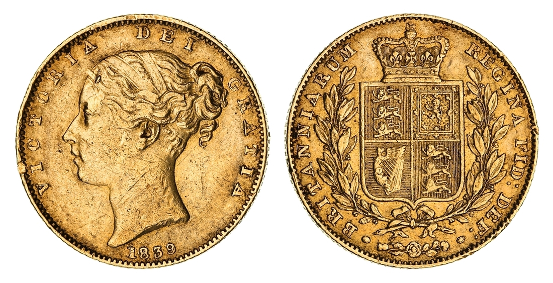 (g) Victoria (1837-1901), 'Shieldback' Sovereign, 1839, first young head left, raised W.W. on truncation, rev. crowned 'normal' shield in wreath, edge milled, 7.93g, 6h (EGC II, 1058; Marsh 23; MCE 500; Bentley 400; Stratos -; S.3852), edge bruised, scratched through the truncation and with other surrounding bagmarks, very fine