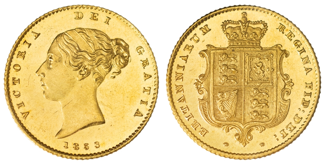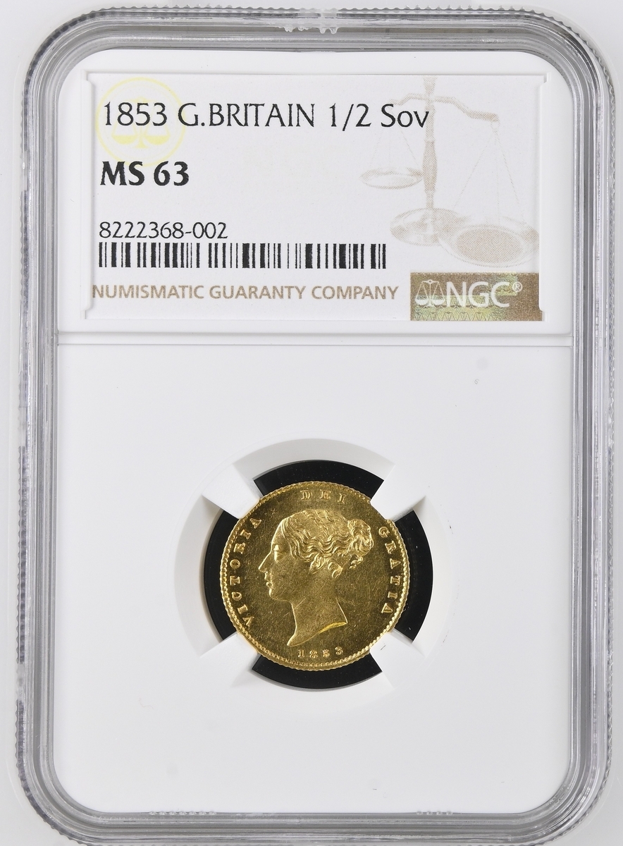 (g) NGC MS63 | Victoria (1837-1901), Half Sovereign, 1853, Type A1, 4.00g, 7h (EGC 1248; MCE 575; Marsh 427; S.3859), lightly toned with underlying brilliance, just a few tiny hairline and surface marks, otherwise good extremely fine, hard to find a better example with wonderful eye appeal, in NGC holder, graded MS63 (Cert. #8222368-002)