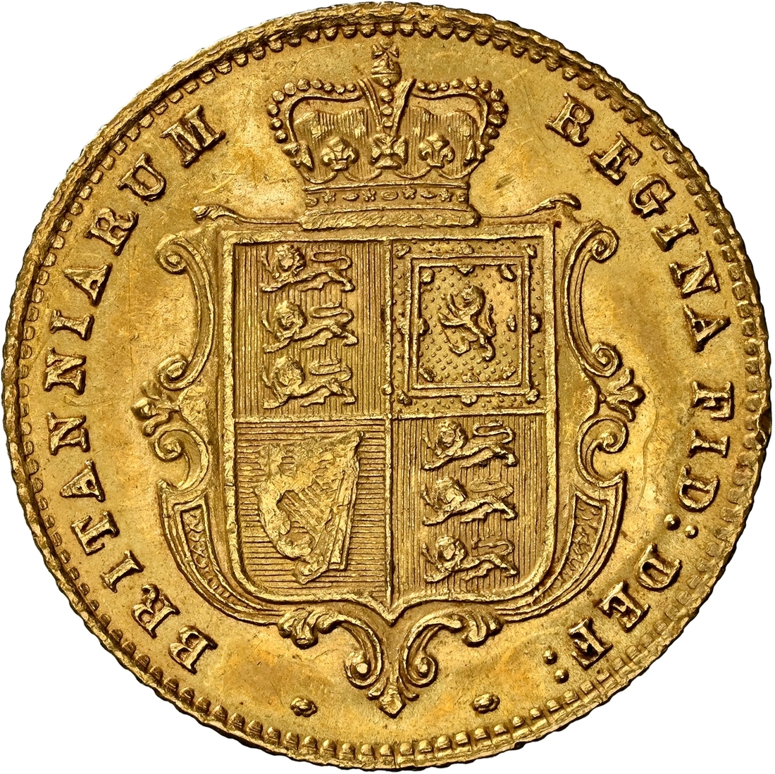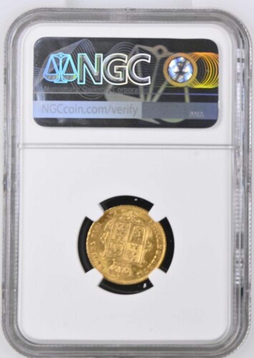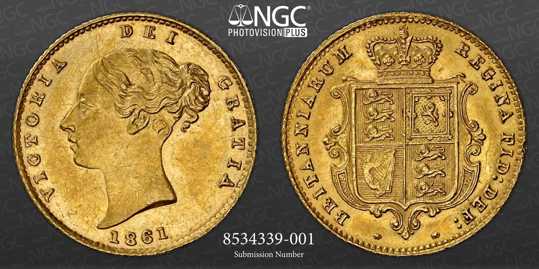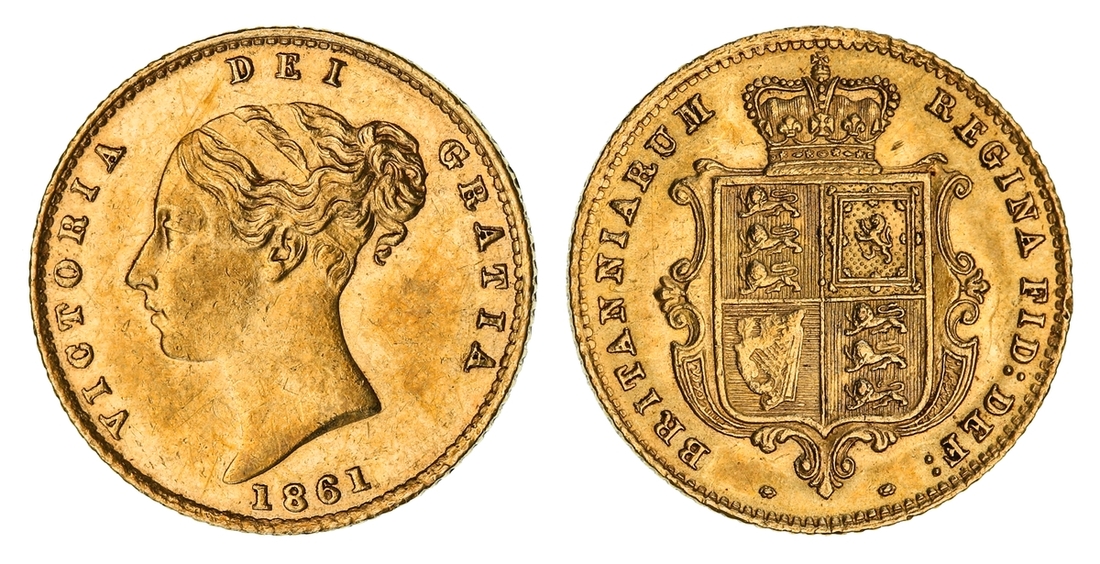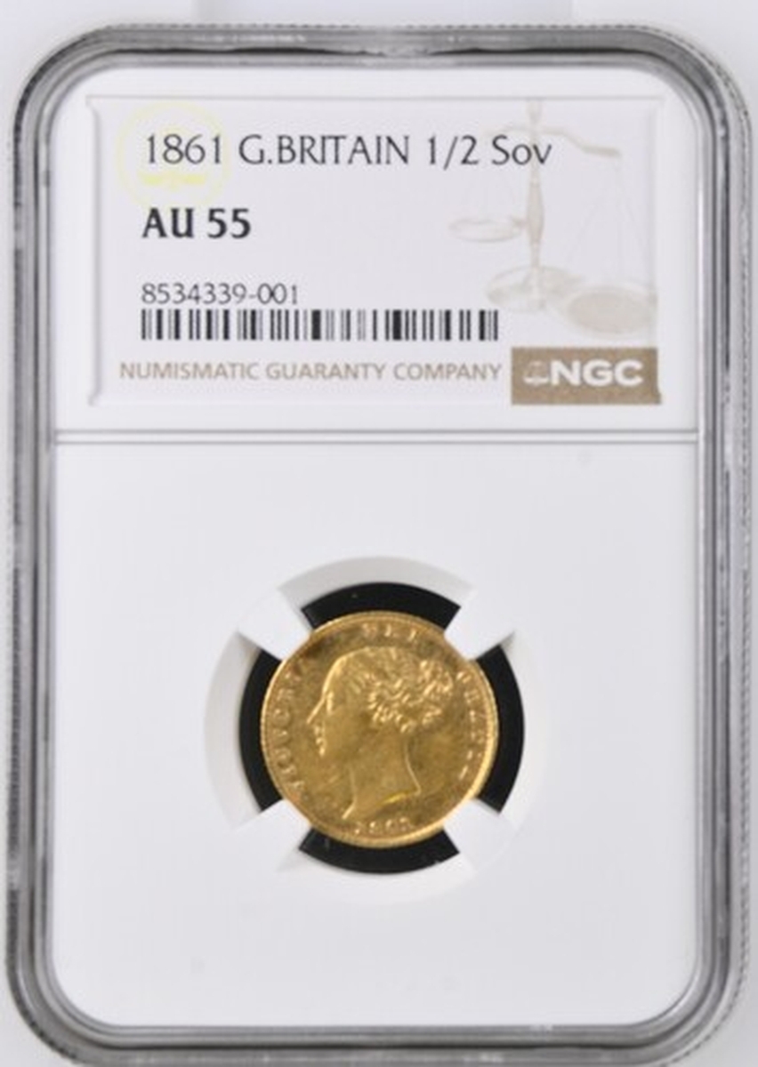 (x) NGC AU55 | Victoria (1837-1901), 'Young Head' Half-Sovereign, 1861, Type A2, second larger 'young' head left, rev. crowned shield, edge milled, 3.98g, 6h (MCE 583; EGC II, 1259; Marsh 435; S.3859A), lightly contact marked and with hairline scratches, with lustre, good very fine, in NGC holder, graded AU55 (Cert. #8534339-001)