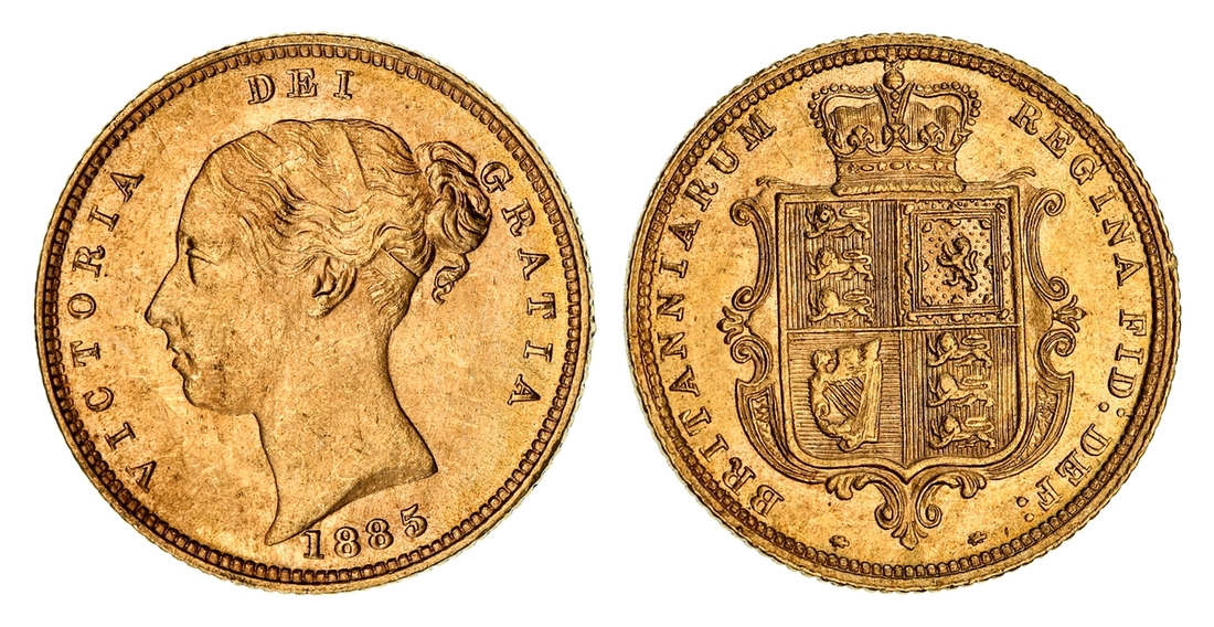 (g) NGC MS62 | Victoria (1837-1901), Half-Sovereign, 1885, London, Type A5, fifth young head left, rev. crowned shield, edge milled, 3.992g, 6h (Marsh 459; EGC II, 1292; S.3861), beautifully choice, much as struck, in NGC holder, graded MS62 (Cert. #8534334-010)