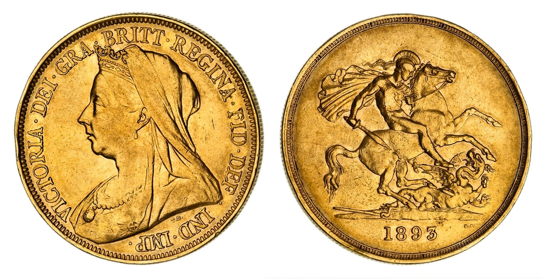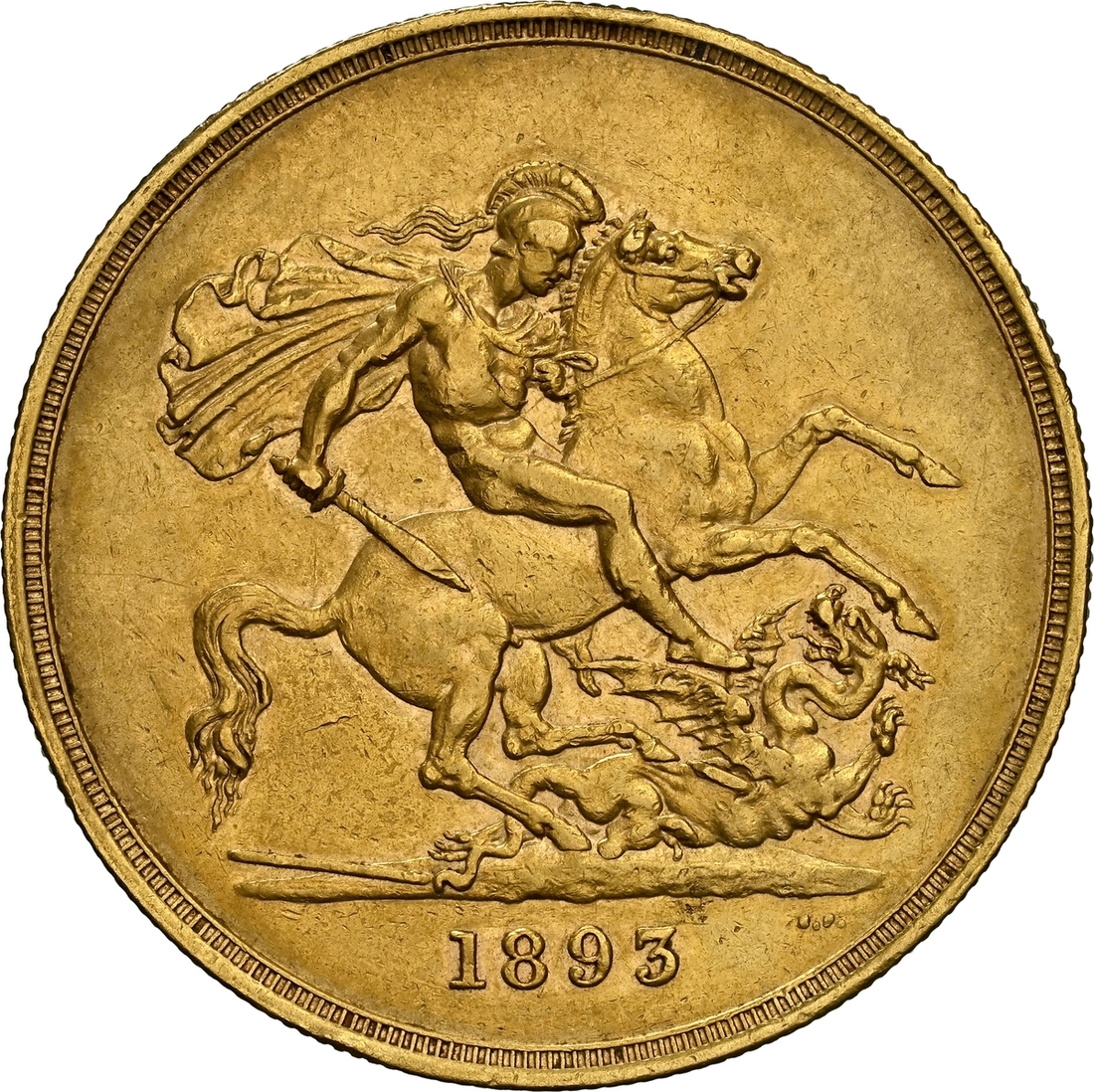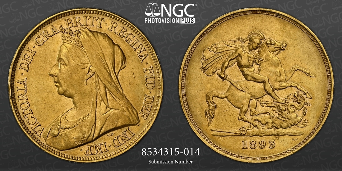 (g) NGC AU | Victoria (1837-1901), 'Old-Head' Five-Pounds, 1893, by Thomas Brock and Benedetto Pistrucci, veiled head left, rev. St. George and Dragon, edge milled, 39.910g, 12h (Stratos 205; MCE -; Hill F33; GH 116; S.3872), minor edge bruising, otherwise rubbed but residually lustrous, very fine, in NGC Black 'Pallas' holder, graded 'Almost Uncirculated' (Cert. #8534315-014)