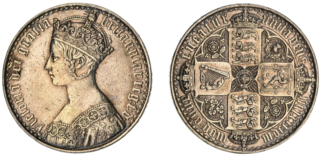 (x) Victoria (1837-1901), Pattern Proof 'Gothic' Crown, MDCCCXLVII [1847] UNDECIMO, by W. Wyon, crowned 'Gothic' bust left, W.W. below truncation, rev. crowned shields cruciform, national emblems in angles, downwards lettered edge, 28.26g, 6h (ESC 2571; Bull 288; S.3883), heavily cleaned and with some smoothing to contact marked fields, previously mounted and smoothed to edge, nonetheless subsequently retoned, strict very fine