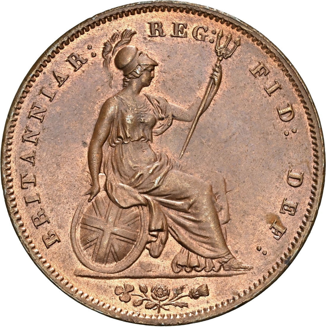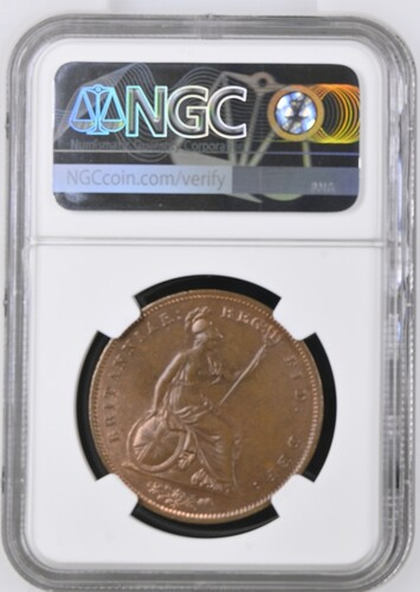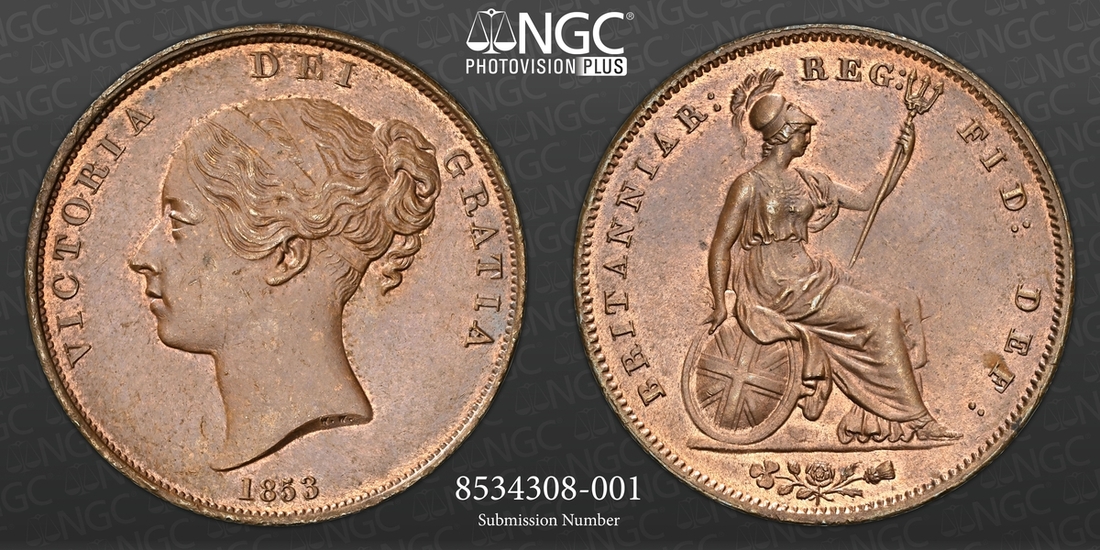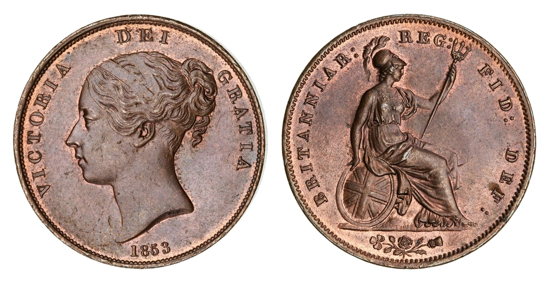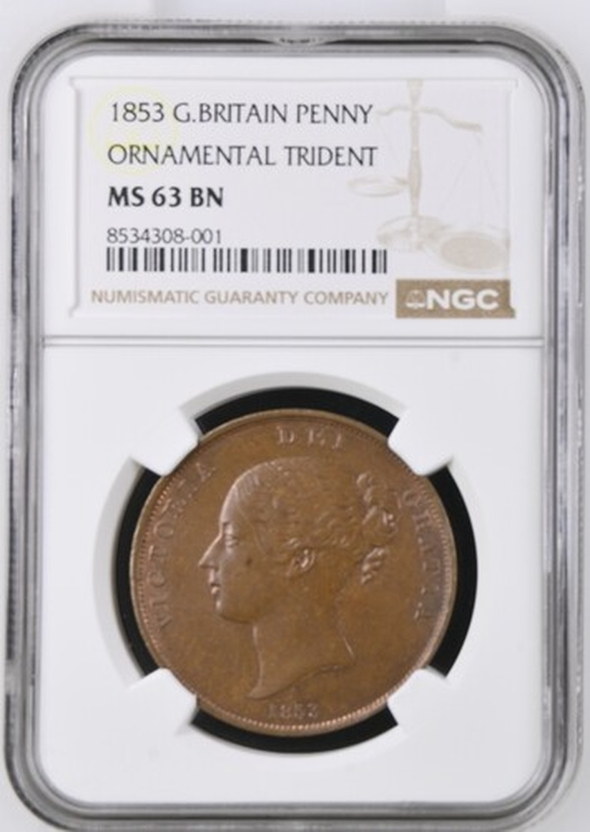 (x) NGC MS63 BN | Victoria (1837-1901), Penny, 1853 OT, young filleted head left, W.W. incuse on truncation, rev. Britannia seated right, with ornamental trident, plain edge, 18.68g, 12h (BMC [Peck 1500; S.3948), some light and minor contact marks to otherwise pleasingly lustrous surfaces, flashes of mint red to red-brown fields, good extremely fine, in NGC holder, graded MS63 BROWN (Cert. #8534308-001)