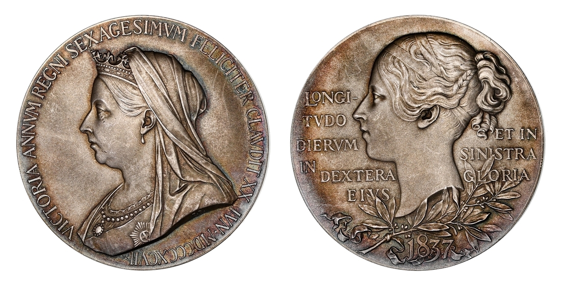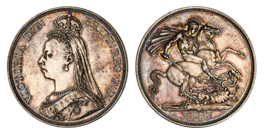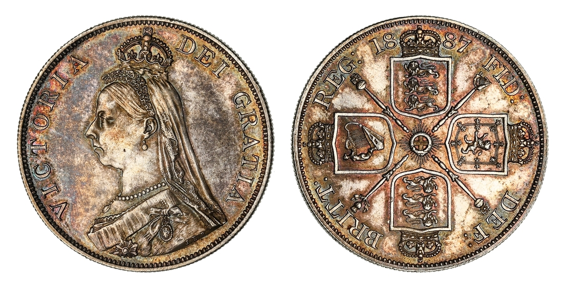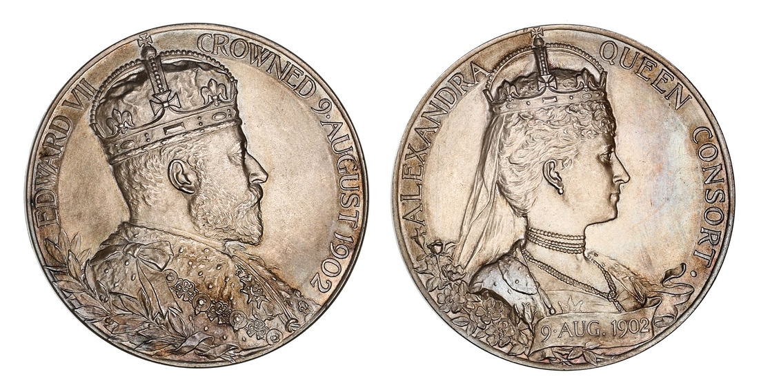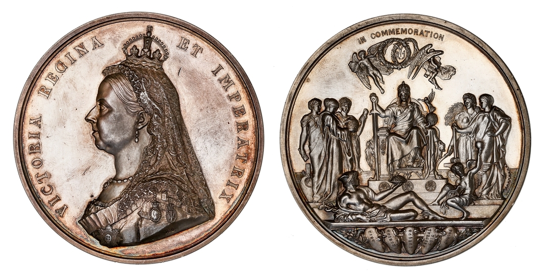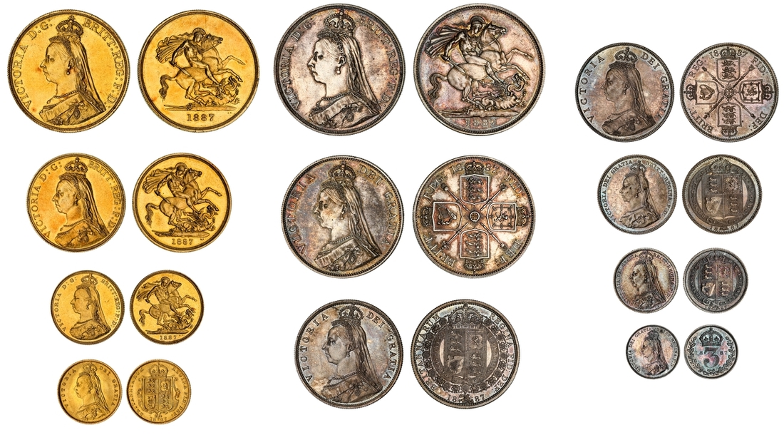 (g) Exclusive Royal Presentation Set for Queen Victoria's Golden and Diamond Jubilees and the Coronation of His Majesty King Edward VII (14) | including, 'Golden Jubilee', Currency Specimen Set, 1887 (11), Five-Pounds to Half-Sovereign, Crown to Threepence (S.PS5), Five-Pounds to Sovereign struck from early dies and thus with a brilliance to fields, yet all with heavy hairlines, more so to higher two denominations, the Half-Sovereign with a pleasing lustre, extremely fine to as struck, the Crown and Double-Florin with softness to portraits, otherwise toned and flashy lustre to reverse, extremely fine, the rest with pleasing blue toning to lustrous and frosty-silver surfaces, much as struck; and Golden Jubilee of Victoria, Official 'Large' AR Medal, by J. E. Boehm for the Royal Mint, 1887, VICTORIA REGINA ET IMPERATRIX, crowned and veiled bust left, rev. IN . COMMEMORATION, enthroned figure of Empire, facing, flanked by standing figures of Science, Letters and Art, opposite those of Industry and Agriculture. At their feet, below Empire, are Mercury, reclining, and Time. Above, two cherubs displaying shields, five linked shields, inscribed ASIA AMERICA EUROPE AUSTRALASIA and AFRICA in exergue, 221.00g, 77mm (Eimer 1733; BHM 3219), some dragged pinmarks and hairlines to fields, touch of softness upon highest points of portrait, otherwise brilliant and with a hint of tone to the peripheries, good extremely fine; and Diamond Jubilee of Victoria, Official 'Large' AR Medal, 1897, by G. W. de Saulles after T. Brock for the Royal Mint, VICTORIA ANNVM REGNI SEXAGESIMVM FELICITER CLADVIT XX, draped and diademed bust left, rev. LONGITVDO SIERVM ET IN SINISTRA EIVS GLORIA, young head left, dividing inscription, 1837 below, edge plain, 56mm, 84.70g, (Eimer 1817b; BHM 3506), much as struck; and Coronation of Edward VII, Official 'Large' AR Coronation Medal, 1902 by G. W. de Saulles for the Royal Mint, EDWARD VII CROWNED 9. AUGUST 1902, crowned and draped bust right, rev. ALEXANDRA QUEEN CONSORT., crowned and draped bust right, below on banner 9. AUG. 1902, 85.98g, 56mm (Eimer 1871; BHM 3737), minor pinmark traces to reverse, otherwise much as struck. Uniquely presented in custom-made contemporary red leather case, with signs of use to exterior otherwise in full working order (14)