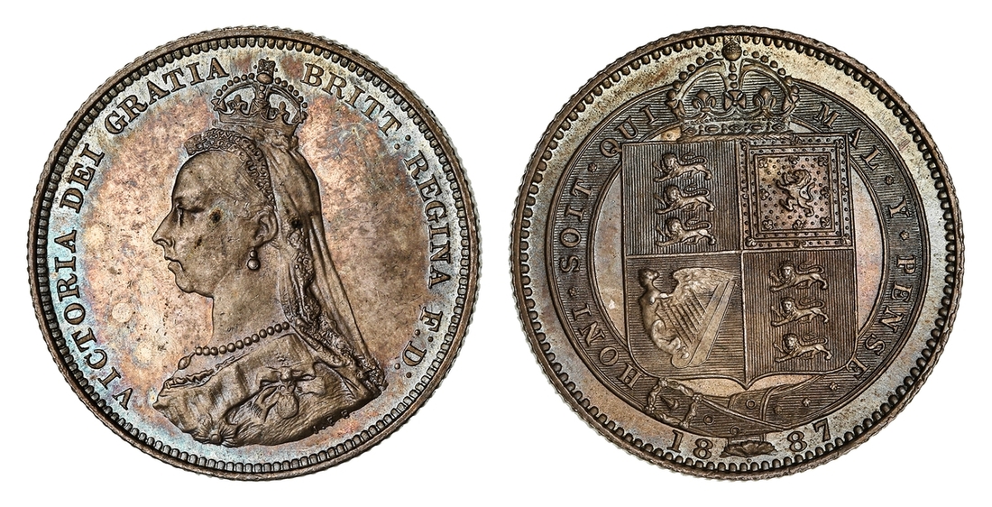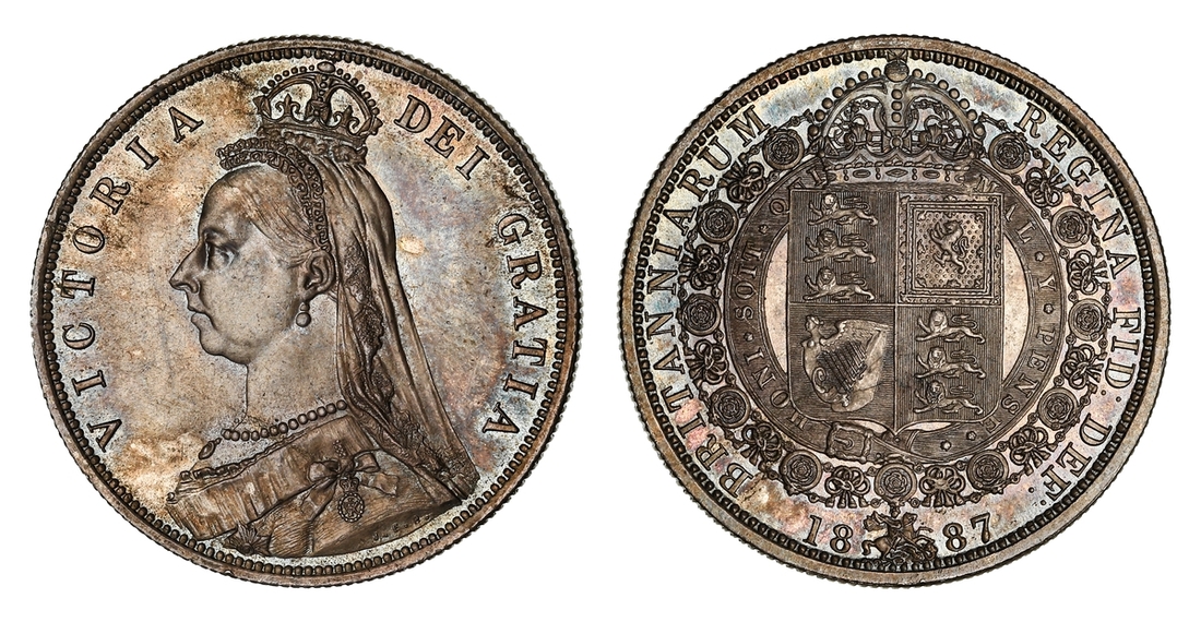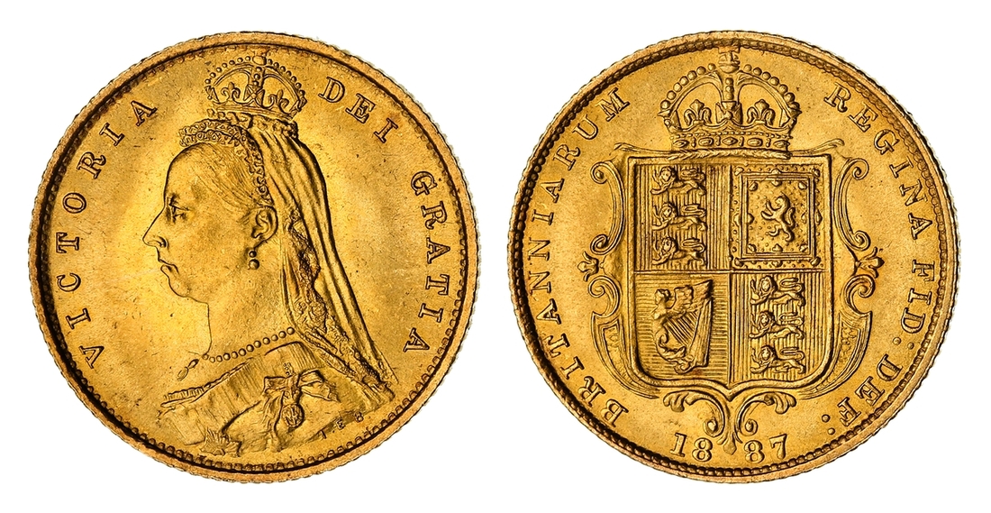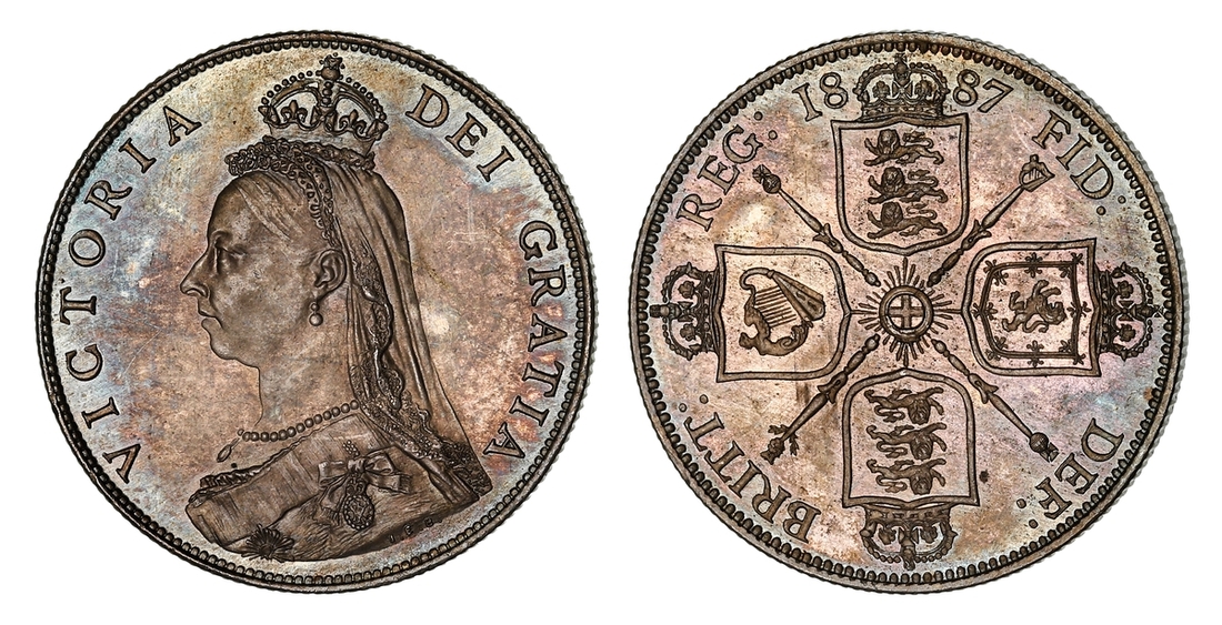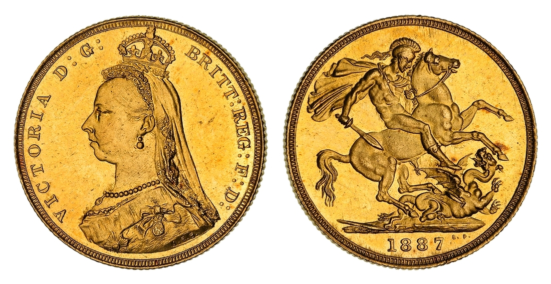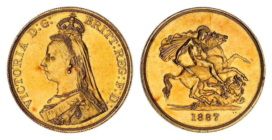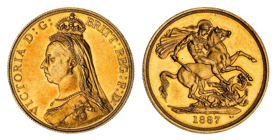 (g) Exclusive Royal Presentation Set for Queen Victoria's Golden and Diamond Jubilees and the Coronation of His Majesty King Edward VII (14) | including, 'Golden Jubilee', Currency Specimen Set, 1887 (11), Five-Pounds to Half-Sovereign, Crown to Threepence (S.PS5), Five-Pounds to Sovereign struck from early dies and thus with a brilliance to fields, yet all with heavy hairlines, more so to higher two denominations, the Half-Sovereign with a pleasing lustre, extremely fine to as struck, the Crown and Double-Florin with softness to portraits, otherwise toned and flashy lustre to reverse, extremely fine, the rest with pleasing blue toning to lustrous and frosty-silver surfaces, much as struck; and Golden Jubilee of Victoria, Official 'Large' AR Medal, by J. E. Boehm for the Royal Mint, 1887, VICTORIA REGINA ET IMPERATRIX, crowned and veiled bust left, rev. IN . COMMEMORATION, enthroned figure of Empire, facing, flanked by standing figures of Science, Letters and Art, opposite those of Industry and Agriculture. At their feet, below Empire, are Mercury, reclining, and Time. Above, two cherubs displaying shields, five linked shields, inscribed ASIA AMERICA EUROPE AUSTRALASIA and AFRICA in exergue, 221.00g, 77mm (Eimer 1733; BHM 3219), some dragged pinmarks and hairlines to fields, touch of softness upon highest points of portrait, otherwise brilliant and with a hint of tone to the peripheries, good extremely fine; and Diamond Jubilee of Victoria, Official 'Large' AR Medal, 1897, by G. W. de Saulles after T. Brock for the Royal Mint, VICTORIA ANNVM REGNI SEXAGESIMVM FELICITER CLADVIT XX, draped and diademed bust left, rev. LONGITVDO SIERVM ET IN SINISTRA EIVS GLORIA, young head left, dividing inscription, 1837 below, edge plain, 56mm, 84.70g, (Eimer 1817b; BHM 3506), much as struck; and Coronation of Edward VII, Official 'Large' AR Coronation Medal, 1902 by G. W. de Saulles for the Royal Mint, EDWARD VII CROWNED 9. AUGUST 1902, crowned and draped bust right, rev. ALEXANDRA QUEEN CONSORT., crowned and draped bust right, below on banner 9. AUG. 1902, 85.98g, 56mm (Eimer 1871; BHM 3737), minor pinmark traces to reverse, otherwise much as struck. Uniquely presented in custom-made contemporary red leather case, with signs of use to exterior otherwise in full working order (14)