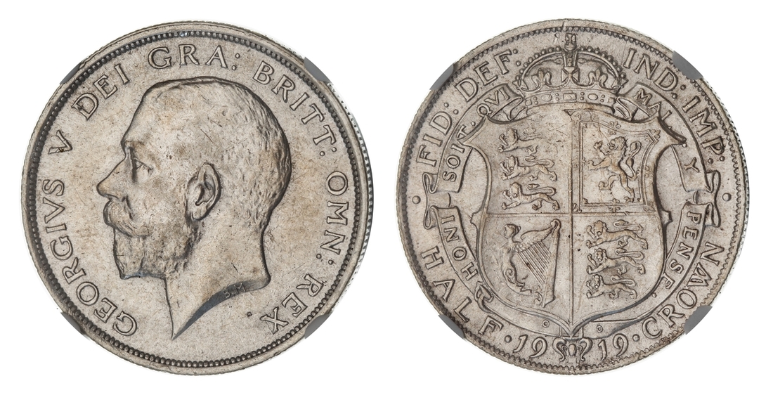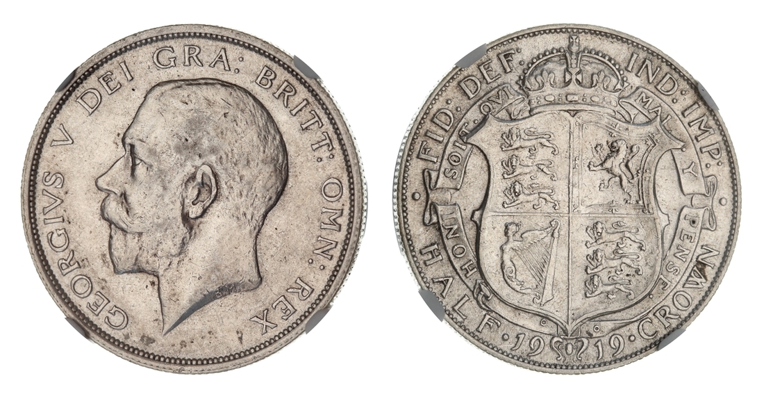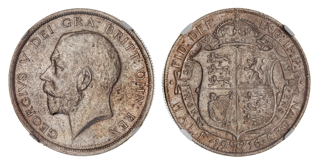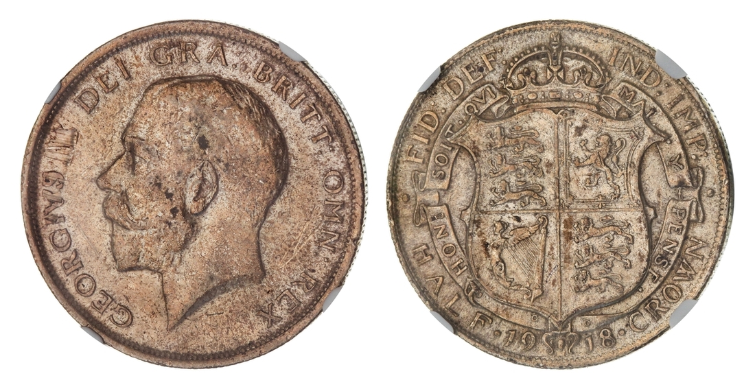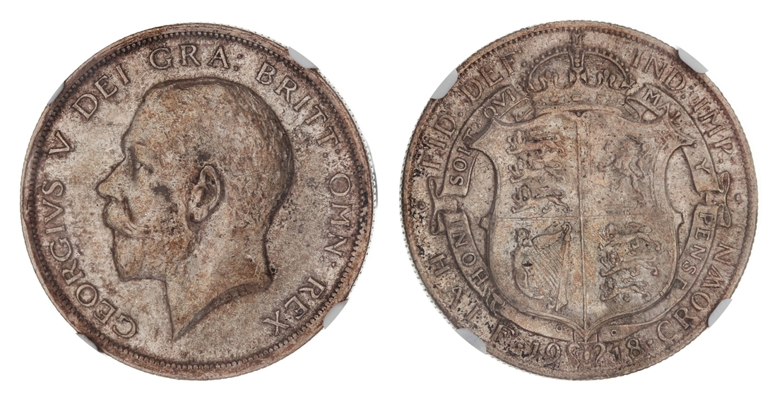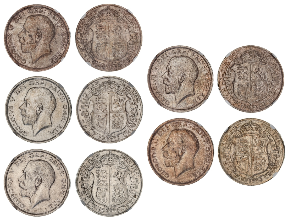 NGC AU | George V (1910-1936), Halfcrown, 1916, bare head left, rev. crowned shield in Garter, edge milled, 12h (ESC 763; Bull 3715; S.4011), light bagmarking and with softness to the hair, otherwise lustrous and with patchy-speckled toning, very fine, in NGC holder, graded AU55 (Cert. #8464067-030); AU50 | Halfcrown, 1918, as before, edge milled, 12h (ESC 766; Bull 3718; S.4011), light bagmarking and with softness to the hair, otherwise lustrous and with patchy-speckled toning, very fine, in NGC holder, graded AU50 (Cert. #8464067-037); NGC AU | Halfcrown, 1918, as before, edge milled, 12h (ESC 766; Bull 3718; S.4011), heavily bagmarked and with deep scratches to obverse, with a hint of lustre, about very fine, in NGC holder, graded AU Details ~ Obv. Damage (Cert. #8464067-032); NGC AU55 | Halfcrown, 1919, as before, edge milled, 11h (ESC 766; Bull 3718; S.4011), light bagmarking and softness to the hair, otherwise with a pleasing lustre to peripheries, very fine, in NGC holder, graded AU55 (Cert. #8464067-035); NGC AU58 | Halfcrown, 1919, as before, edge milled, 12h (ESC 766; Bull 3718; S.4011), light scattering of contact marks and some softness to portrait, otherwise with a pleasing mint lustre, nearing extremely fine, in NGC holder, graded AU58 (Cert. #8464067-036) (5)
