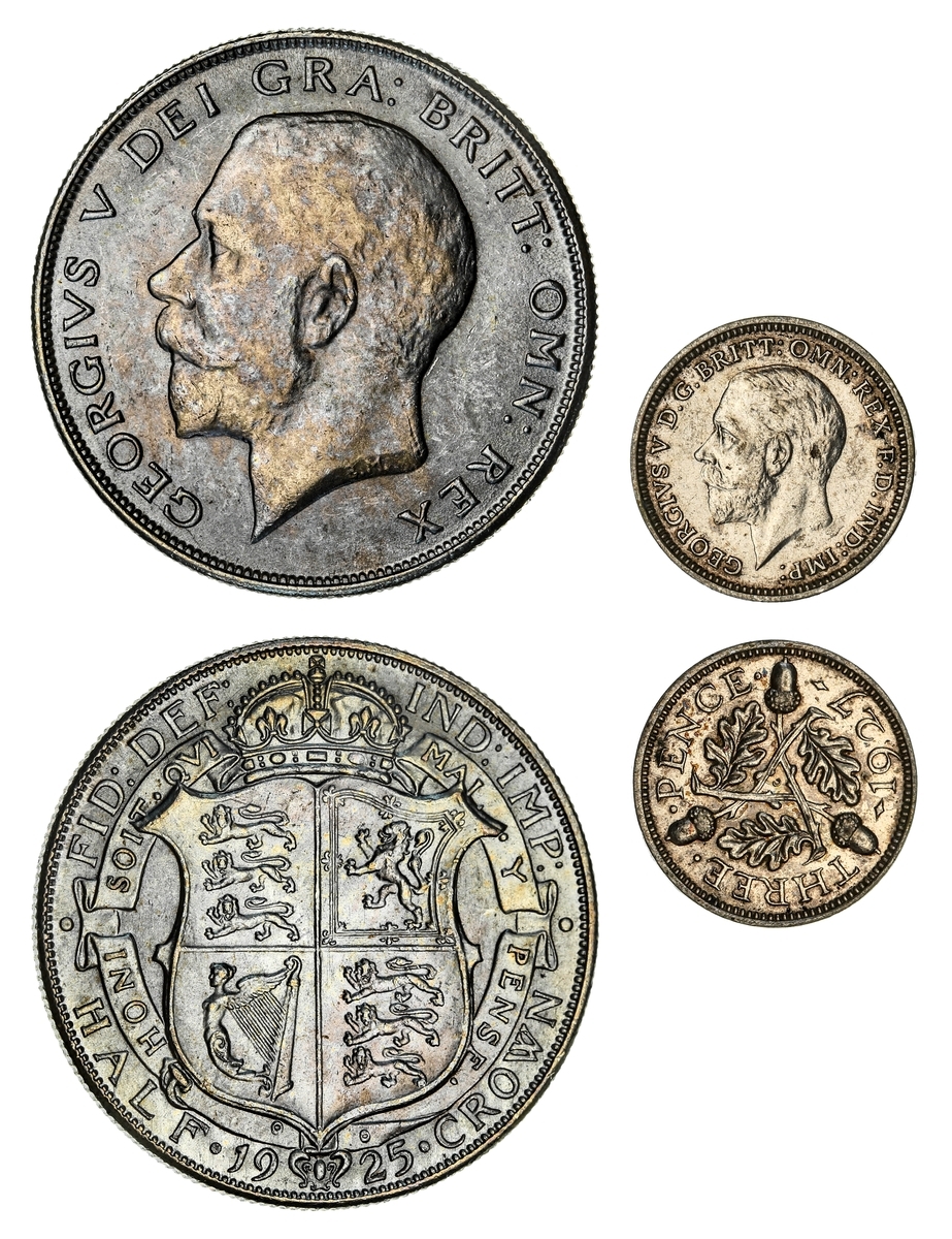 George V (1910-1936), Halfcrown, 1925, bare head left, rev. crowned shield in Garter, milled edge, 14.15g, 12h (Bull 3727; ESC 772; S.4021A), rare, lightly toned, lustrous, uncirculated; and also, Proof Threepence, 1927, bare head left, rev. three oak springs, plain edge, 1.45g, 12h (Bull 3946; ESC 2141; S.4042), some dark spots but otherwise uncirculated (2)