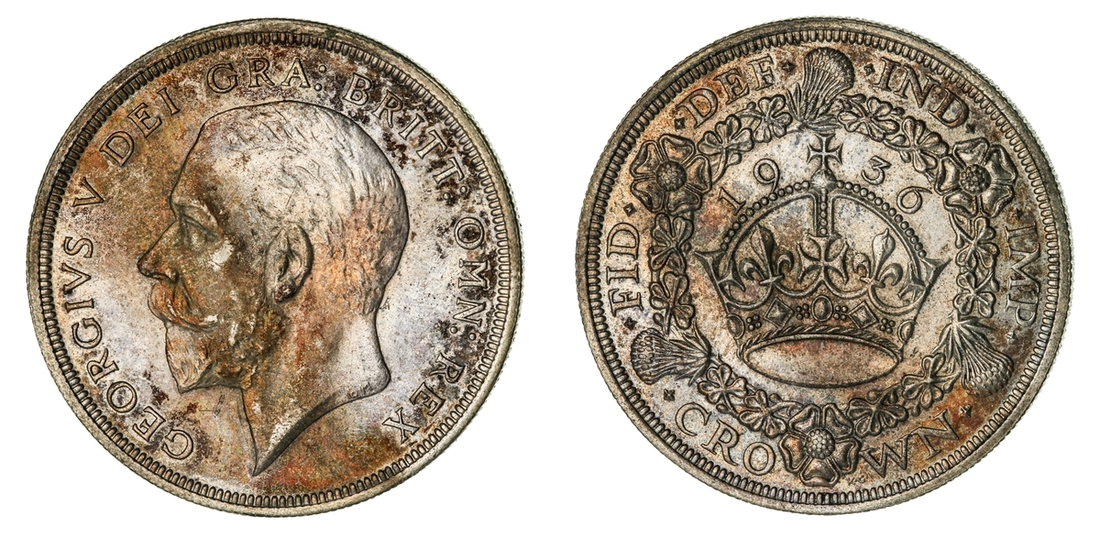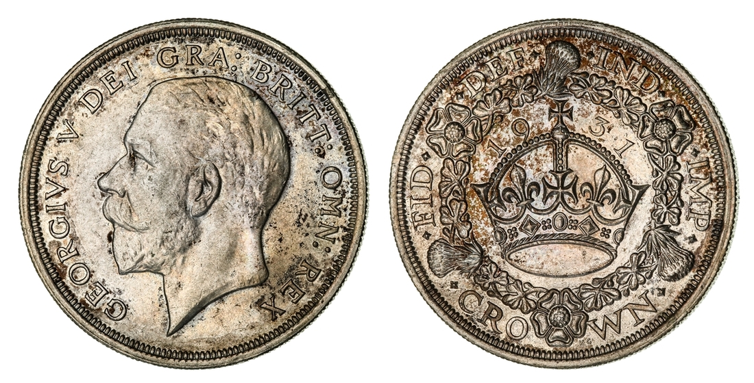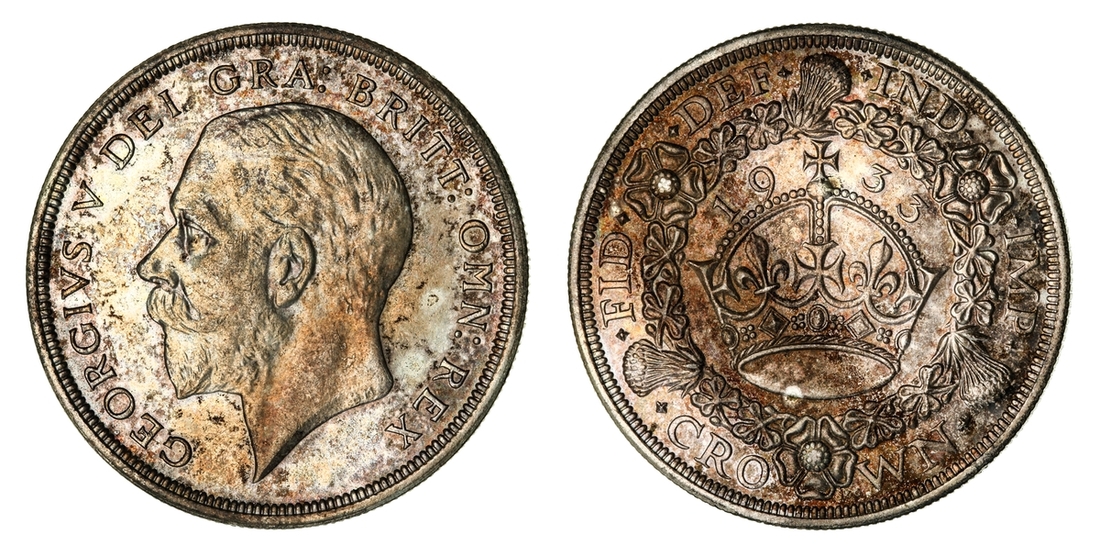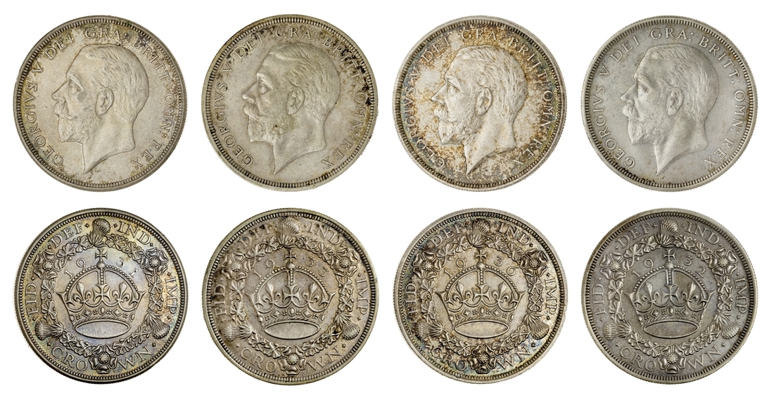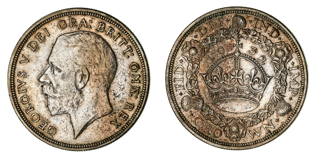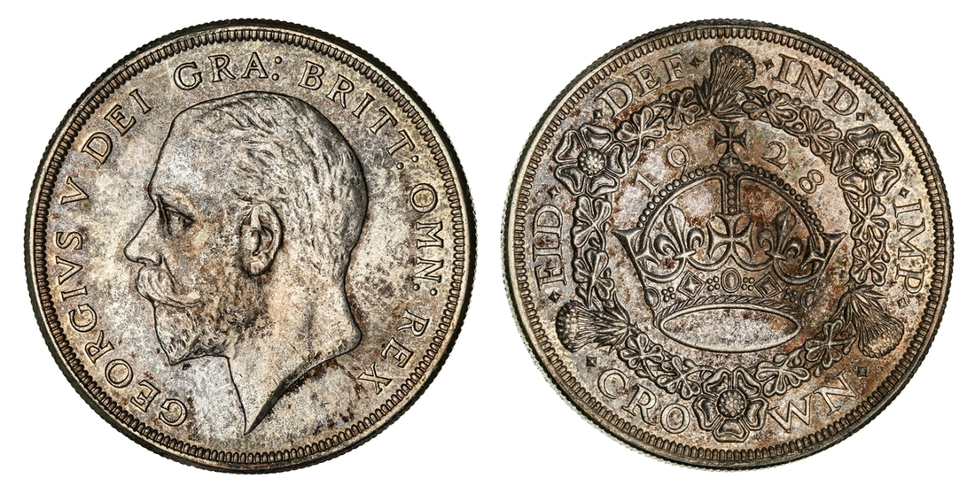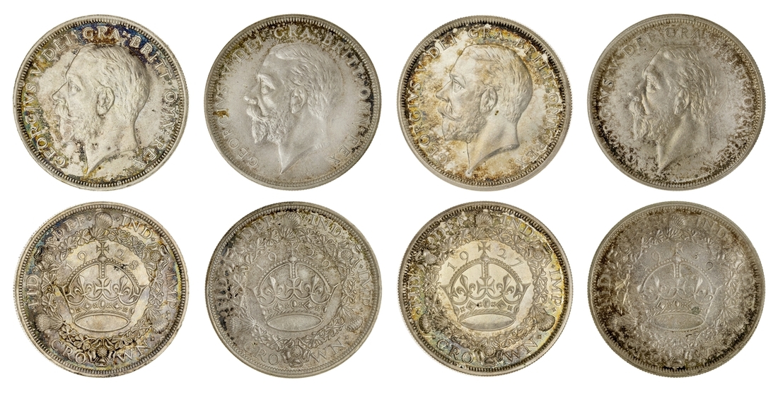 (x) George V (1911-1936), Set of Christmas 'Wreath' Crowns, 1927-1936, including, 1927 Proof, bare head left, rev. crown within wreath, edge milled, 28.37g, 12h (ESC 367; Bull 3631), mottled tone to peripheries of brilliant fields, much as struck, one of only 15,030 struck; also, 1928, edge milled, 28.31g, 12h (ESC 368; Bull 3633), lightly wiped and bagmarked, otherwise lustrous, extremely fine, one of only 9,034 struck; and, 1929, edge milled, 28.21g, 1h (ESC 369; Bull 3636), lightly rubbed but lustrous, almost extremely fine, one of only 4,994 struck; and, 1930, edge milled, 28.23g, 12h (ESC 370; Bull 3638), lightly bagmarked with a mottled tone, lustrous, extremely fine, one of only 4,847 struck; and, 1931, edge milled, 28.22g, 12h (ESC 371; Bull 3639), rubbed and lightly contact marked, faintly wiped but retoned, a really bold very fine to almost extremely fine, one of only 4,056 struck; also, 1932, edge milled, 28.24g, 12h (ESC 372; Bull 3641), lightly cleaned and rubbed, otherwise residually lustrous, a pleasingly bold very fine, a scarcer year, one of only 2,395 struck; also, 1933, edge milled, 28.14g, 12h (ESC 373; Bull 3644), lightly cleaned, rubbed and bagmarked, the reverse residually lustrous, a pleasingly bold very fine, one of only 7,132 struck; also, 1934, as before, edge milled, 28.28g*, 12h (ESC 374; Bull 3647; S.4036), rubbed and toned, about very fine, the key date of series, with famously only 932 struck; lastly, 1936, struck Posthumously under King Edward VIII, edge milled, 28.25g, 12h (ESC 381; Bull 3694; S.4036), lightly bagmarked with a mottled tone, lustrous, extremely fine, a scarce and desirable date, one of only 2,473 struck, with custom 'Spink & Son' fitted Presentation Case (9)