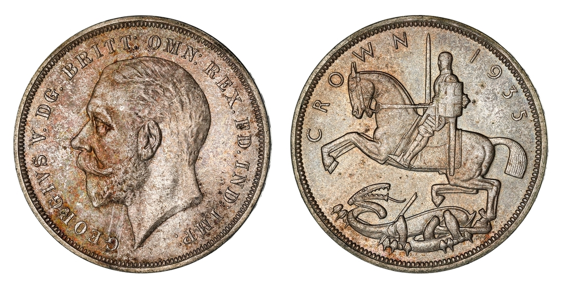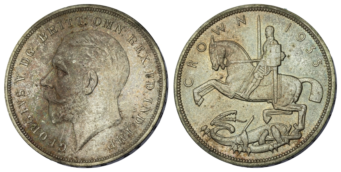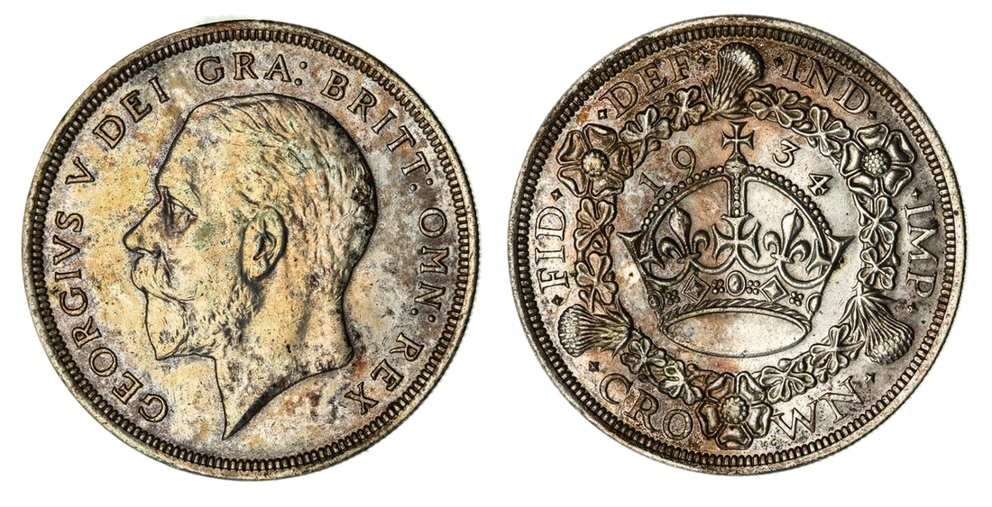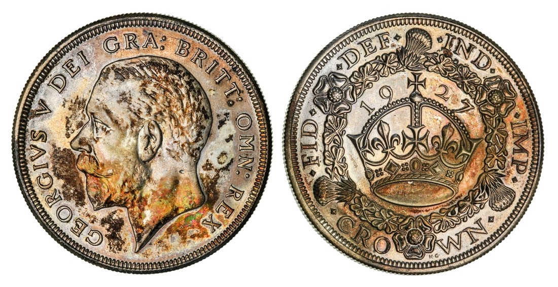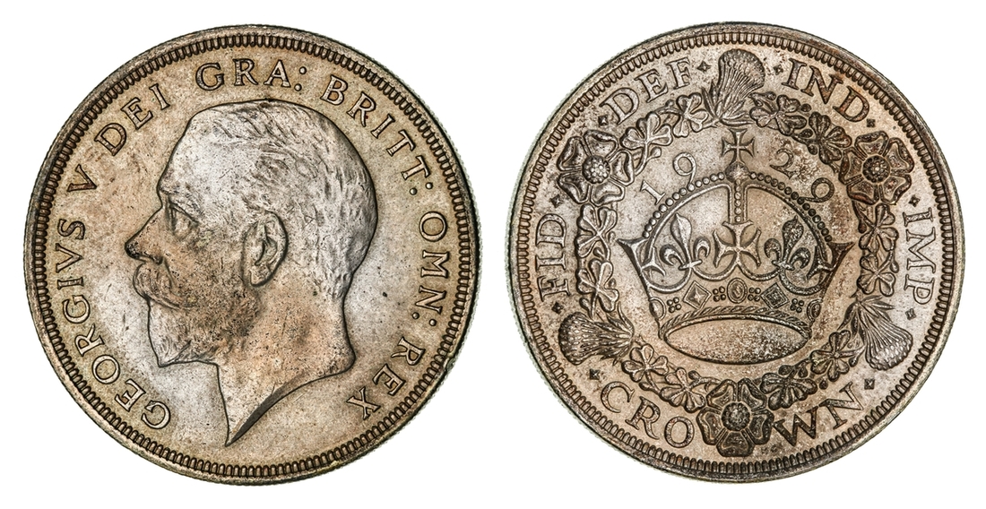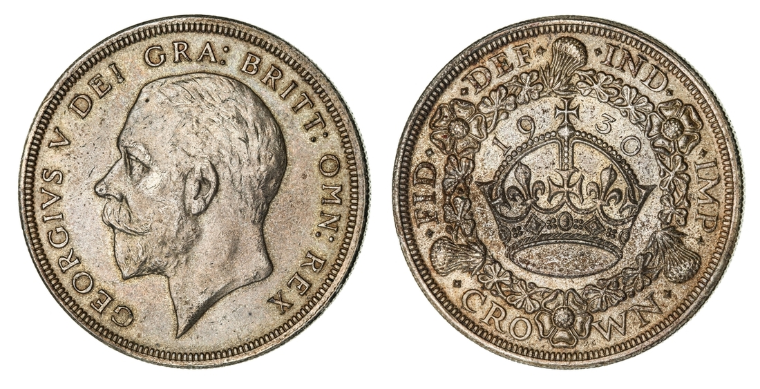 (x) George V (1911-1936), Set of Christmas 'Wreath' Crowns, 1927-1936, including, 1927 Proof, bare head left, rev. crown within wreath, edge milled, 28.37g, 12h (ESC 367; Bull 3631), mottled tone to peripheries of brilliant fields, much as struck, one of only 15,030 struck; also, 1928, edge milled, 28.31g, 12h (ESC 368; Bull 3633), lightly wiped and bagmarked, otherwise lustrous, extremely fine, one of only 9,034 struck; and, 1929, edge milled, 28.21g, 1h (ESC 369; Bull 3636), lightly rubbed but lustrous, almost extremely fine, one of only 4,994 struck; and, 1930, edge milled, 28.23g, 12h (ESC 370; Bull 3638), lightly bagmarked with a mottled tone, lustrous, extremely fine, one of only 4,847 struck; and, 1931, edge milled, 28.22g, 12h (ESC 371; Bull 3639), rubbed and lightly contact marked, faintly wiped but retoned, a really bold very fine to almost extremely fine, one of only 4,056 struck; also, 1932, edge milled, 28.24g, 12h (ESC 372; Bull 3641), lightly cleaned and rubbed, otherwise residually lustrous, a pleasingly bold very fine, a scarcer year, one of only 2,395 struck; also, 1933, edge milled, 28.14g, 12h (ESC 373; Bull 3644), lightly cleaned, rubbed and bagmarked, the reverse residually lustrous, a pleasingly bold very fine, one of only 7,132 struck; also, 1934, as before, edge milled, 28.28g*, 12h (ESC 374; Bull 3647; S.4036), rubbed and toned, about very fine, the key date of series, with famously only 932 struck; lastly, 1936, struck Posthumously under King Edward VIII, edge milled, 28.25g, 12h (ESC 381; Bull 3694; S.4036), lightly bagmarked with a mottled tone, lustrous, extremely fine, a scarce and desirable date, one of only 2,473 struck, with custom 'Spink & Son' fitted Presentation Case (9)