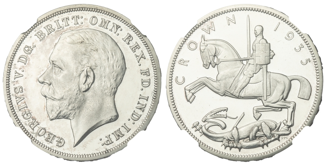 NGC PF62 UCAM | George V (1910-1936), Commemorative Silver Jubilee 'Rocking Horse' Specimen Proof, 1935 XXV, in .925 Silver, by B Mackennal and P Metcalfe, bare head left, rev. St. George and Dragon left, in Art Deco styling, raised edge lettering in correct alignment, 28.32g, 12h (ESC 378; Bull 3655; S.4050), light cabinet friction across brilliant fields, the devices with compelling cameo definition, a pleasing extremely fine; a resurgent modern collectable, in NGC holder, graded PROOF 62 ULTRA CAMEO (Cert. #6321331-001)