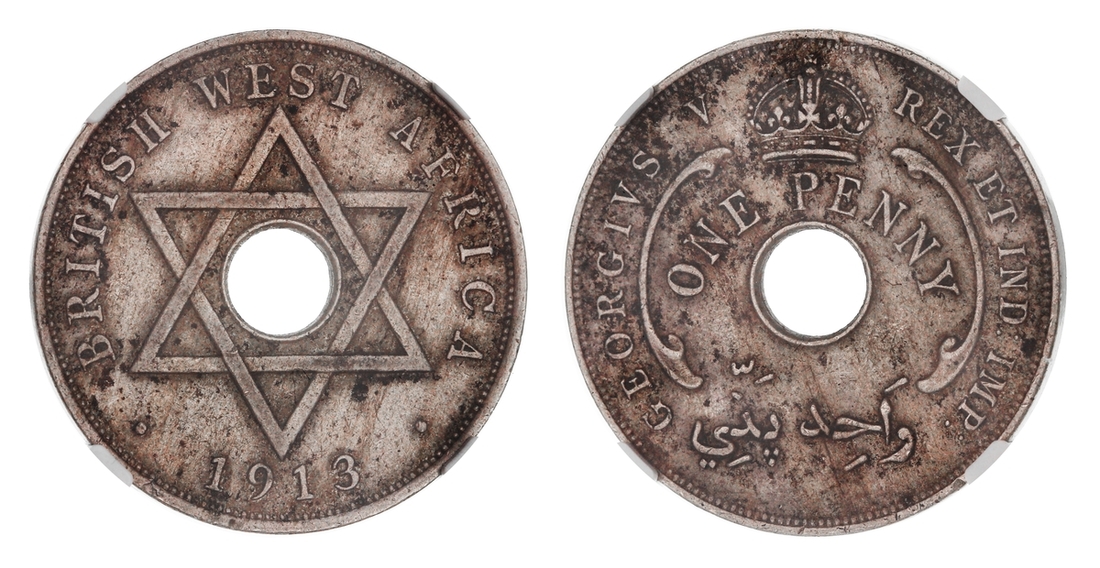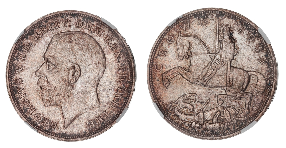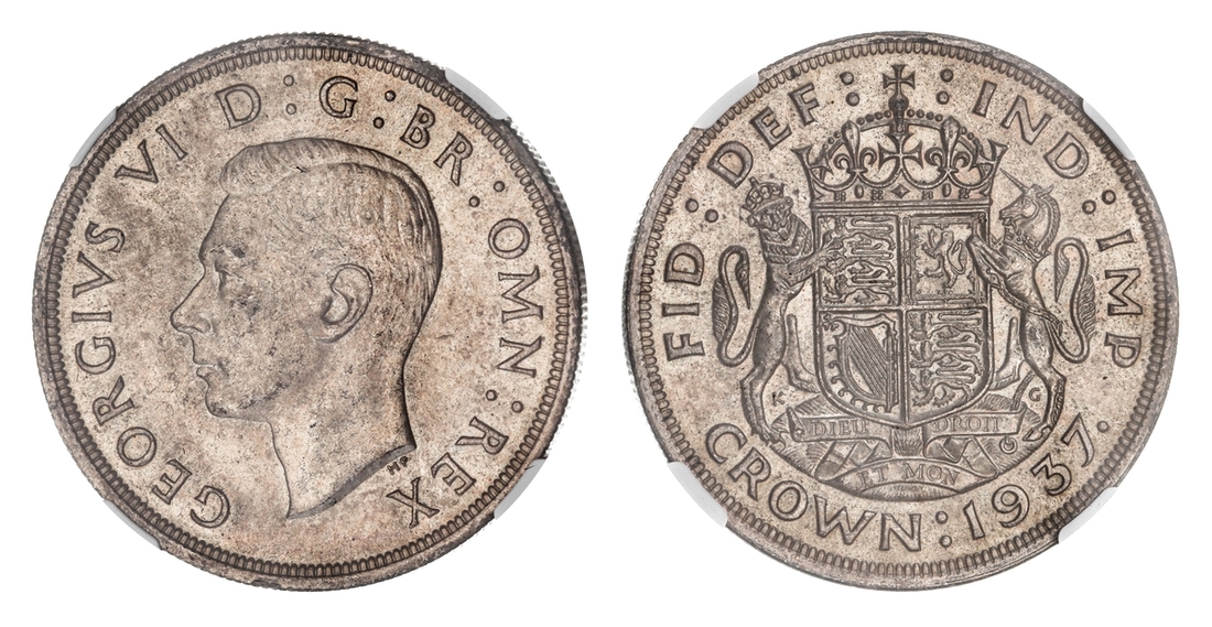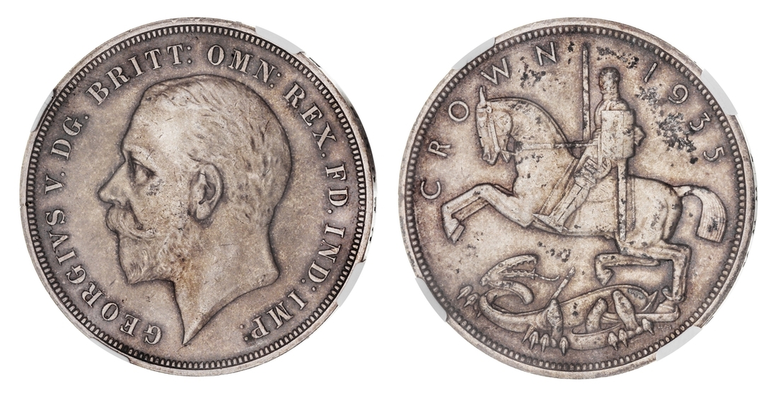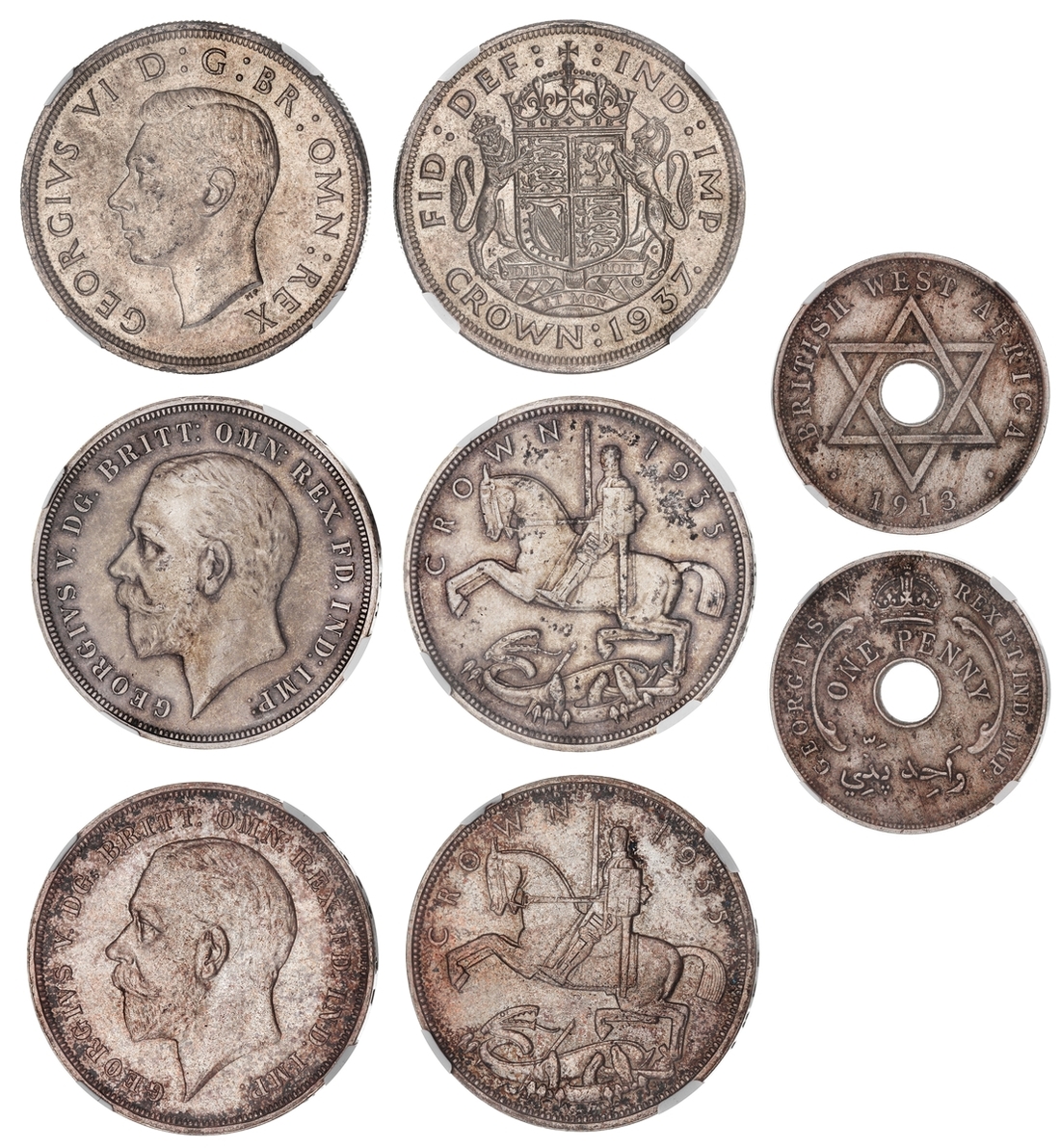 NGC AU | George V (1910-1936), 'Rocking Horse' Crown, 1935 XV, bare head left, rev. St George and Dragon, incuse lettered edge, 12h (ESC 375; Bull 3651; S.4048), light scattering of contact marks and irregularly toned surfaces, good very fine, in NGC holder, graded AU58 (Cert. #8464067-040); another, NGC AU | as before, incuse lettered edge, 12h (ESC 375; Bull 3651; S.4048), wiped and with speckled toning, good very fine, in NGC holder, graded AU Details ~ Cleaned (Cert. #8464067-033); and, NGC AU58 | George VI (1936-1952), 'Coronation' Crown, 1937, bare head left, rev. Royal Arms and supporters, edge milled, 12h (ESC 392; Bull 4020; S.4078), light contact marking, with speckled toning and a residual lustre, about extremely fine, in NGC holder, graded AU58 (Cert. #8464067-031); and British West Africa, George V (1910-1936), Penny, 1913, edge plain (KM 9), with irregular toning, very fine, in NGC holder, graded AU Details ~ Environmental Damage (Cert. #8464067-059) (4)