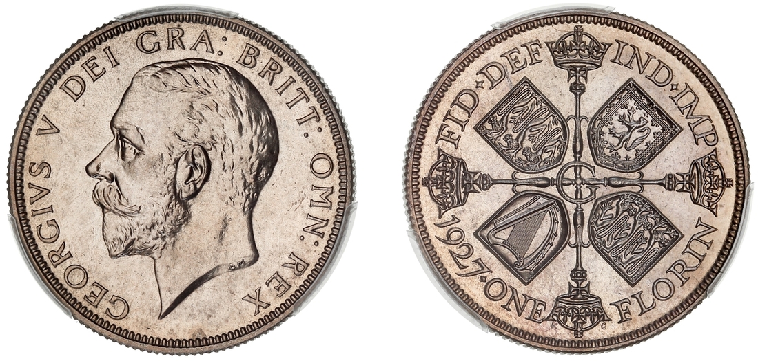 PCGS PR64 | George V (1910-1936), Proof Florin, 1927, bare head left, rev. four crowned shields in saltire, sceptres in angles (Bull 3779; ESC 947; S.4038), lustrous, extremely fine, scarce, in PCGS holder, graded PR64 (Cert. #34457732)