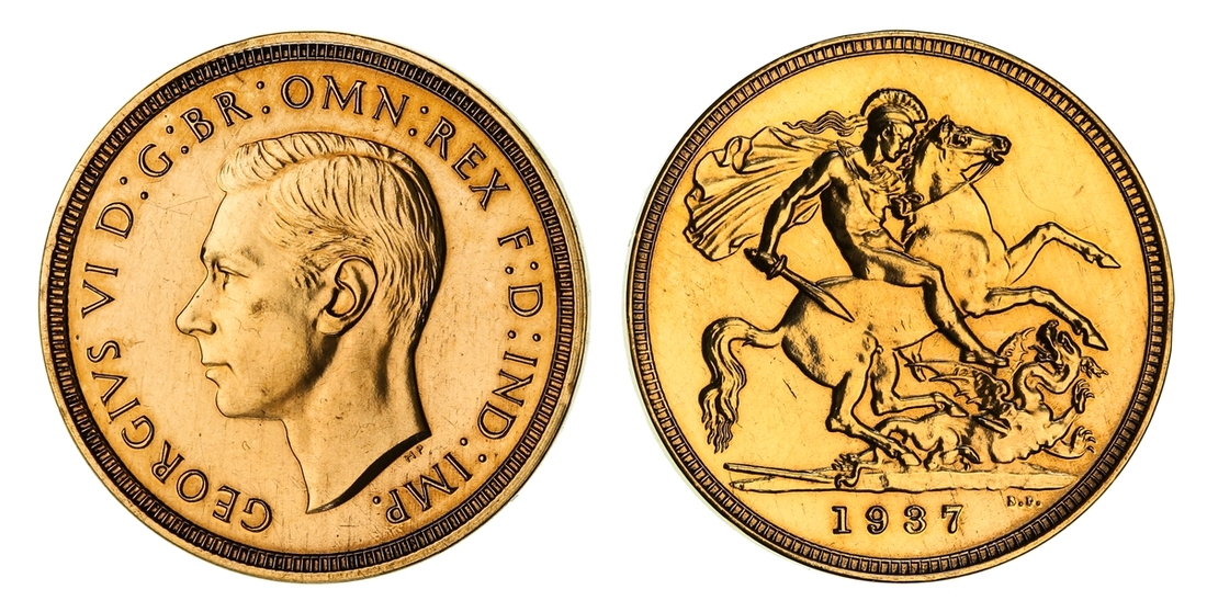 (g) George VI (1936-1952), Coronation 'Specimen' Proof Sovereign, 1937, bare head left, rev. St George and Dragon, edge plain, 7.99g, 12h (Marsh 296C; W&R 439; EGC II, 1461; S.4076), minor edge bruising and with hairlines, otherwise brilliant, extremely fine