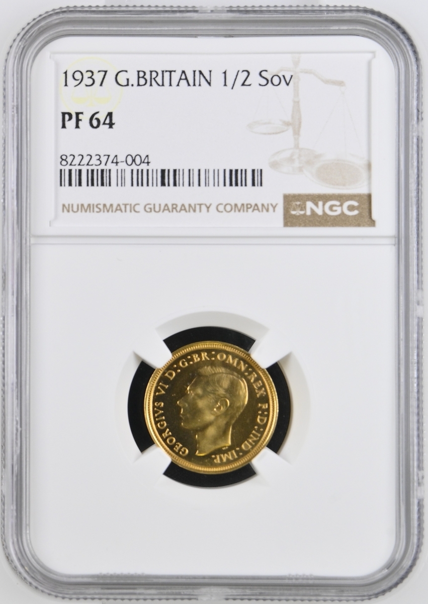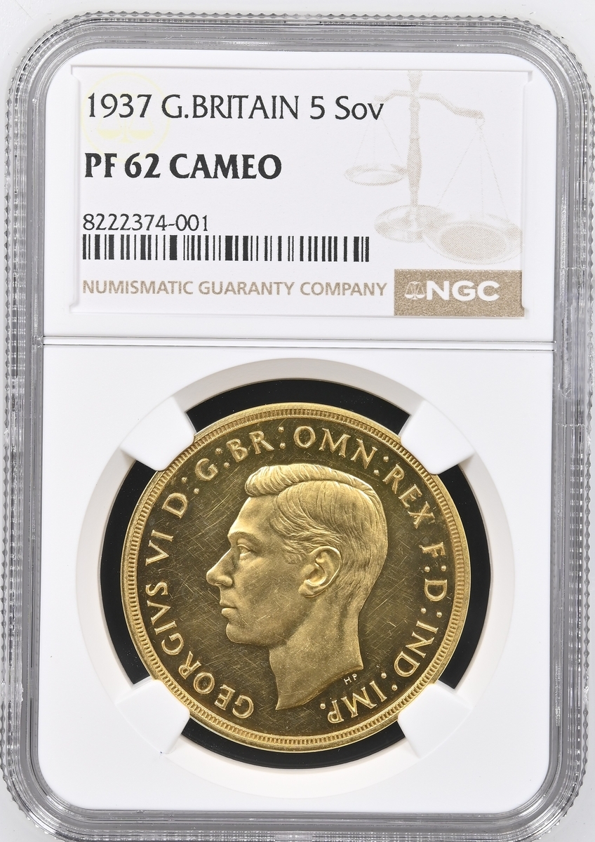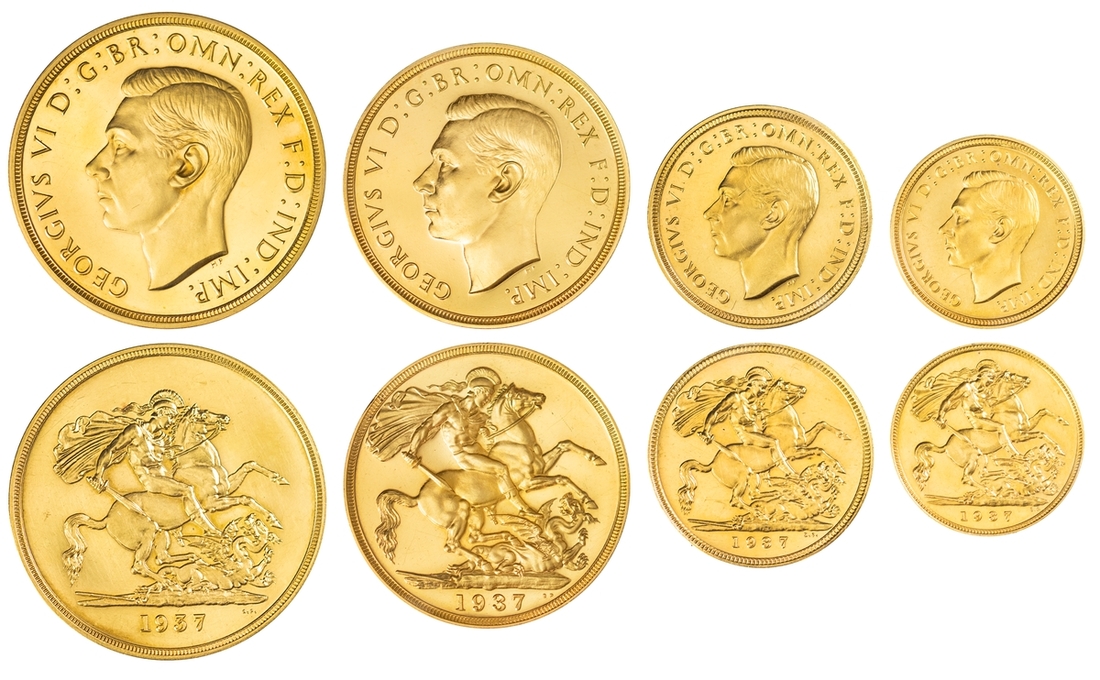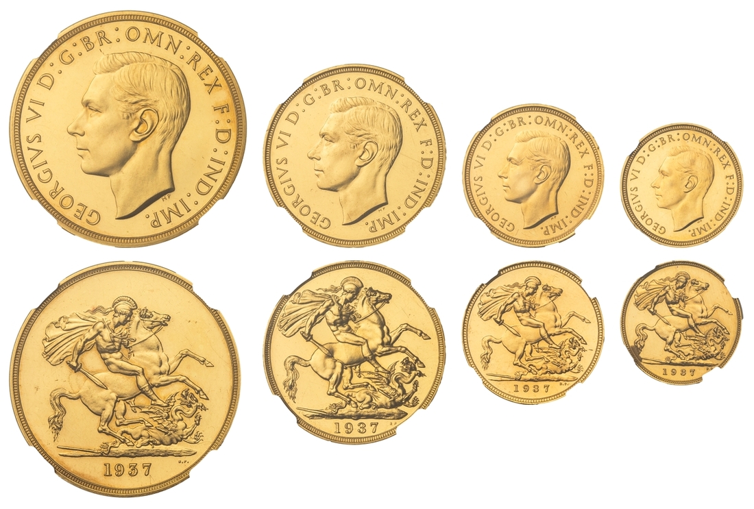 (g) NGC PF62 CAM-PF64 | George VI (1936-1952), Coronation 'Specimen' Gold Proof Set, 1937 (4), Five-Pounds to Half-Sovereign, bare head left, rev. St George and Dragon, edges plain (S.PS15 = W&R 435, 437, 439, 442; S.4074-4077),, in NGC holders, 5SOV graded PF62 CAMEO, 2SOV graded PF63, SOV graded PF62 CAMEO, 1/2SOV graded PF64 (Cert. #8222374-001/002/003/004) (4)