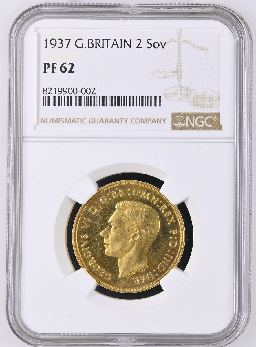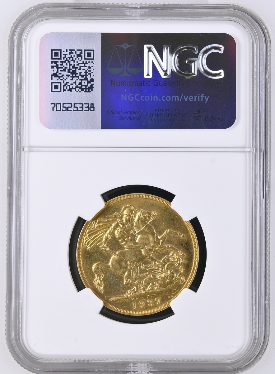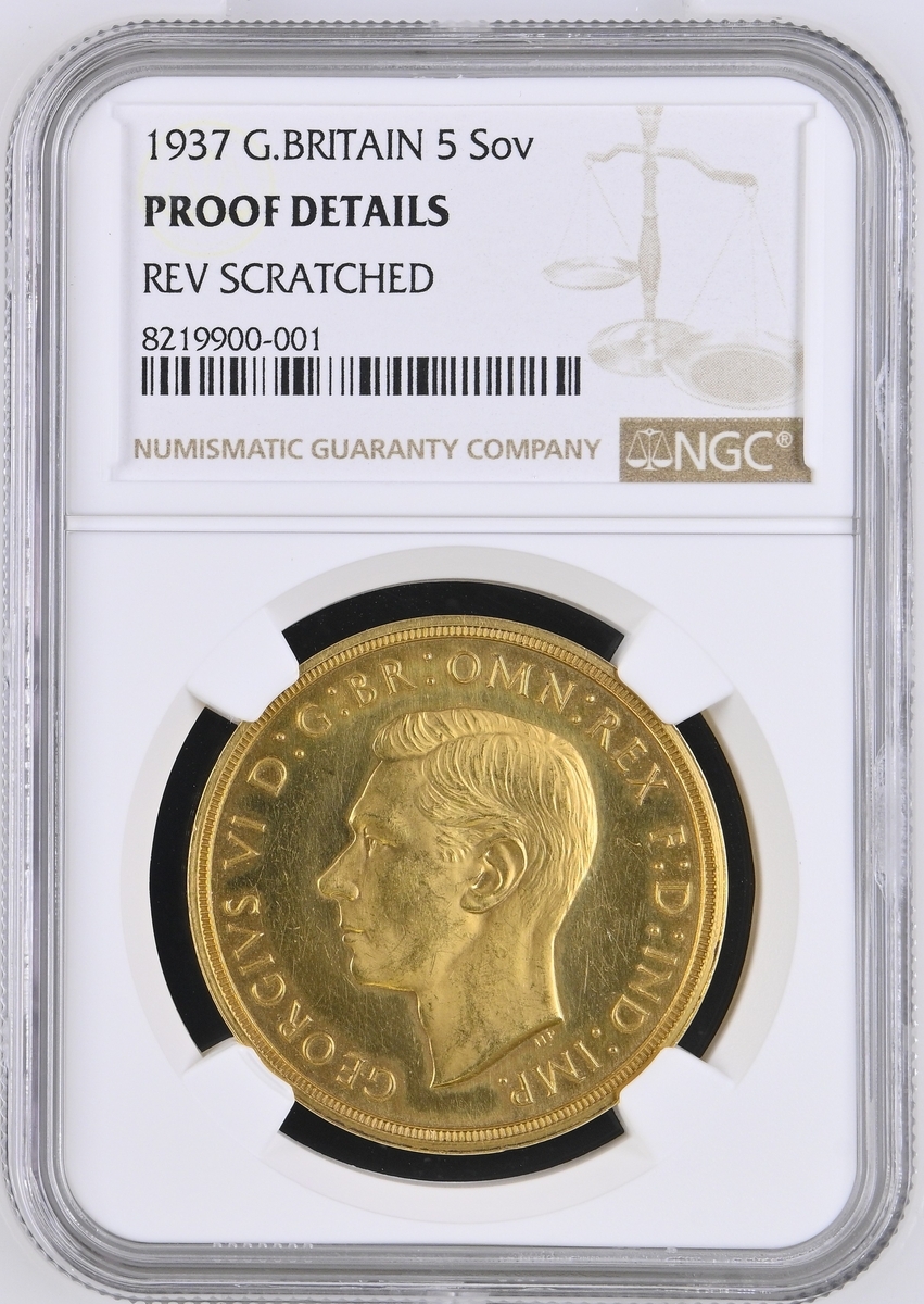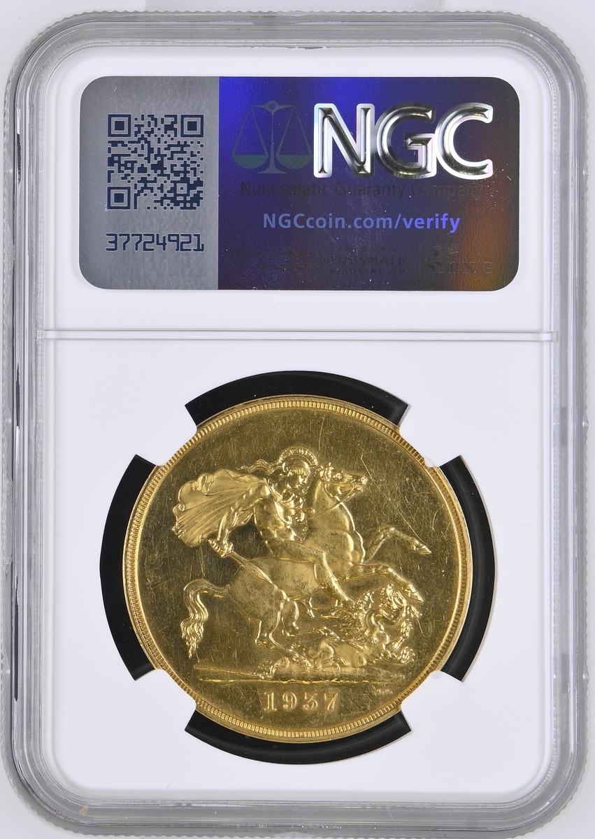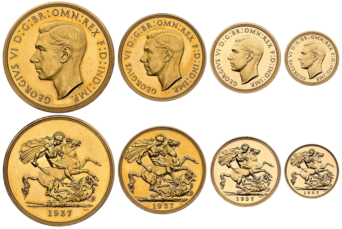 (g) NGC PF62-PF | George VI (1936-1952), Coronation 'Specimen' Gold Proof Set, 1937 (4), Five-Pounds to Half-Sovereign, bare head left, rev. St George and Dragon, edges plain (S.PS15 = W&R 435, 437, 439, 442; S.4074-4077), the Five Pounds scratched but otherwise all brilliant, as struck, in NGC holders, graded PF62-PF [5SOV=Proof Details ~ Rev Scratched; 2SOV=PF62; SOV=PF61 CAMEO; 1/2SOV=PF62] (Cert. #8219900-001/002, 8219901-001/002) (4)