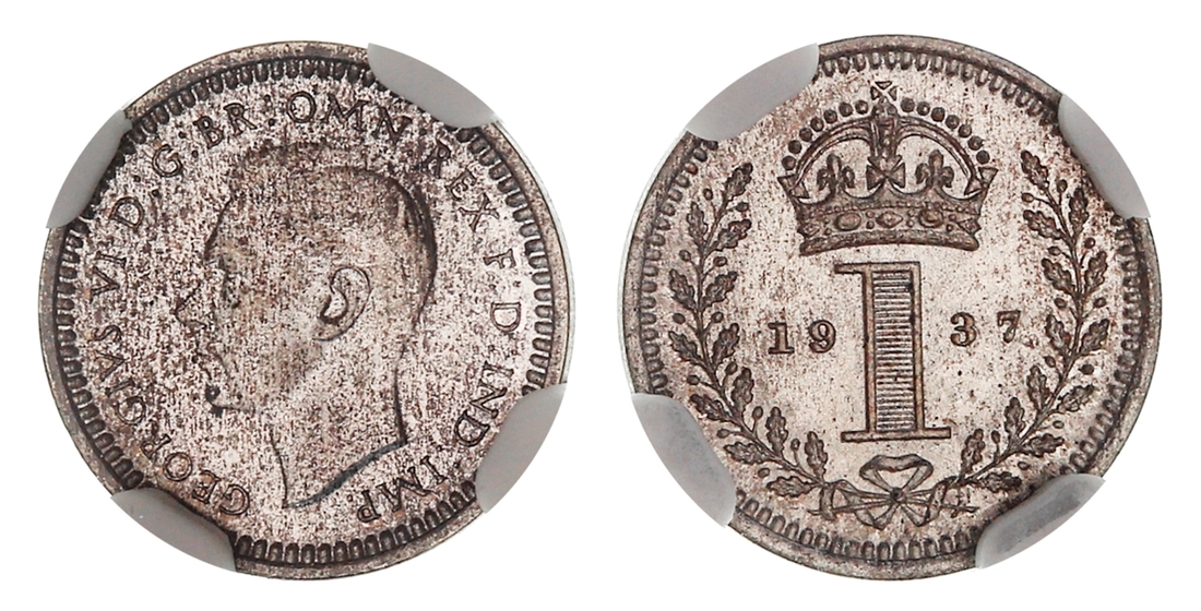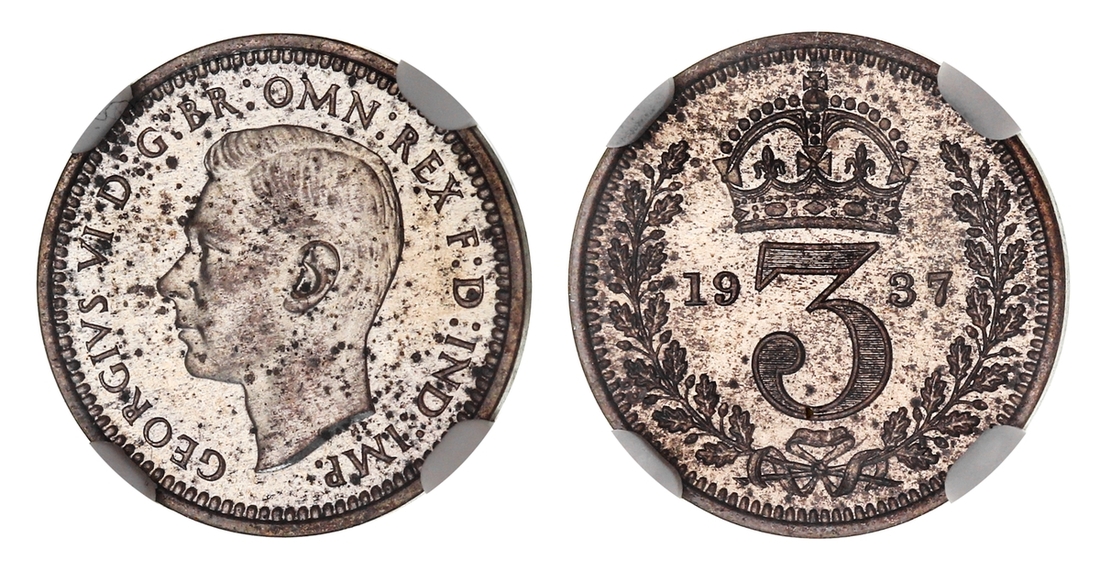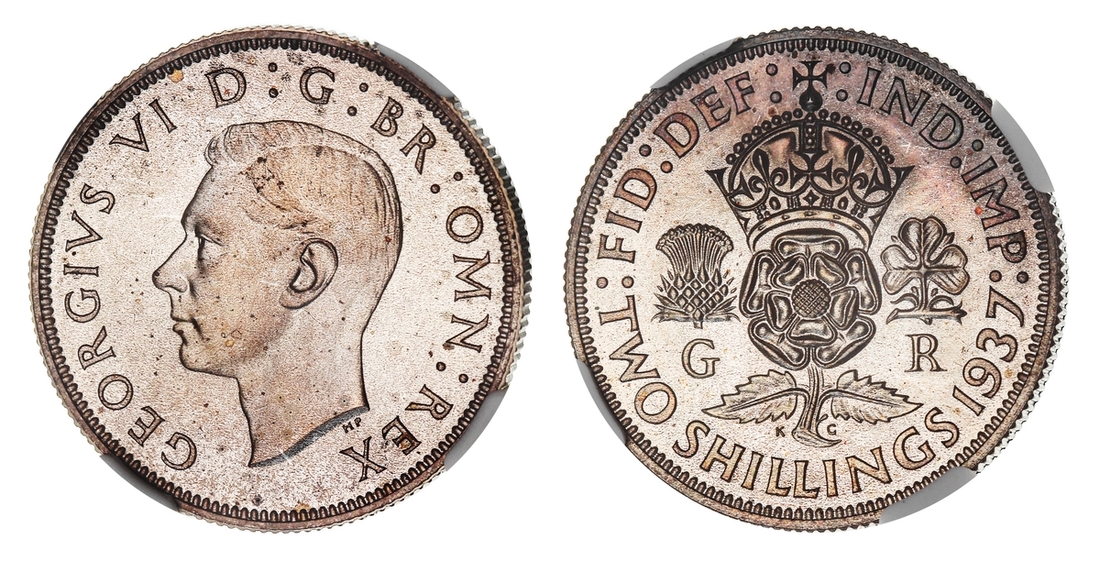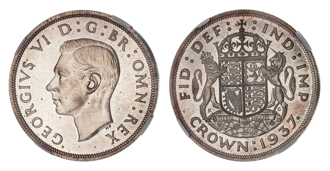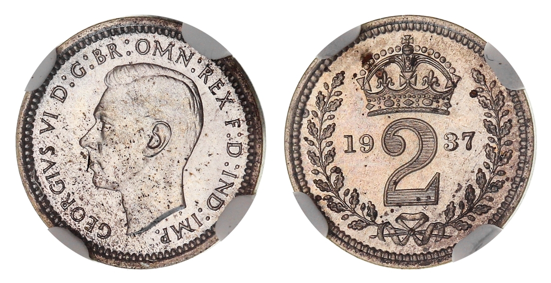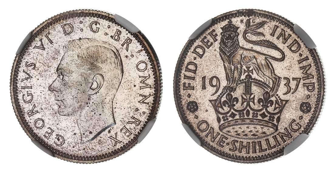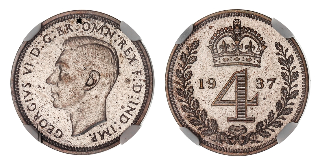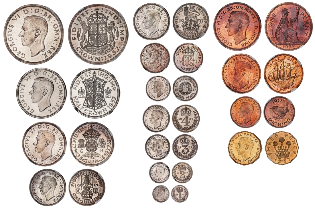 NGC PF66-PF64 | George VI (1937-1952), Coronation Proof Set, 1937, Crown to Farthing and Maundy Set (S.PS16), including, NGC PF65 | Proof Crown, 1937, edge milled, 11h (ESC 393; Bull 4021; S.4078), toning spots to otherwise glossy-brilliant fields, uncirculated, in NGC holder, graded PF65 (Cert. #8464070-001); NGC PG66 | Proof Halfcrown, 1937, edge milled, 12h (ESC 787; Bull 4035; S.4080), some minor speckled-frosting to obverse legend, brilliant, choice uncirculated, in NGC holder, graded PF66 (Cert. #8464070-002); NGC PF65 | Proof Florin, 1937, edge milled, 11h (ESC 957; Bull 4077; S.4081), speckled toning, more so to reverse, with a glossy-brilliance, uncirculated, in NGC holder, graded PF65 (Cert. #8464070-003); NGC PF64 | Proof 'English' Shilling, 1937, edge milled, 11h (ESC 1451; Bull 4121; S.4082), heavily speckled toning, with brilliance, uncirculated, in NGC holder, graded PF64 (Cert. #8464070-004); NGC PF65 | Proof 'Scottish' Shilling, 1937, edge milled, 11h (ESC 1453; Bull 4150; S.4083), heavily speckled toning, with brilliance, uncirculated, in NGC holder, graded PF65 (Cert. #8464070-005); NGC PF64 | Proof Sixpence, 1937, edge milled, 1h (ESC 1827; Bull 4219; S.4084), toned and heavily speckled surfaces, with a glossy-brilliance, uncirculated, in NGC holder, graded PF64 (Cert. #8464070-006); NGC PF65 | Proof Threepence, 1937, edge plain (ESC 2151A; Bull 4276; S.4085), light speckled toning, with a glossy-brilliance, uncirculated, in NGC holder, graded PF65 (Cert. #8464070-007); and NGC PF65 | Proof Maundy Fourpence; NGC PF64 | Proof Maundy Threepence; NGC PF65 | Proof Maundy Twopence; NGC PFP5 | Proof Maundy Penny (ESC -; Bull 4305; S.4086), all with speckled toning and some brilliance, uncirculated, in NGC holder, graded PF65-64 (Cert. #8464070-008/009/010/011); NGC PF65 | Proof 'Brass' Threepence, 1937, edge plain, 11h (S.4112), with brilliance, uncirculated, in NGC holder, graded PF65 (Cert. #8464067-071); NGC PF66 RB | Proof Penny, 1937, edge plain, 11h (S.4114), with a red-purple tone to handsome red surfaces, with brilliance, uncirculated, in NGC holder, graded PF66 RB (Cert. #8464067-072); NGC PF64 RB | Proof Halfpenny, 1937, edge plain, 11h (S.4115), light speckled toning to red surfaces, with a glossy-brilliance, uncirculated, in NGC holder, graded PF64 RB (Cert. #8464067-073); NGC PF65 RB | Proof Farthing, 1937, edge plain, 12h (S.4116), red-purple tone to red surfaces, with brilliance, uncirculated, in NGC holder, graded PF65 RB (Cert. #8464067-074), with official Royal Mint case of issue, with wear (15)