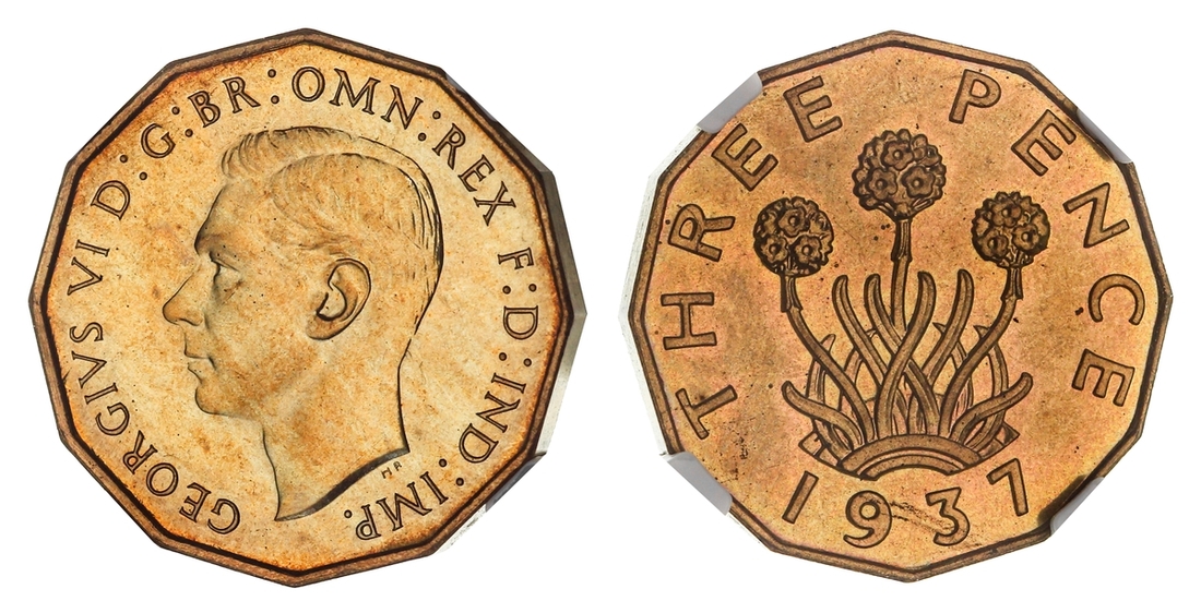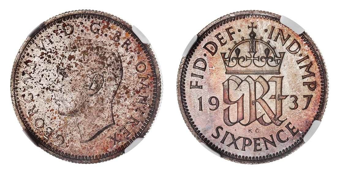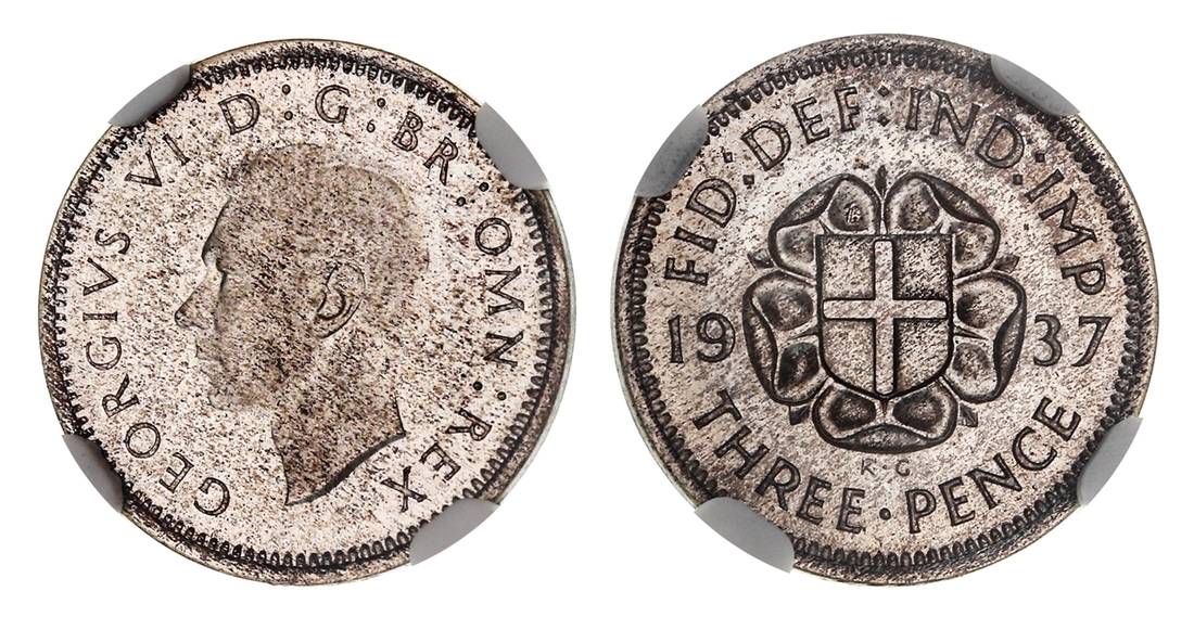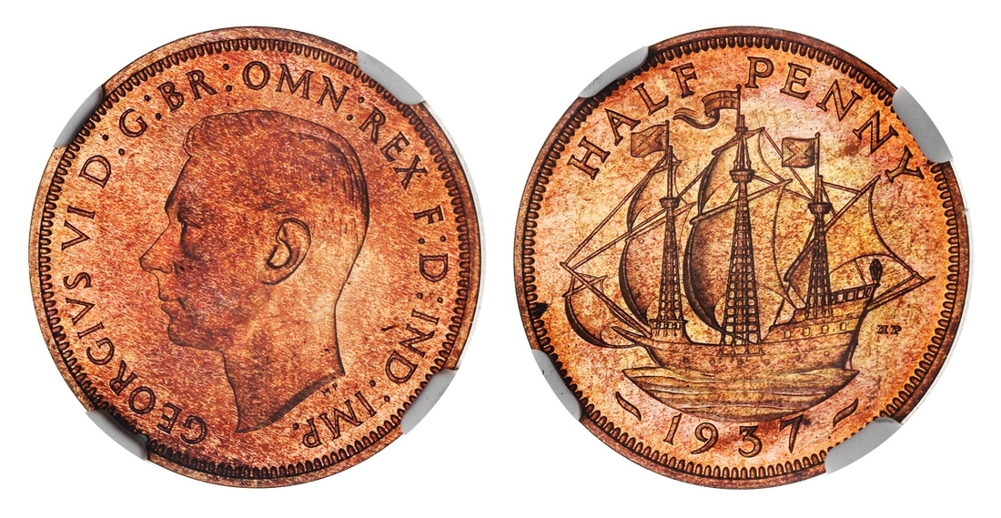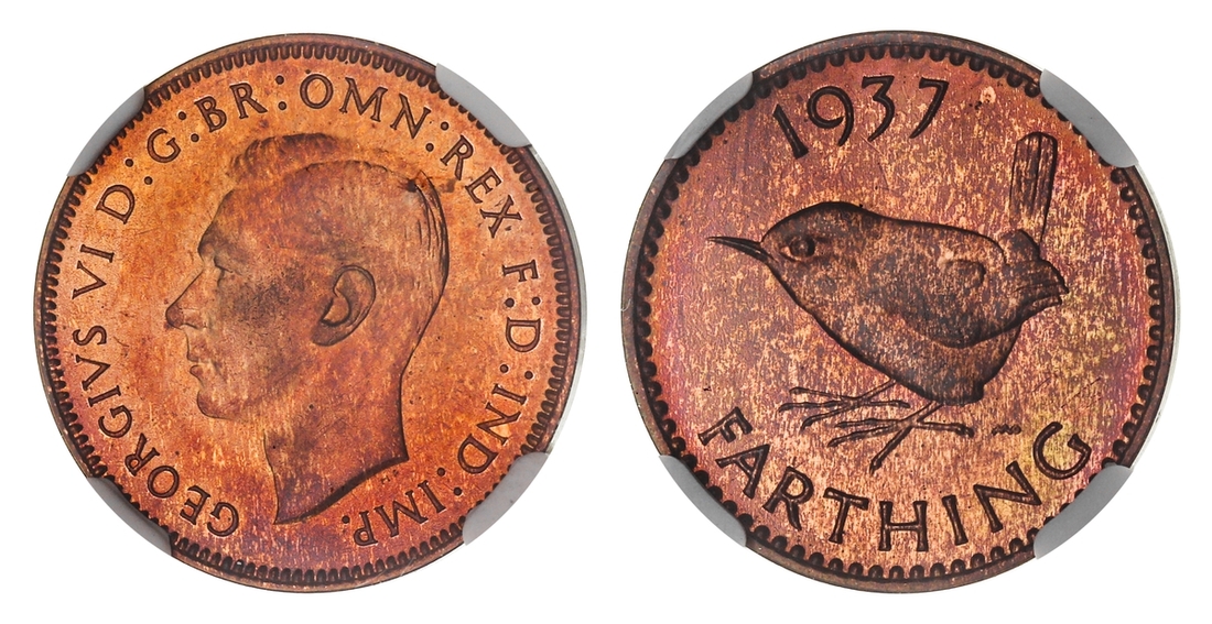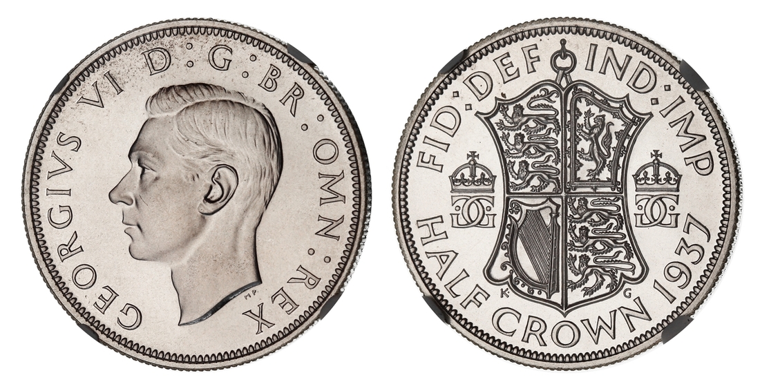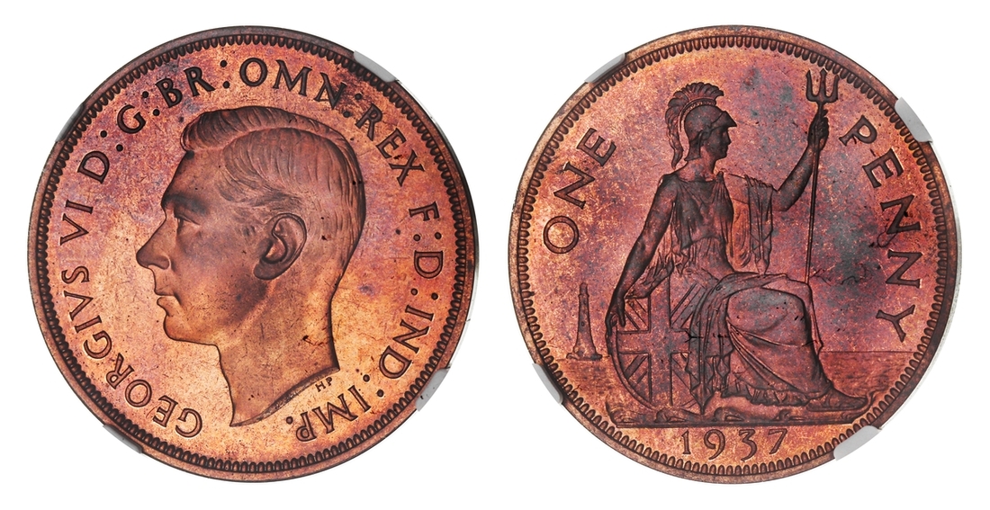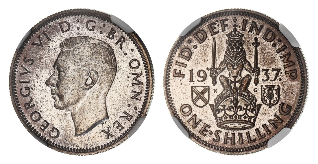 NGC PF66-PF64 | George VI (1937-1952), Coronation Proof Set, 1937, Crown to Farthing and Maundy Set (S.PS16), including, NGC PF65 | Proof Crown, 1937, edge milled, 11h (ESC 393; Bull 4021; S.4078), toning spots to otherwise glossy-brilliant fields, uncirculated, in NGC holder, graded PF65 (Cert. #8464070-001); NGC PG66 | Proof Halfcrown, 1937, edge milled, 12h (ESC 787; Bull 4035; S.4080), some minor speckled-frosting to obverse legend, brilliant, choice uncirculated, in NGC holder, graded PF66 (Cert. #8464070-002); NGC PF65 | Proof Florin, 1937, edge milled, 11h (ESC 957; Bull 4077; S.4081), speckled toning, more so to reverse, with a glossy-brilliance, uncirculated, in NGC holder, graded PF65 (Cert. #8464070-003); NGC PF64 | Proof 'English' Shilling, 1937, edge milled, 11h (ESC 1451; Bull 4121; S.4082), heavily speckled toning, with brilliance, uncirculated, in NGC holder, graded PF64 (Cert. #8464070-004); NGC PF65 | Proof 'Scottish' Shilling, 1937, edge milled, 11h (ESC 1453; Bull 4150; S.4083), heavily speckled toning, with brilliance, uncirculated, in NGC holder, graded PF65 (Cert. #8464070-005); NGC PF64 | Proof Sixpence, 1937, edge milled, 1h (ESC 1827; Bull 4219; S.4084), toned and heavily speckled surfaces, with a glossy-brilliance, uncirculated, in NGC holder, graded PF64 (Cert. #8464070-006); NGC PF65 | Proof Threepence, 1937, edge plain (ESC 2151A; Bull 4276; S.4085), light speckled toning, with a glossy-brilliance, uncirculated, in NGC holder, graded PF65 (Cert. #8464070-007); and NGC PF65 | Proof Maundy Fourpence; NGC PF64 | Proof Maundy Threepence; NGC PF65 | Proof Maundy Twopence; NGC PFP5 | Proof Maundy Penny (ESC -; Bull 4305; S.4086), all with speckled toning and some brilliance, uncirculated, in NGC holder, graded PF65-64 (Cert. #8464070-008/009/010/011); NGC PF65 | Proof 'Brass' Threepence, 1937, edge plain, 11h (S.4112), with brilliance, uncirculated, in NGC holder, graded PF65 (Cert. #8464067-071); NGC PF66 RB | Proof Penny, 1937, edge plain, 11h (S.4114), with a red-purple tone to handsome red surfaces, with brilliance, uncirculated, in NGC holder, graded PF66 RB (Cert. #8464067-072); NGC PF64 RB | Proof Halfpenny, 1937, edge plain, 11h (S.4115), light speckled toning to red surfaces, with a glossy-brilliance, uncirculated, in NGC holder, graded PF64 RB (Cert. #8464067-073); NGC PF65 RB | Proof Farthing, 1937, edge plain, 12h (S.4116), red-purple tone to red surfaces, with brilliance, uncirculated, in NGC holder, graded PF65 RB (Cert. #8464067-074), with official Royal Mint case of issue, with wear (15)