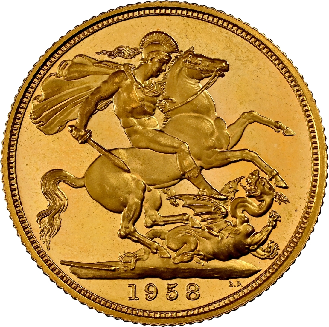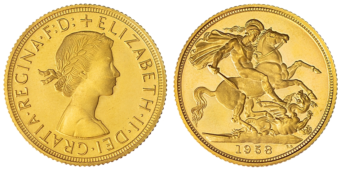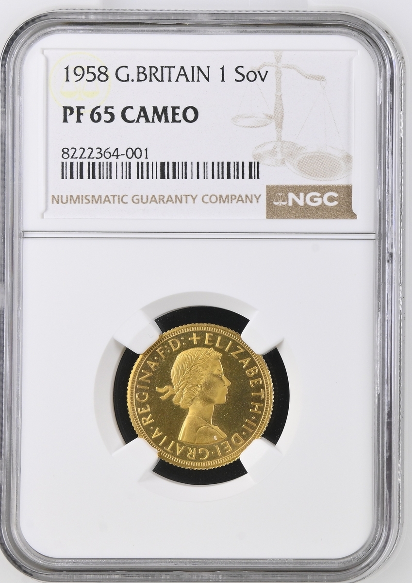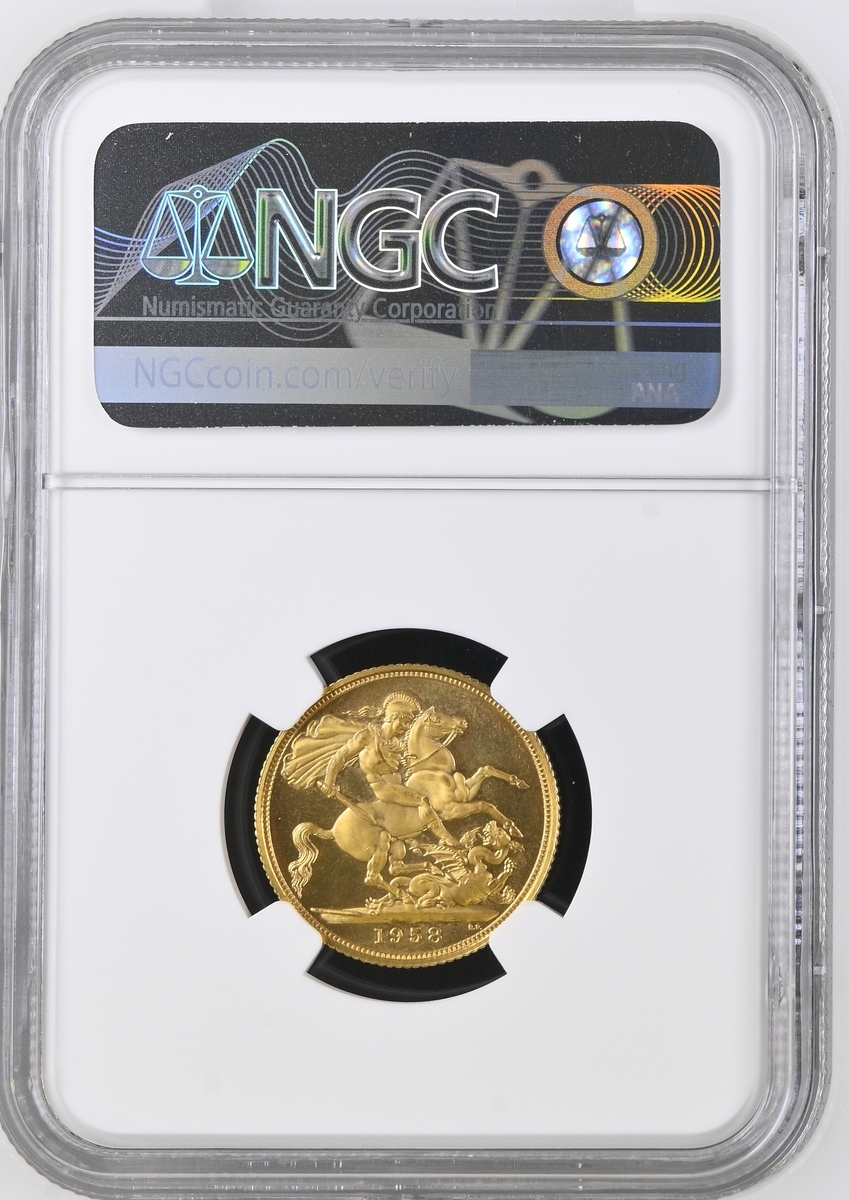 (g) NGC PF65 CAM | Elizabeth II (1952-2022), 'VIP' Proof Sovereign, 1958, first laureate head right, M.G. on truncation, by Mary Gillick, rev. St George and Dragon, edge coarsely grained, 7.98g, 12h (EGC II, 1474; WR 450 [R4]; Marsh 298B; S.4125), some frosting to fields, nonetheless brilliant and with a distinctive cameo-definition, much as struck, a highly sought after Proof of Record issued during the early years of the late lauded Queen's reign, a true connoisseur's piece thus, in NGC holder, graded PROOF 65 CAMEO (Cert. #8222364-001)