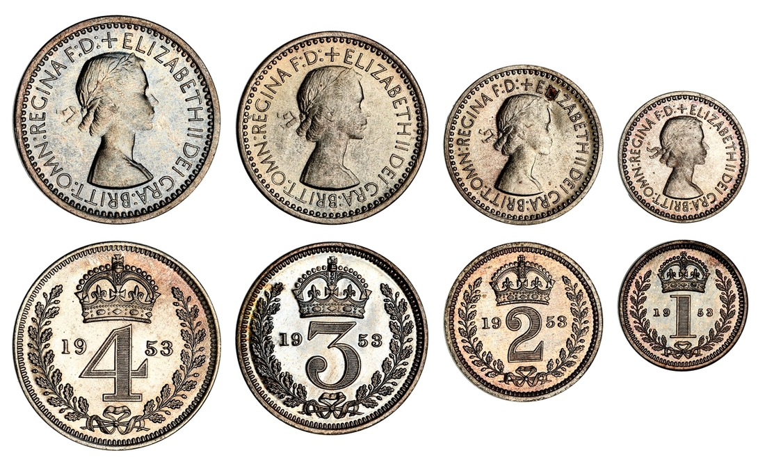 (x) Elizabeth II (1952-2022), 'Coronation' Maundy Set, 1953, young laureate head right, rev. crowned denomination within wreath, plain edges (ESC 2570; Bull 4559; S.4126), light mottled tone overlying brilliant original fields, much as struck, the rare 'Coronation' set, in its original Royal Mint case of issue (4)