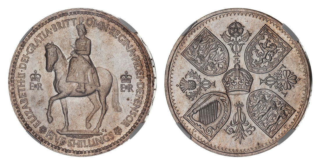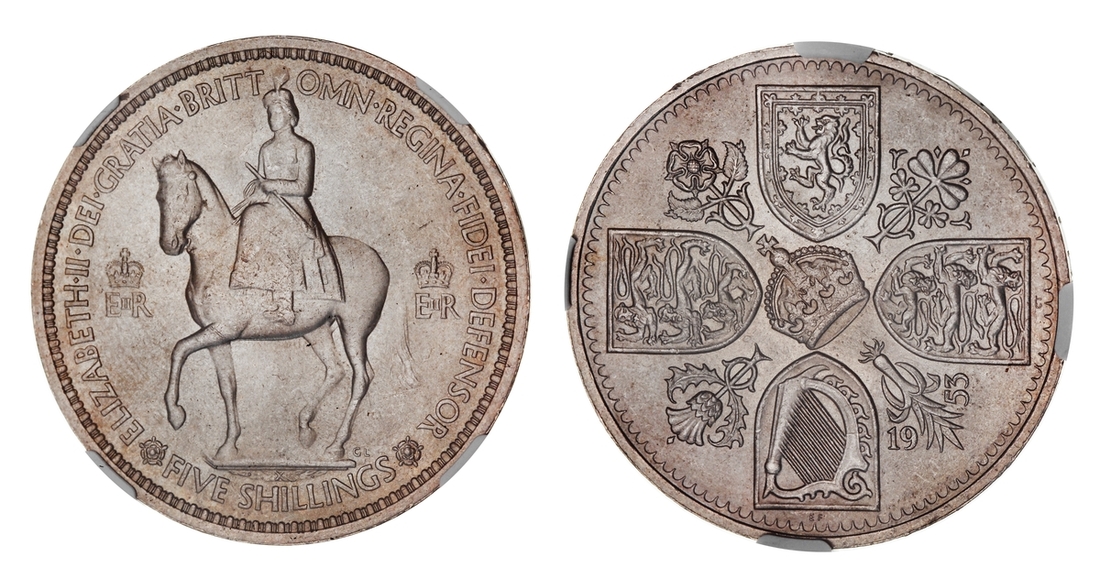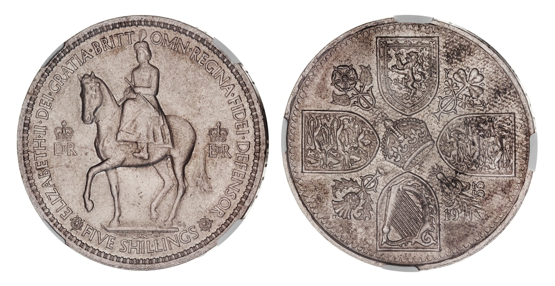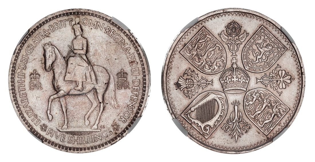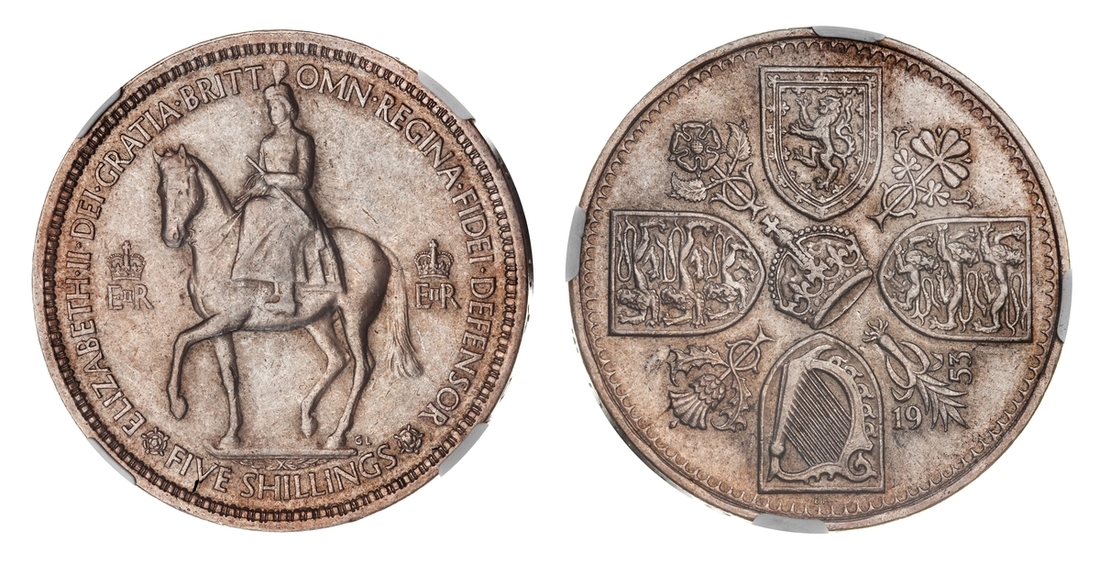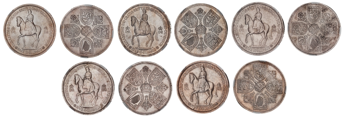 NGC MS65-AU58 | Elizabeth II (1952-2022), 'Coronation' Crown, 1953 (5), Queen on horseback left, rev. cruciform shields, incuse edge lettering, 12h (ESC 393F; Bull 4330; S.4136), all with a scattering of minor contact marks, the MS63 example with speckled darkly toned deposits to reverse, the AU58 with softness to devices, all pleasingly lustrous, about as struck to about extremely fine (5), in NGC holders, graded MS65 (Cert. #8464067-064) / MS64 (Cert. #8464067-066) / MS63 (Cert. #8464067-034) / MS62 (Cert. #8464067-065) / AU58 (Cert. #8464067-039) (5)