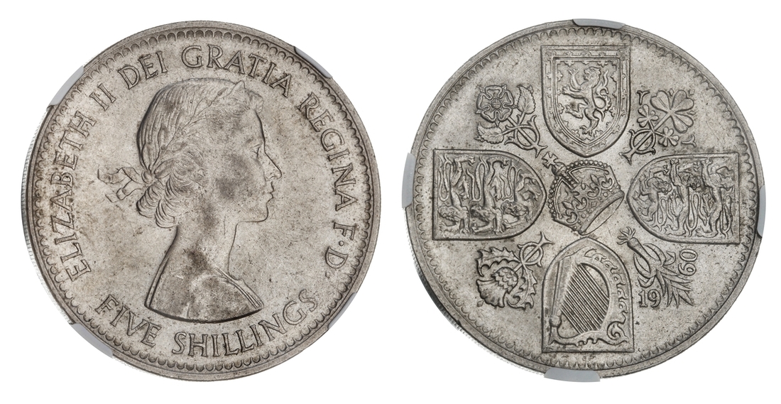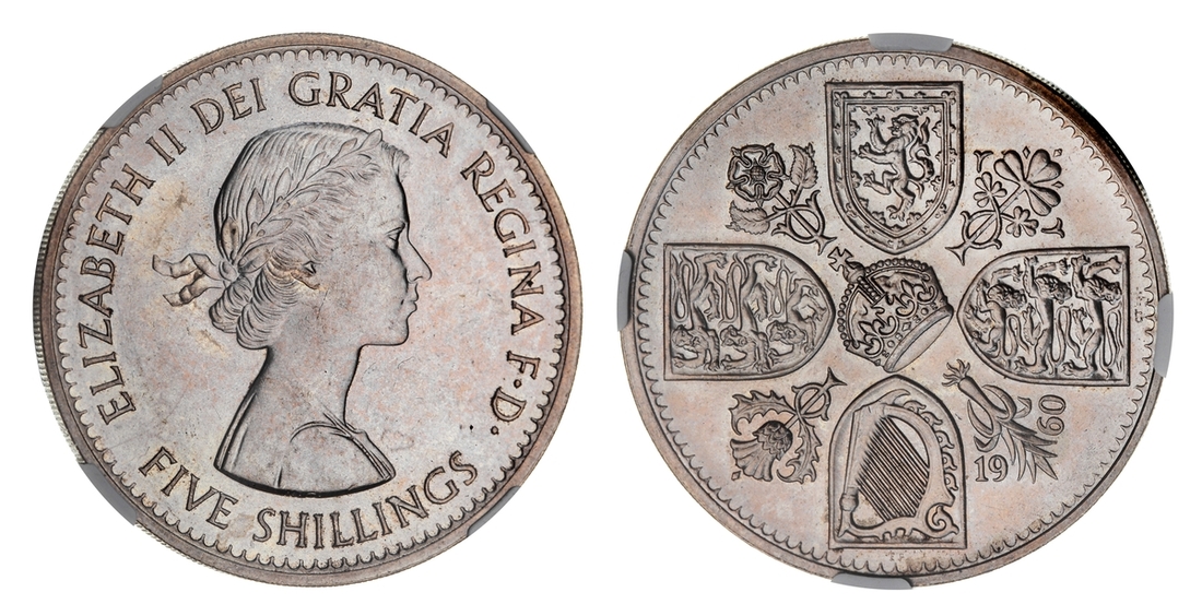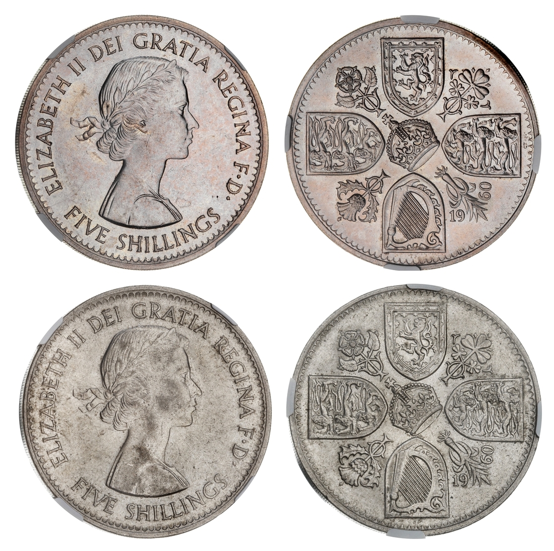 NGC PL62 | Elizabeth II (1952-2022), 'Proof-Like' New York British Exhibition Crown, 1960, laureate head right, rev. cruciform shields, emblems in angles, edge milled, 12h (ESC 393K; Bull 4335; S.4143), light contact marking, more so to obverse, otherwise with a glossy near-brilliance, good extremely fine, in NGC holder, graded PL62 (Cert. #8464067-069); and NGC AU55 | New York British Exhibition Crown, 1960, as before, edge milled 12h (ESC 393K; Bull 4335; S.4143), light contact marking and softness to the portrait, with a hint of lustre, good very fine, in NGC holder, graded AU55 (Cert. #8464067-067) (2)