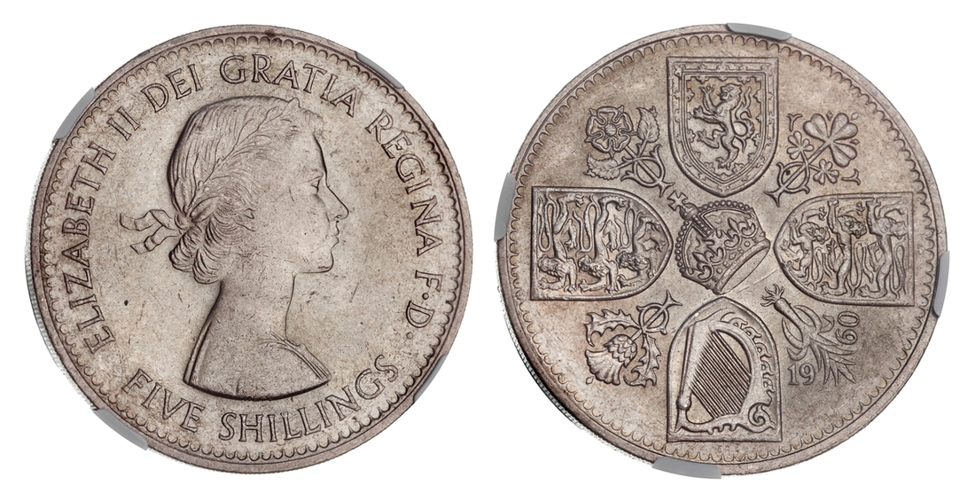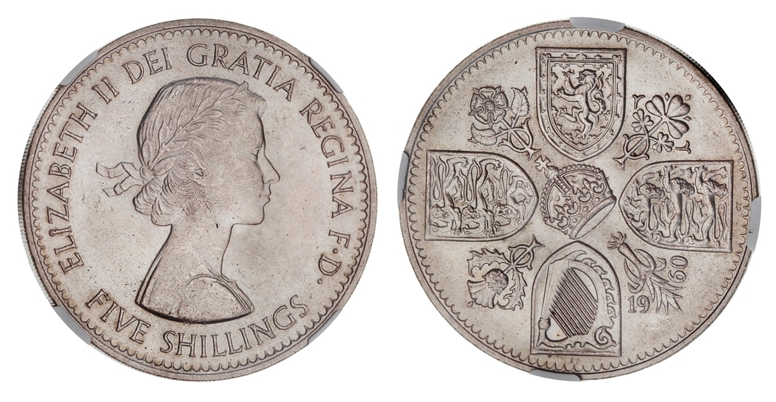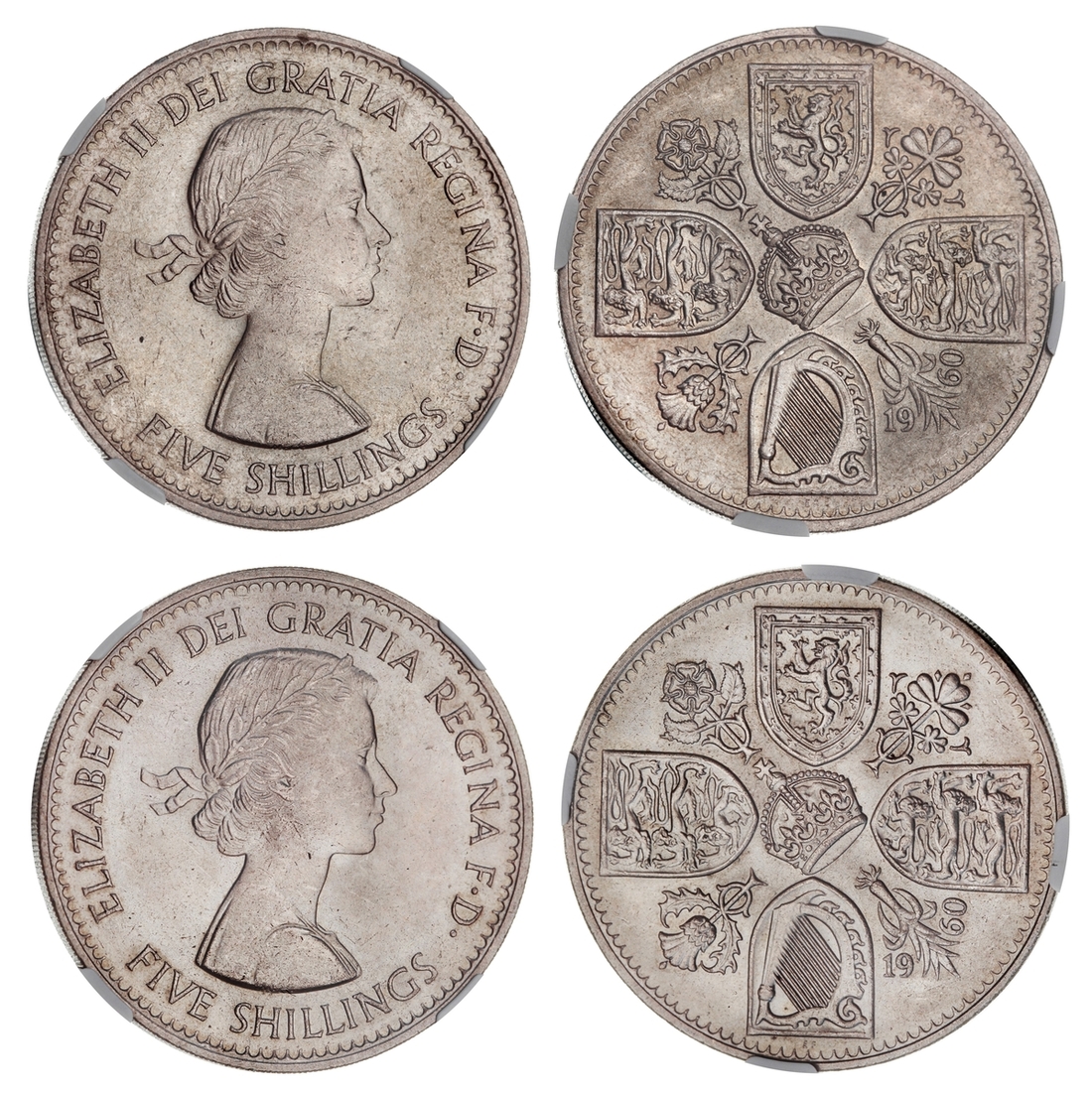 NGC MS64 | Elizabeth II (1952-2022), New York British Exhibition Crown, 1960, laureate head right, rev. cruciform shields, emblems in angles, edge milled, 12h (ESC 393K; Bull 4335; S.4143), light surface marking, with a cartwheel lustre, much as struck, in NGC holder, graded MS64 (Cert. #8464067-068); and NGC MS62 | New York British Exhibition Crown, 1960, as before, edge milled 12h (ESC 393K; Bull 4335; S.4143), light contact marking and hairline scratch to reverse, with lustre, extremely fine, in NGC holder, graded MS62 (Cert. #8464067-070) (2)