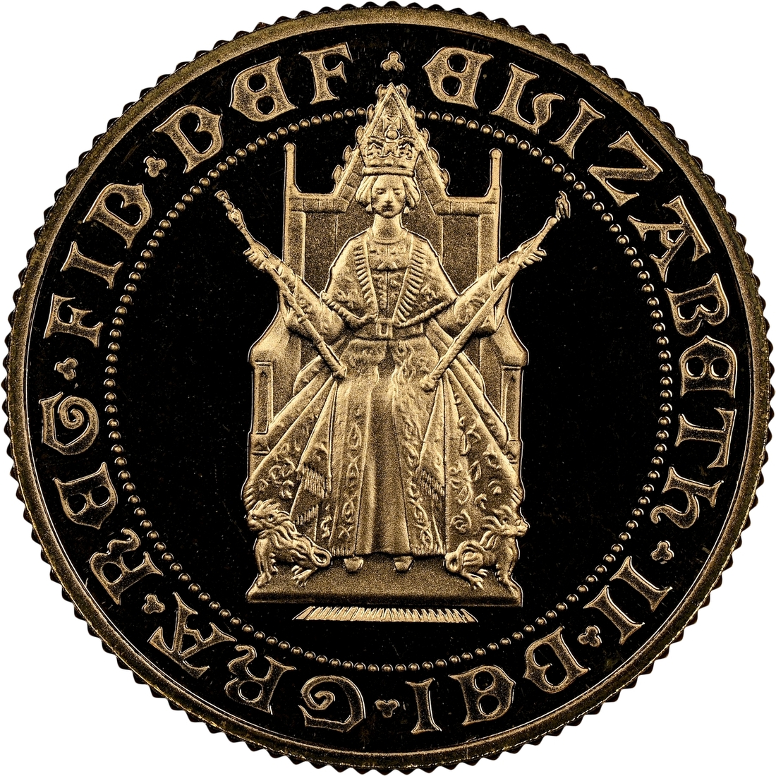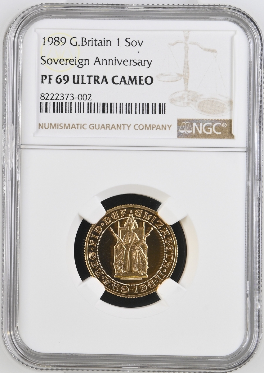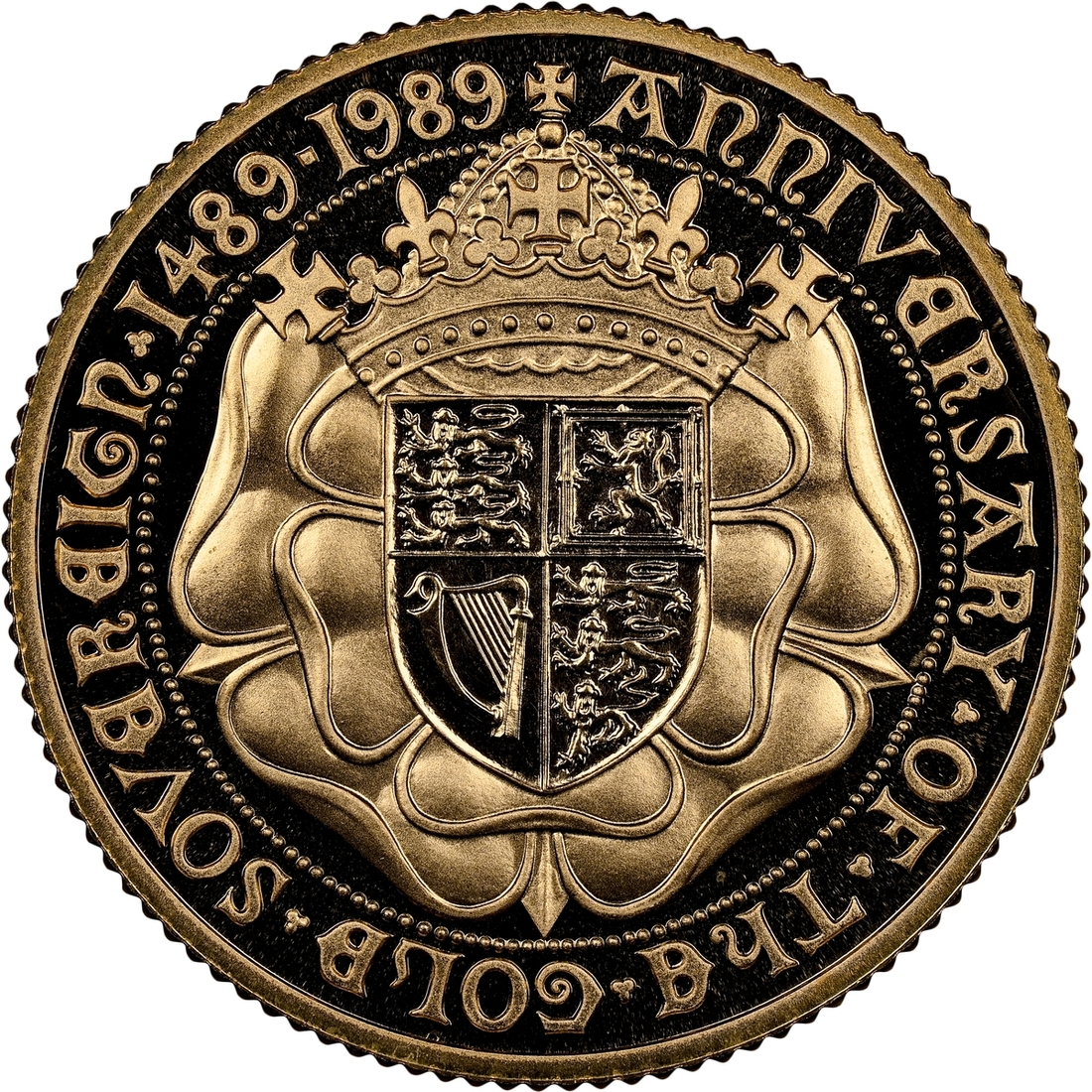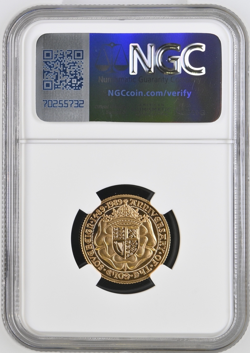(g) NGC PF69 UCAM | Elizabeth II (1952-2022), "500th Anniversary of the Sovereign", Commemorative Gold Proof Sovereign, 1989, by Bernard Sindall, edge milled, 7.98g*, 12h (Marsh 313H; S.SC3), brilliant uncirculated, with original box, in NGC holder, graded PROOF 69 ULTRA CAMEO (Cert. #8222373-002)