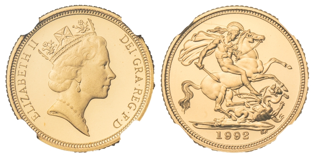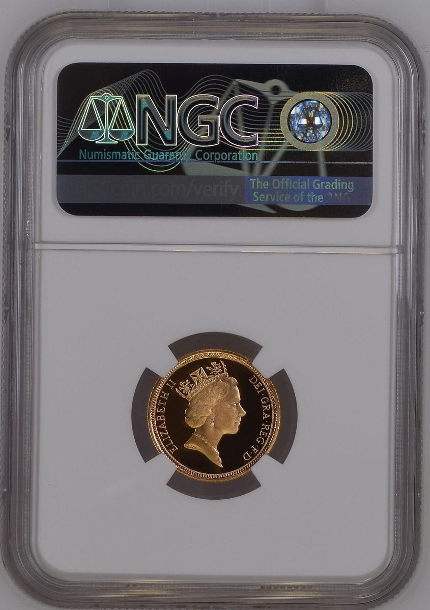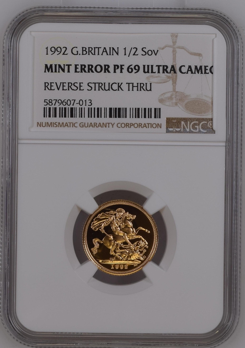 (g) NGC PF69 UCAM | Mint Error | Elizabeth II (1952-2022), Gold Proof Half-Sovereign, 1992, third crowned head right, RDM incuse on truncation, ELIZABETH II DEI. GRA. REG. F: D, rev. St. George and Dragon, date in exergue, B.P. to upper right of exergue, edge milled, 3.99g*, 12h (S.SB2), uncirculated with brilliant fields, as struck, in NGC holder, graded PROOF 69 ULTRA CAMEO ~ MINT ERROR ~ "Reverse Struck Through" (Cert. #5879607-013)