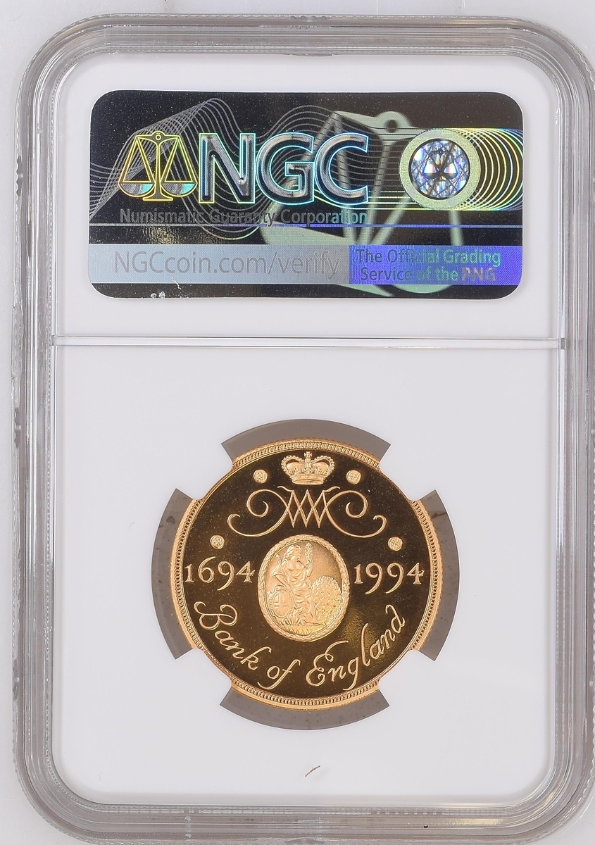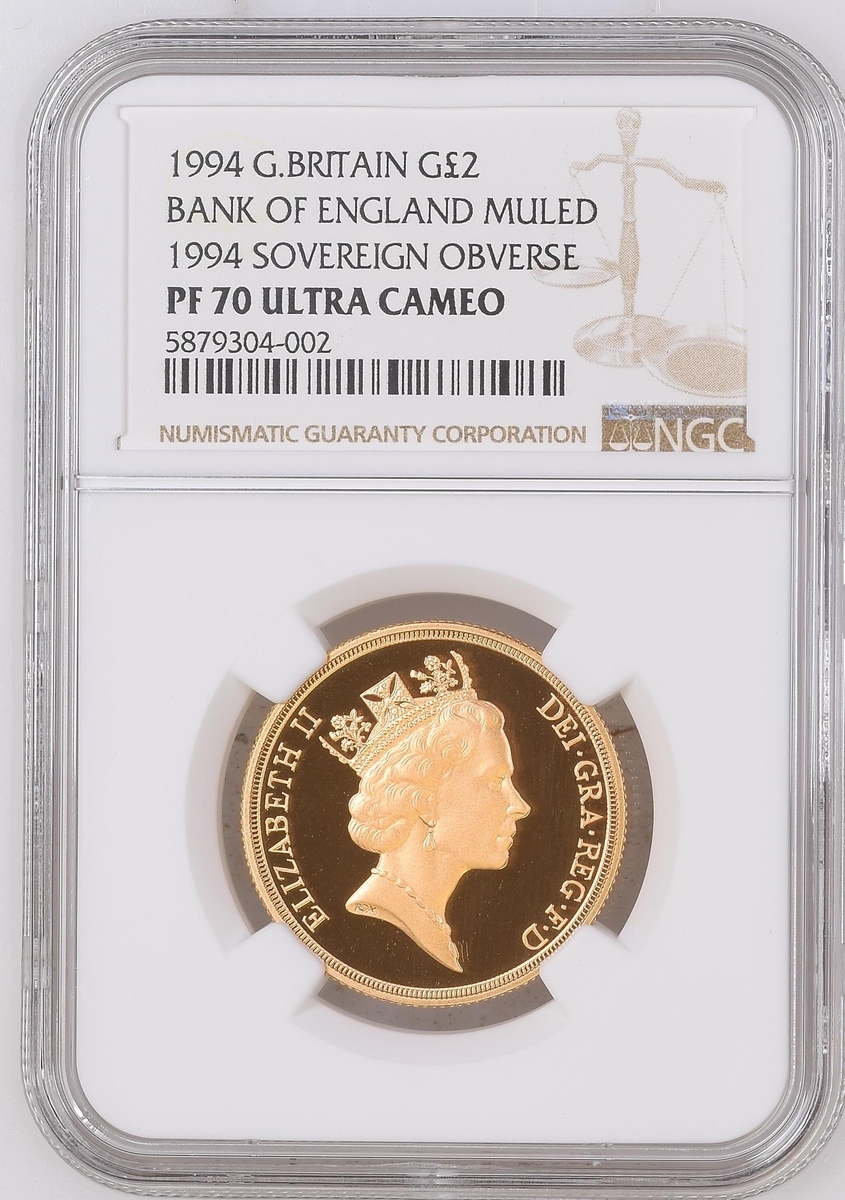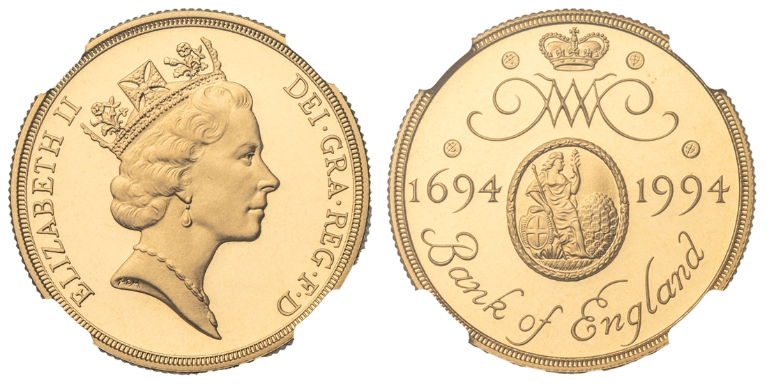 (g) NGC PF70 UCAM | *Top Pop* | Elizabeth II (1952-2022), Proof Two-Pounds, 1994, Double-Sovereign Error Mule, Commemorating "300 Years of the Bank of England", third head right, by Raphael Maklouf, rev. Corporate Seal of the Bank of England featuring Seated Britannia, crowned monogram of William and Mary above, Bank of England in hand-written font below, edge milled, 15.98g*, 12h (S.K4), uncirculated with brilliant fields, as struck, in NGC holder, graded PF70 ULTRA CAMEO (Cert. #5879304-002) [*Joint Finest Certified*]