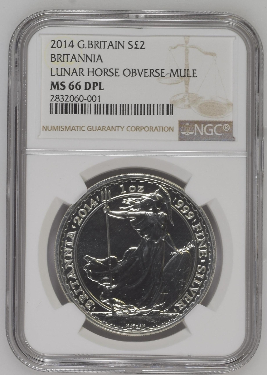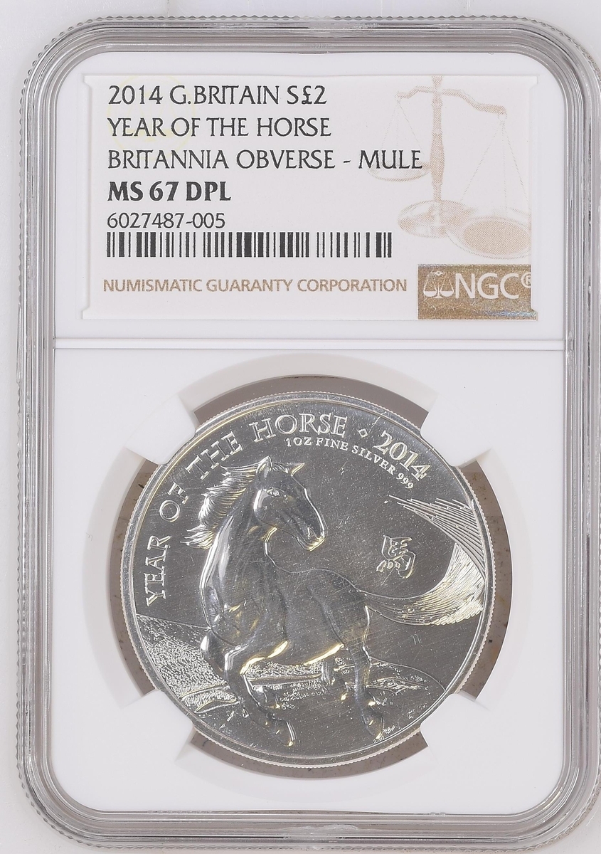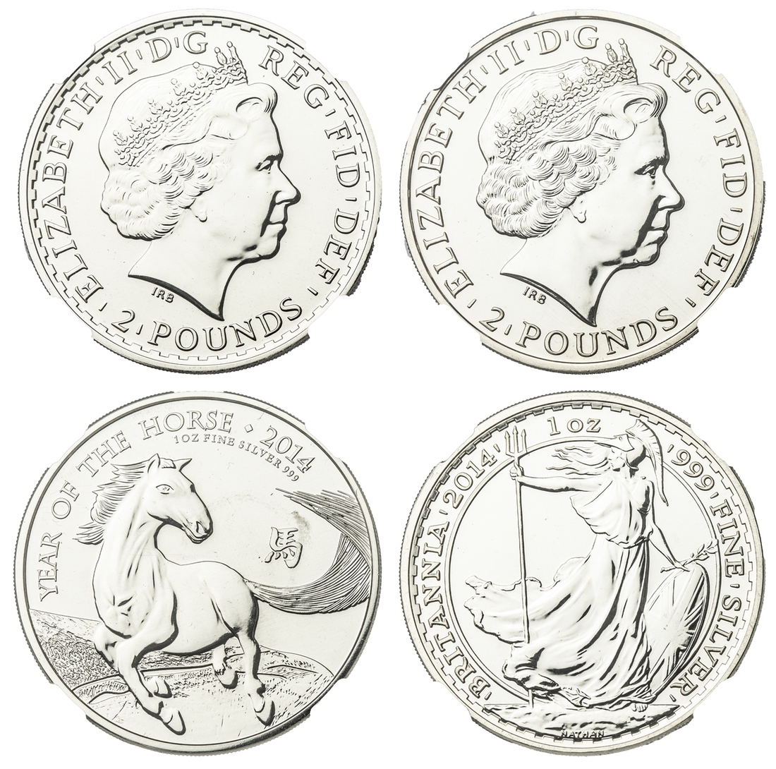 NGC MS67 DPL | Elizabeth II (1952-2022), Silver Two-Pound, 2014, Britannia Obverse - Mule, commemorating 'The Year of the Horse', portrait crowned head right, IRB below truncation, rev. Britannia facing left, edge milled, 12h (S.BSF12/CLBB1), uncirculated, deep proof-like, extremely fine, in NGC holder, graded MS67 DEEP PROOF LIKE ~ Britannia Obverse - Mule (Cert. #6027487-005); also NGC MS66 DPL | Elizabeth II (1952-2022), Silver Two-Pound, 2014, Lunar Horse Obverse - Mule, commemorating 'Britannia, portrait crowned head right, IRB below truncation, rev. Britannia facing left, edge milled, 12h (S.BSF12), uncirculated, deep proof-like, extremely fine, in NGC holder, graded MS66 ~ Lunar Horse Obverse - Mule (Cert. #2832060-001) (2)