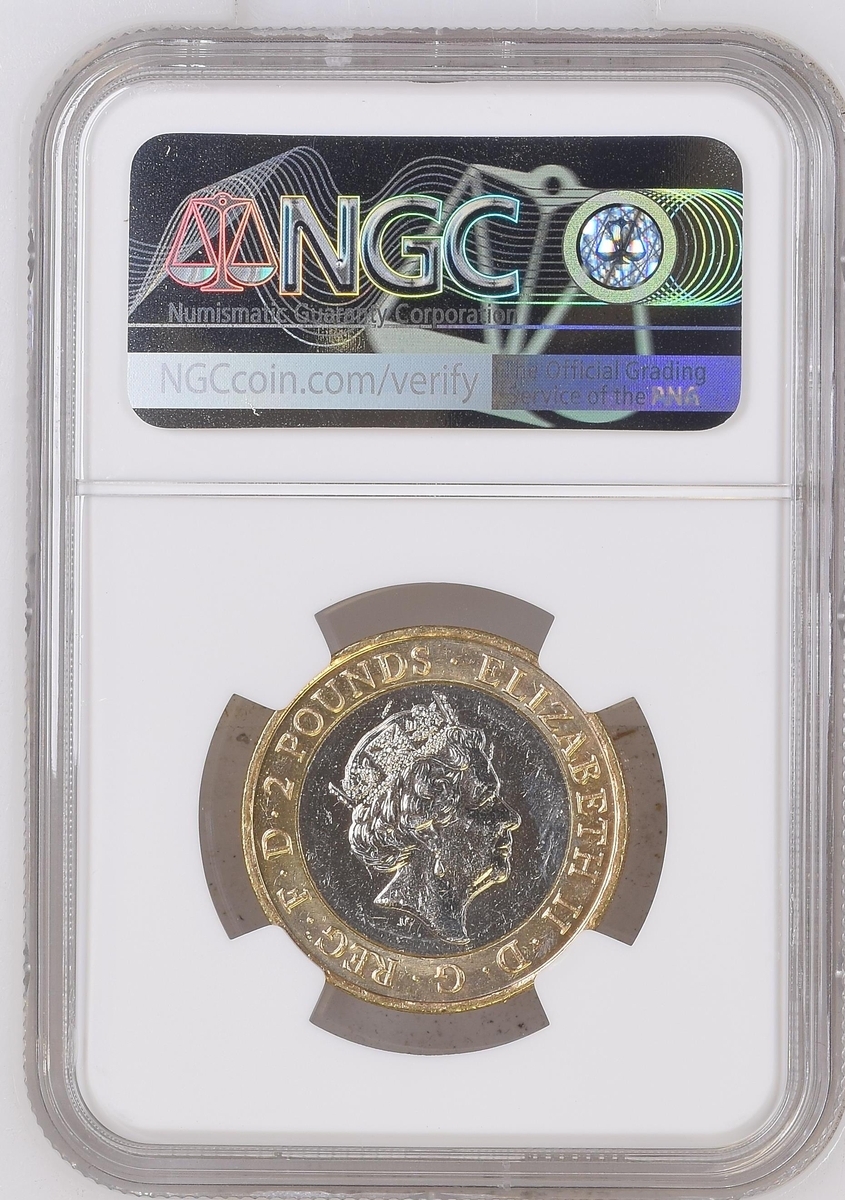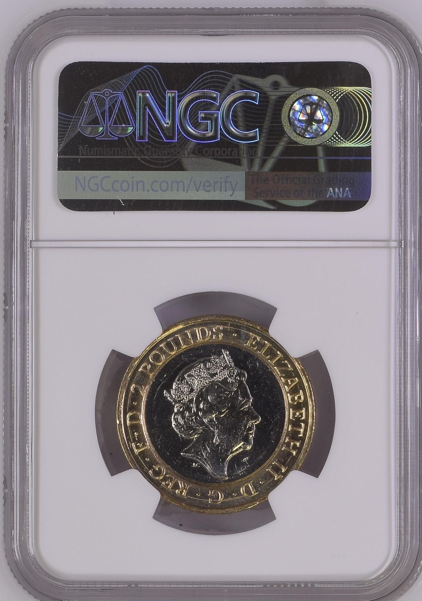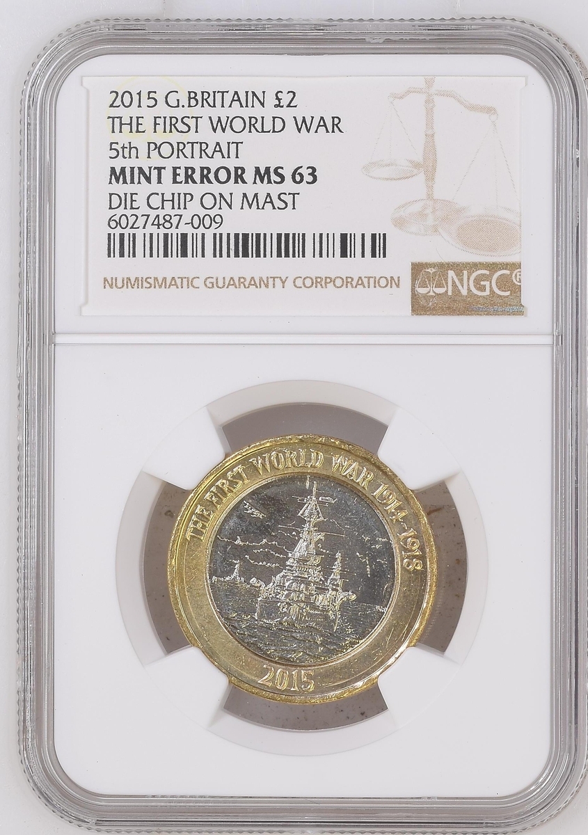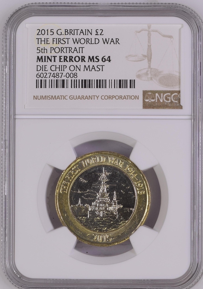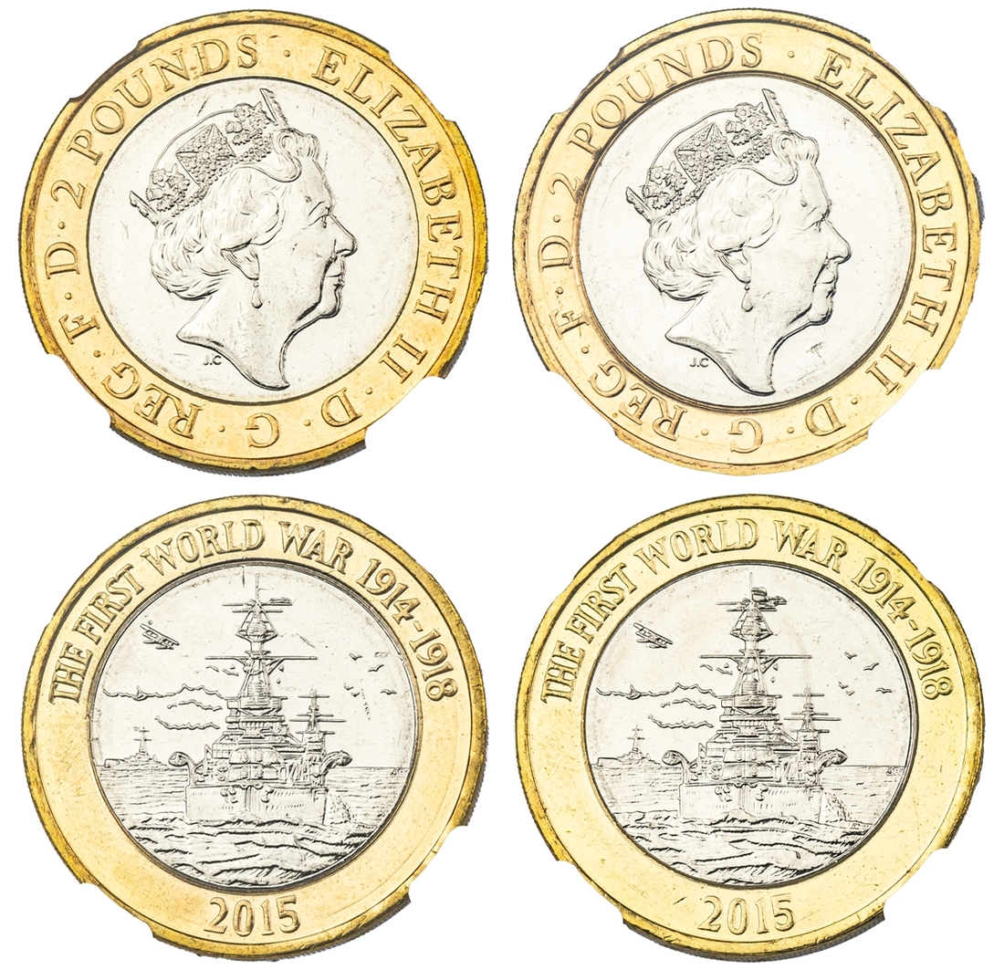 NGC MINT ERROR MS64 | Elizabeth II (1952-2022), Bimetallic Two-Pound, 2015, 'Die Chip on Mast' Error, commemorating The First World War, fifth portrait crowned head right, JC below truncation, rev. Royal Navy battleship, edge incuse lettered, 12h (S.K35), uncirculated with just a few light contact marks, extremely fine, in NGC holder, graded MINT ERROR MS64 (Cert. #6027487-008); and another, in NGC holder, graded MINT ERROR MS63 (Cert. #6027487-009) (2)
