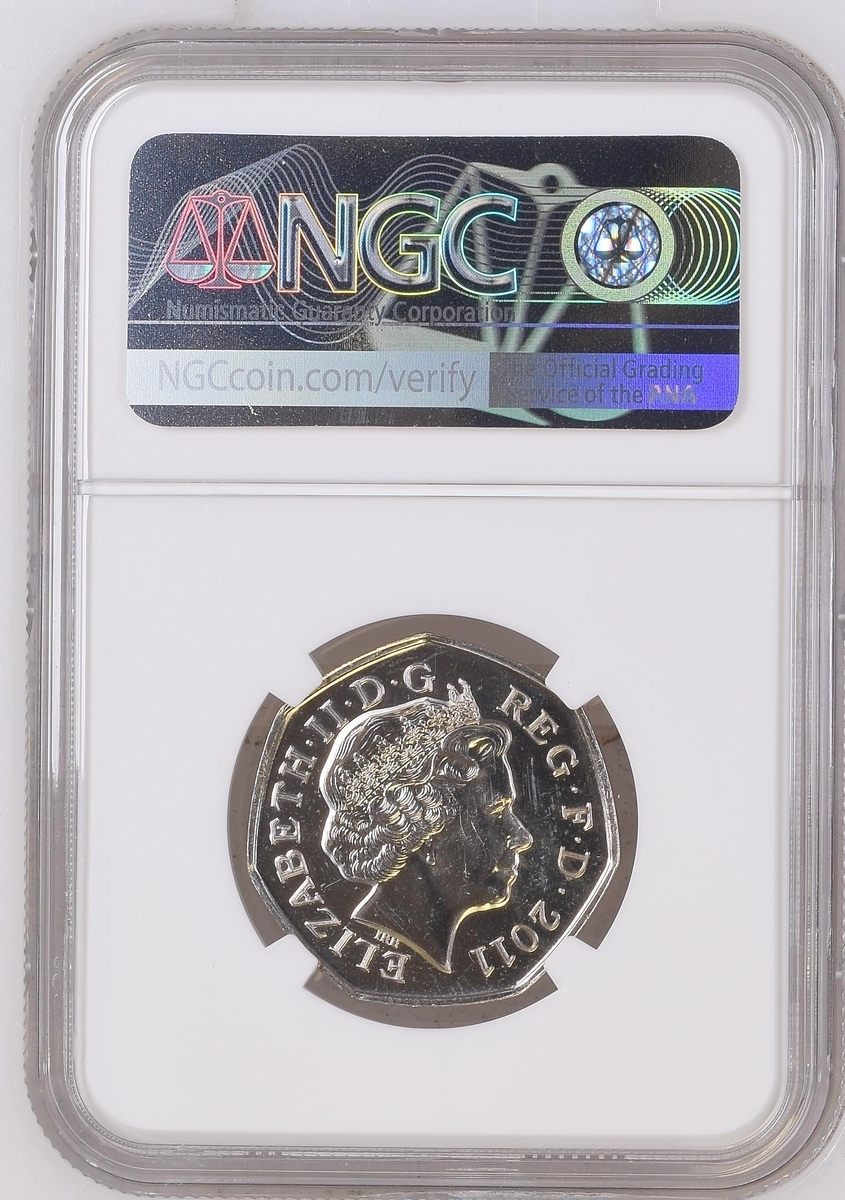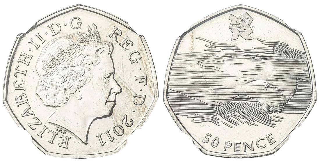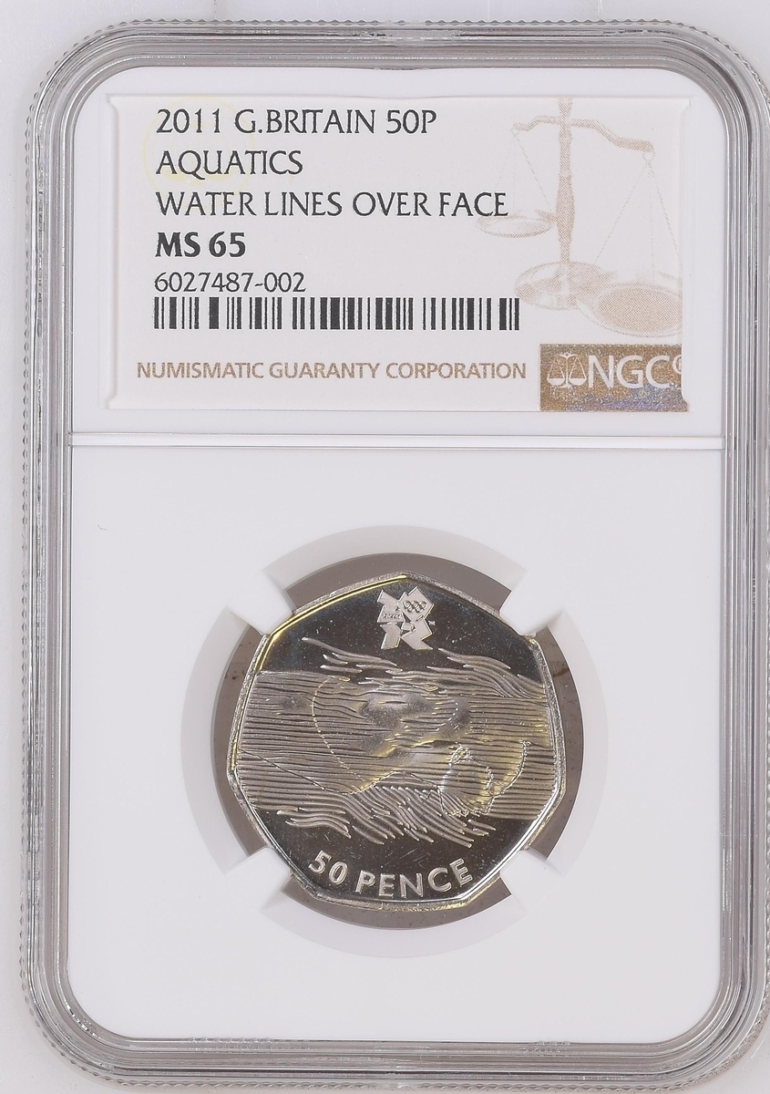 NGC MS65 | Elizabeth II (1952-2022), The London 2012 Olympic and Paralympic Games, Commemorative 50 Pence, 2011, "Aquatics", 'Lines over Face' Variety, crowned bust right, rev. Swimmer with water lines over face, 12h (S.LO2A), brilliant uncirculated, one of only 600 believed struck before the dies were modified, the fabled rarity of the modern 50-Pence collector's market., in NGC holder, graded MS65 (Cert. #6027487-002)