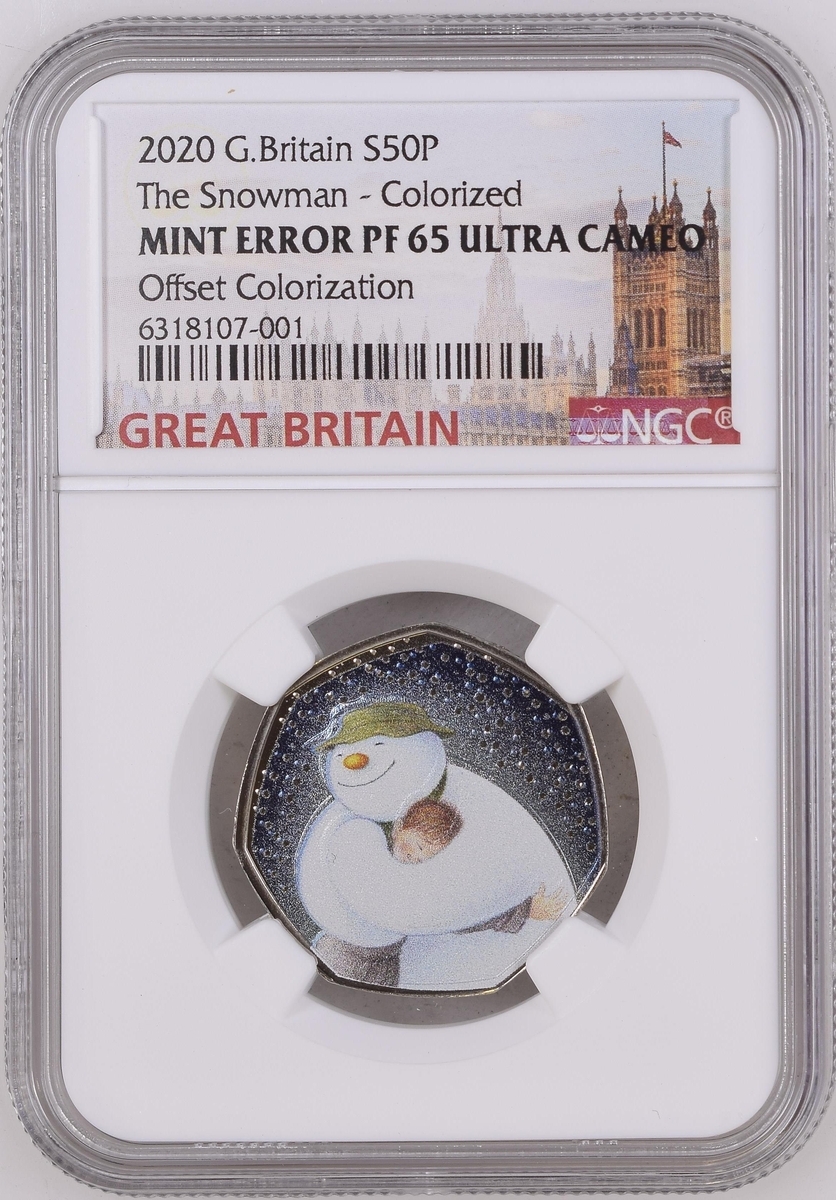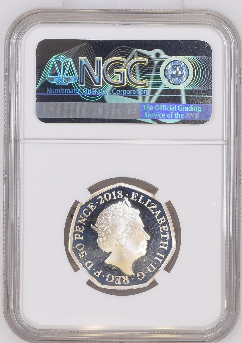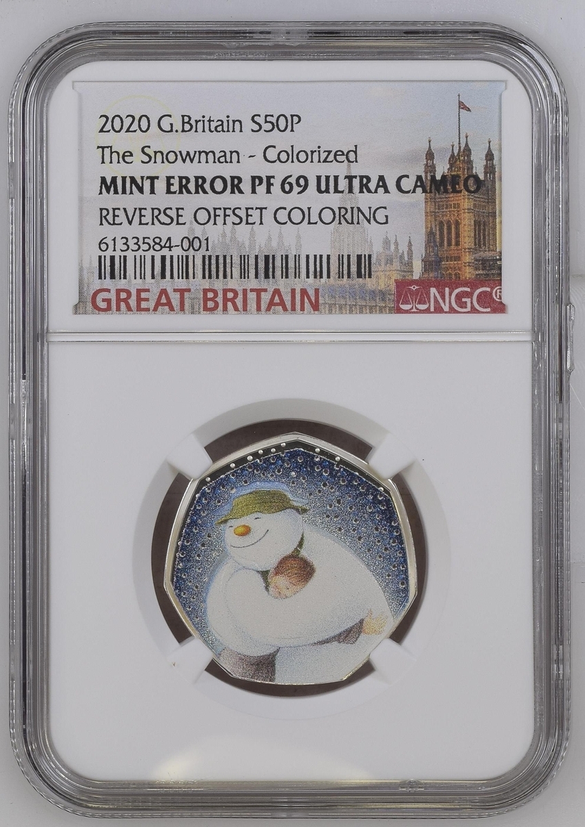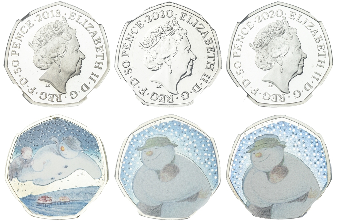NGC PF68 UCAM | Elizabeth II (1952-2022), 50 Pence, 2018, 'Blue Hat / Scarf', edge plain, 12h (S.H60), uncirculated, extremely fine, as struck, in NGC holder, graded PF68 ULTRA CAMEO ~ Blue Hat / Scarf (Cert. #6027487-001); and also NGC PF69 ULTRA CAMEO | 50 Pence, 2020, 'Reverse Offset Coloring' Mint Error, edge plain, 12h (S.H91), uncirculated, extremely fine, as struck, in NGC holder, graded PF69 ULTRA CAMEO ~ Reverse Offset Coloring (Cert. #6133584-001); and also NGC PF65 ULTRA CAMEO | 50 Pence, 2020, 'Offset Coloring' Mint Error, edge plain, 12h (S.H91), uncirculated, extremely fine, as struck, in NGC holder, graded PF65 ULTRA CAMEO ~ Offset Coloring (Cert. #6318107-001) (3)