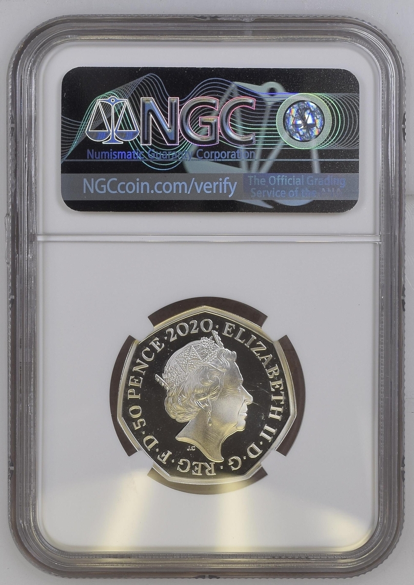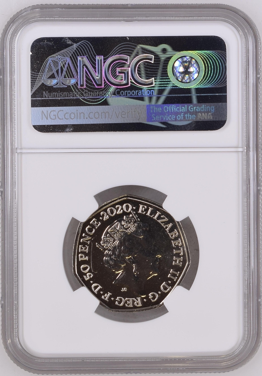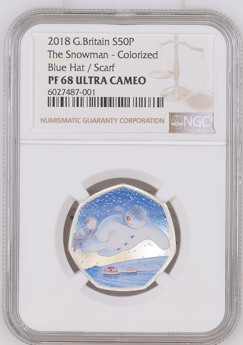 NGC PF68 UCAM | Elizabeth II (1952-2022), 50 Pence, 2018, 'Blue Hat / Scarf', edge plain, 12h (S.H60), uncirculated, extremely fine, as struck, in NGC holder, graded PF68 ULTRA CAMEO ~ Blue Hat / Scarf (Cert. #6027487-001); and also NGC PF69 ULTRA CAMEO | 50 Pence, 2020, 'Reverse Offset Coloring' Mint Error, edge plain, 12h (S.H91), uncirculated, extremely fine, as struck, in NGC holder, graded PF69 ULTRA CAMEO ~ Reverse Offset Coloring (Cert. #6133584-001); and also NGC PF65 ULTRA CAMEO | 50 Pence, 2020, 'Offset Coloring' Mint Error, edge plain, 12h (S.H91), uncirculated, extremely fine, as struck, in NGC holder, graded PF65 ULTRA CAMEO ~ Offset Coloring (Cert. #6318107-001) (3)