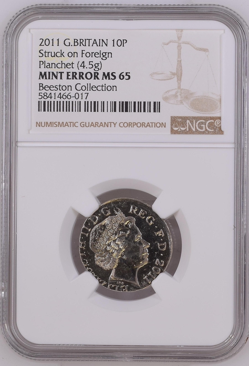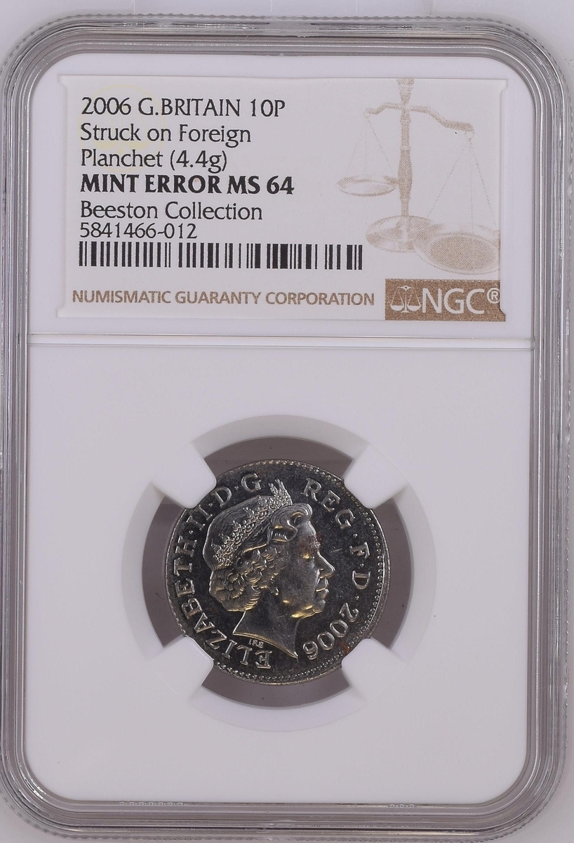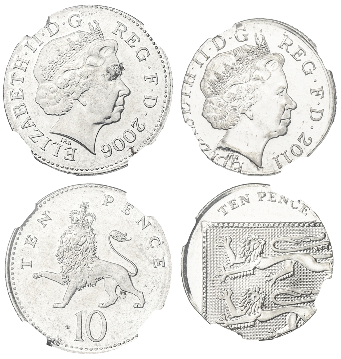 NGC MINT ERROR MS64 | Elizabeth II (1952-2022), 10 Pence, 2006, Struck on a Foreign Planchet Mint Error, edge plain, 4.4g, 12h (S.F5), ex. Beeston Collection, uncirculated, extremely fine, in NGC holder, graded MINT ERROR MS64 ~ Struck on a Foreign Planchet (Cert. #5841466-012); also NGC MINT ERROR MS65 | 10 Pence, 2011, Struck on a Foreign Planchet Mint Error, edge plain, 4.5g, 12h (S.F7), ex. Beeston Collection, uncirculated, extremely fine, in NGC holder, graded MINT ERROR MS65 ~ Struck on a Foreign Planchet (Cert. #5841466-017) (2)