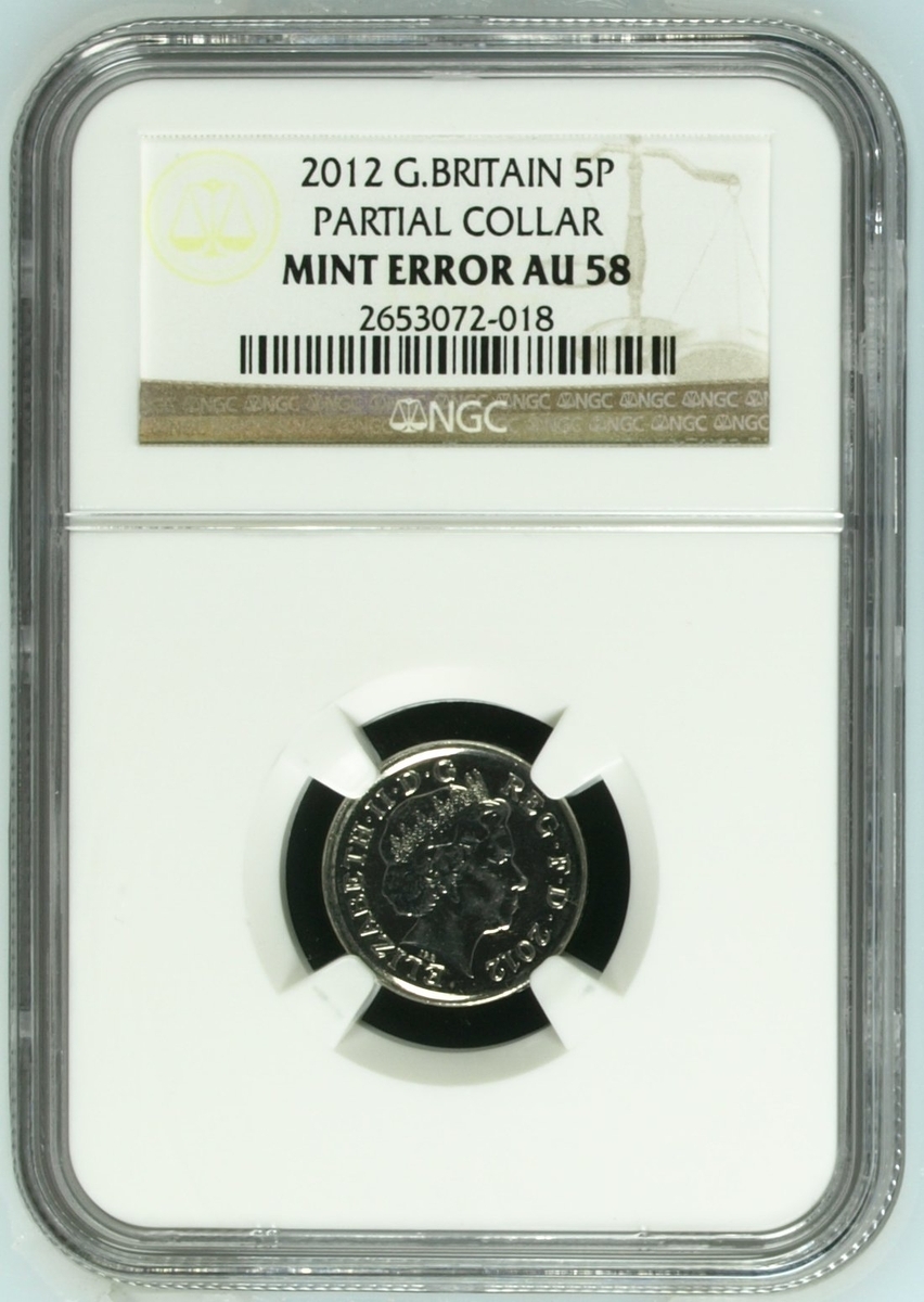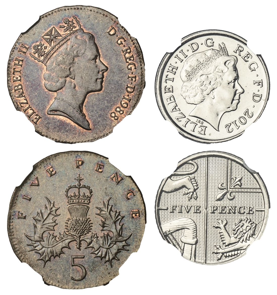 NGC MINT ERROR MS64 BN | Elizabeth II (1952-2022), 5 Pence, 1988, Struck on a 1C Blank Mint Error, edge plain, 3.6g, 1h (S.D3), uncirculated, residual lustre, extremely fine, in NGC holder, graded MINT ERROR MS64 BROWN ~ Struck on 1C Blank Mint Error (Cert. #6029788-005); and also NGC MINT ERROR AU58 | 5 Pence, 2012, Partial Collar Mint Error, edge milled/plain, 12h (S.D7), uncirculated, near extremely fine, in NGC holder, graded MINT ERROR AU58 ~ Partial Collar (Cert. #2653072-018) (2)