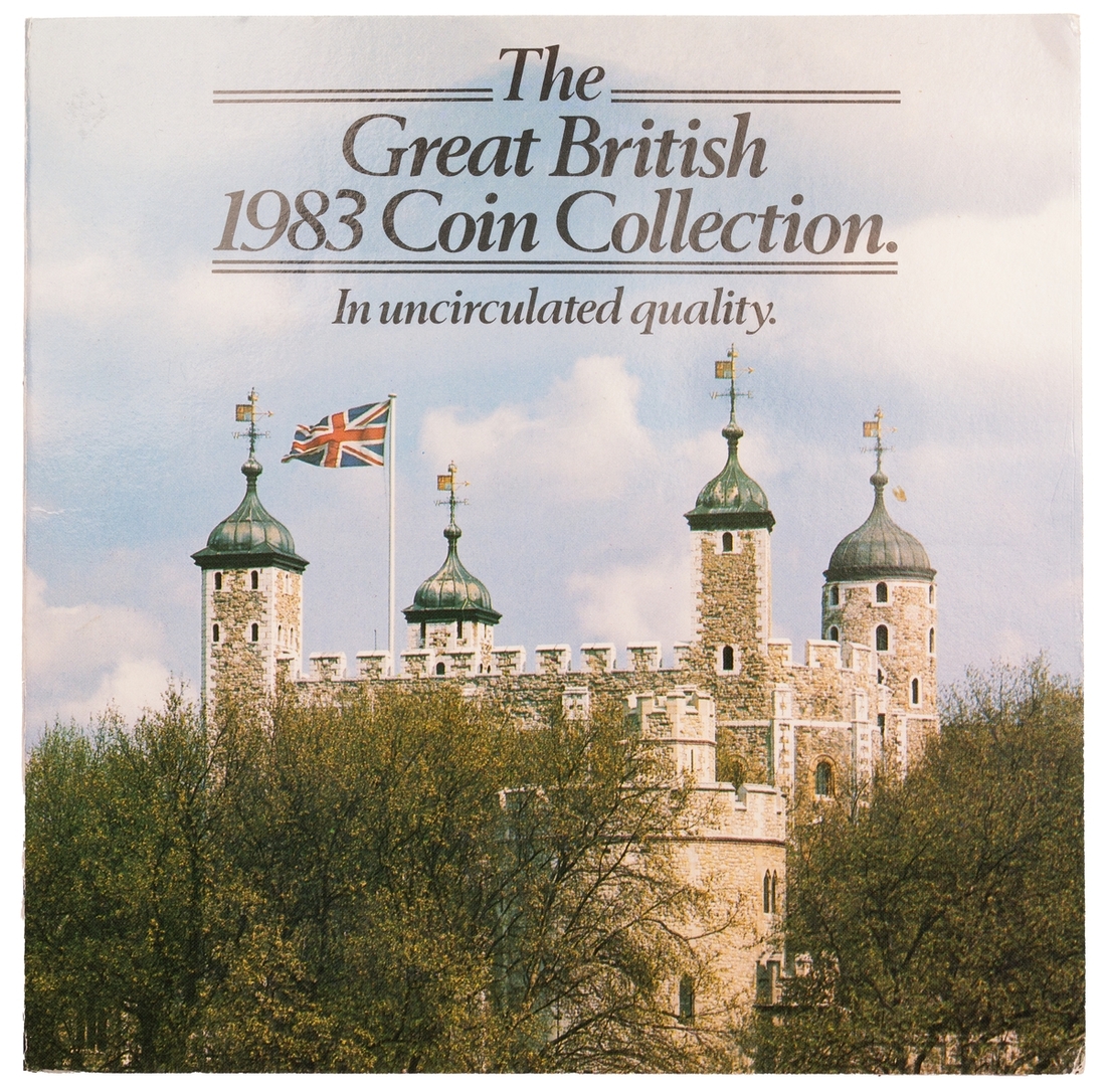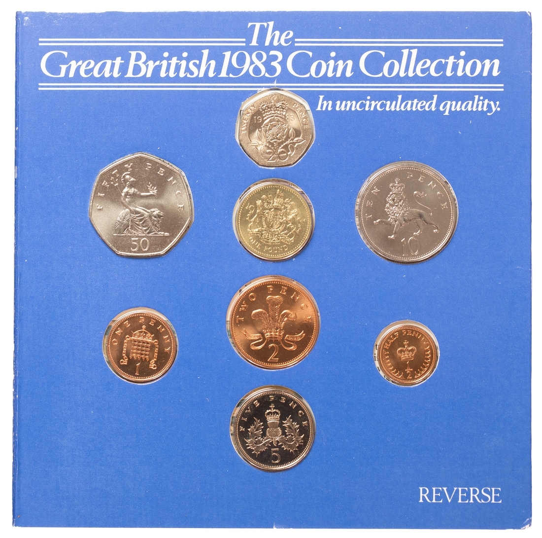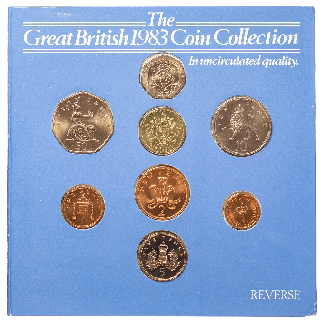 The Fabled 1983 'Martini' Set & Regular Issue (16) | Elizabeth II (1952-2022), Royal Mint 'Martini Set', 1983, One Pound to Halfpenny (8), including Mule 'NEW PENCE' Two Pence (S.C2A), sealed annual set in original Royal Mint presentation case and with Martini compliments slip, as struck; alongside the regular 1983 Coin Collection Set without the error coin, reading 'TWO PENCE' (16)