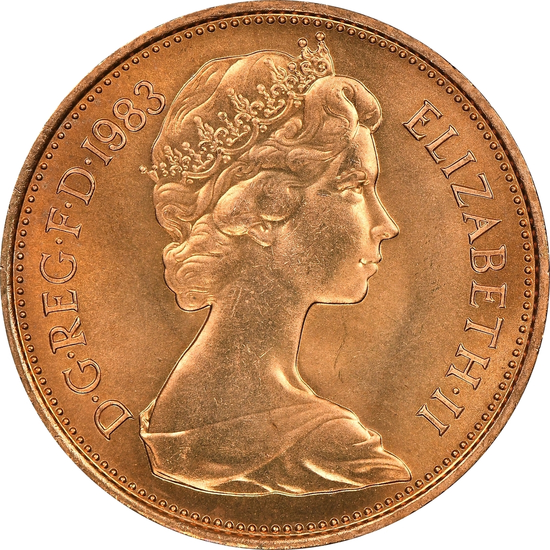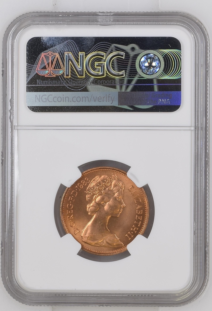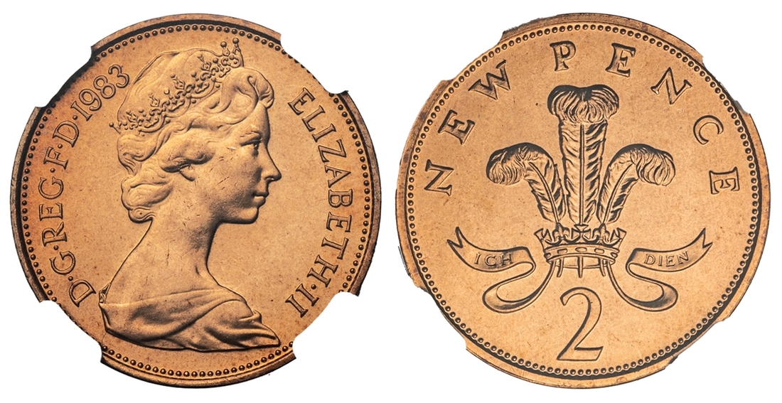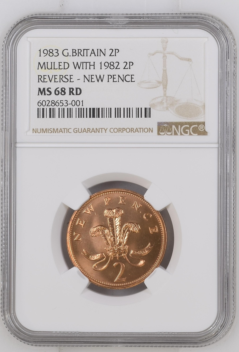 NGC MS68 RD | *Top Pop* | Elizabeth II (1952-2022), 2 Pence, 1983, 'Muled with 1982 2 Pence' Mint Error, NEW PENCE, edge plain, 12h, (cf. S.C1/C2), light edge knock, otherwise slightly off flan, otherwise good very fine, in NGC holder, graded MS68 RED (Cert. #6028653-001) [*Single Finest Certified*]