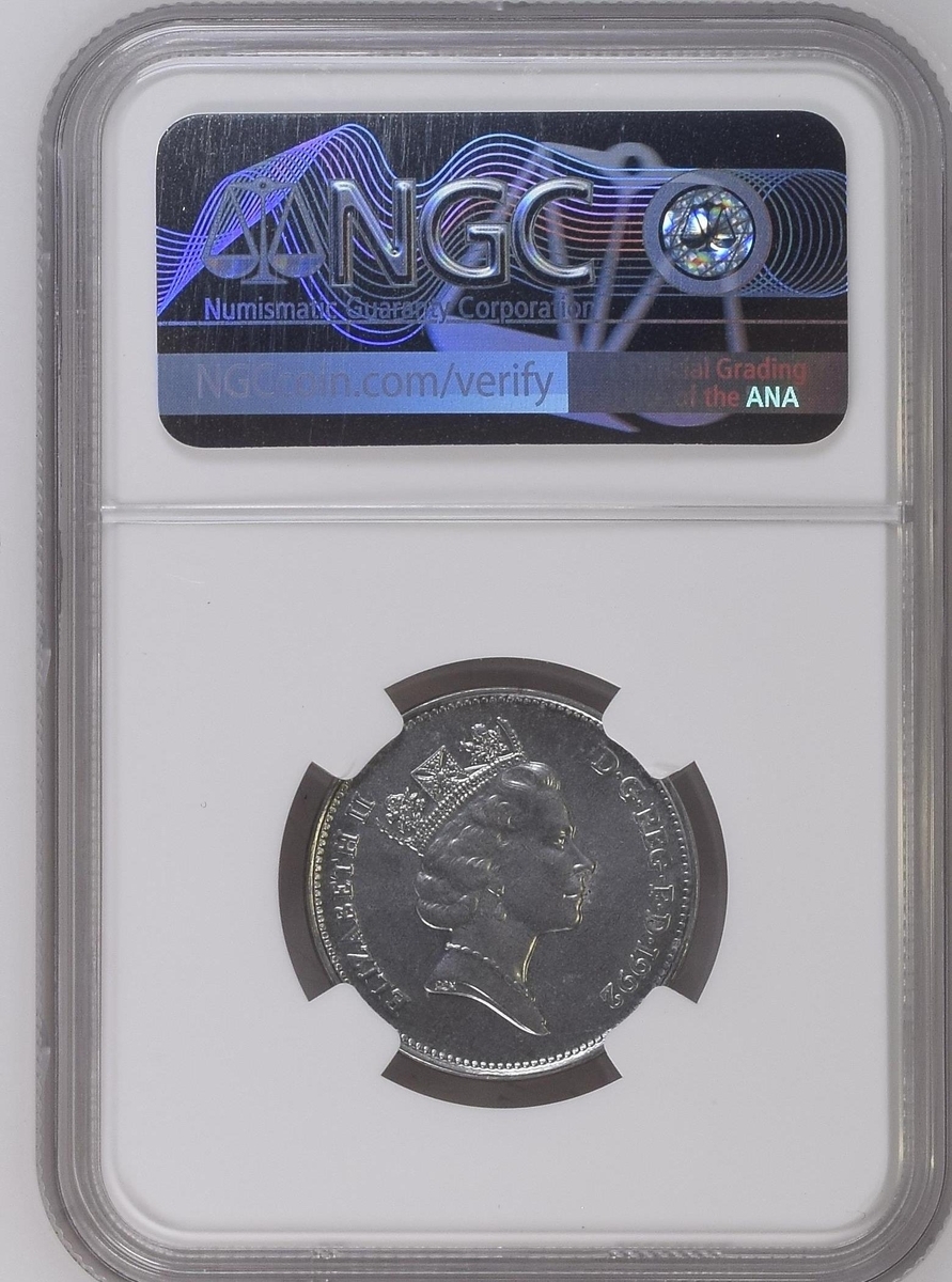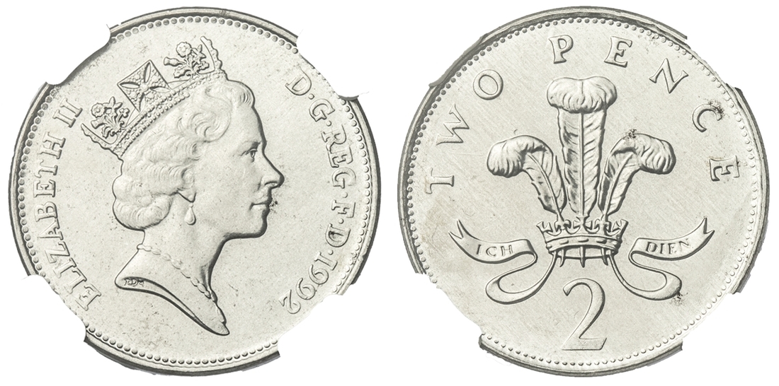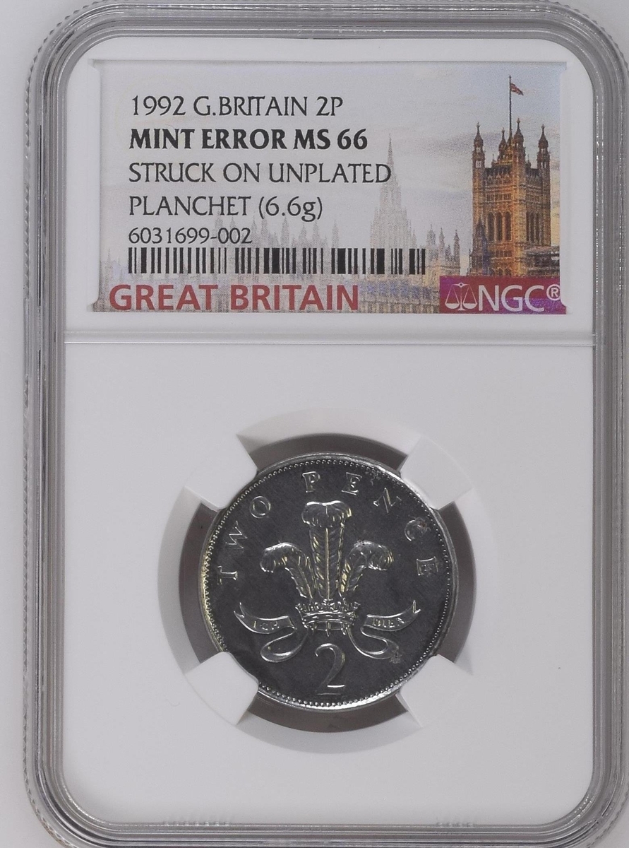 NGC MINT ERROR MS66 | Elizabeth II (1952-2022), 2 Pence, 1992, 'Struck on Unplated Planchet' Mint Error, edge plain, 6.6g, 12h, (cf. S.C3), uncirculated, extremely fine, in NGC holder, graded MINT ERROR MS66 (Cert. #6031699-002)
