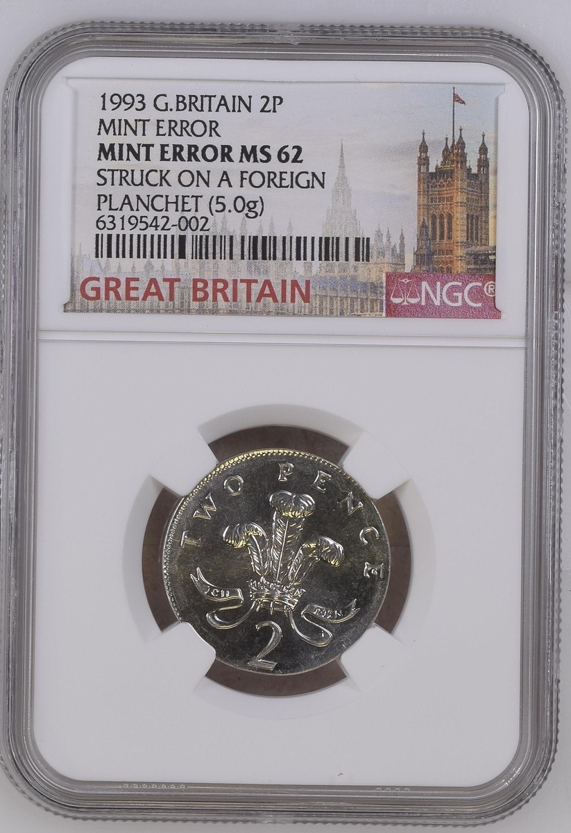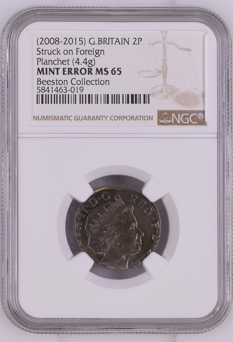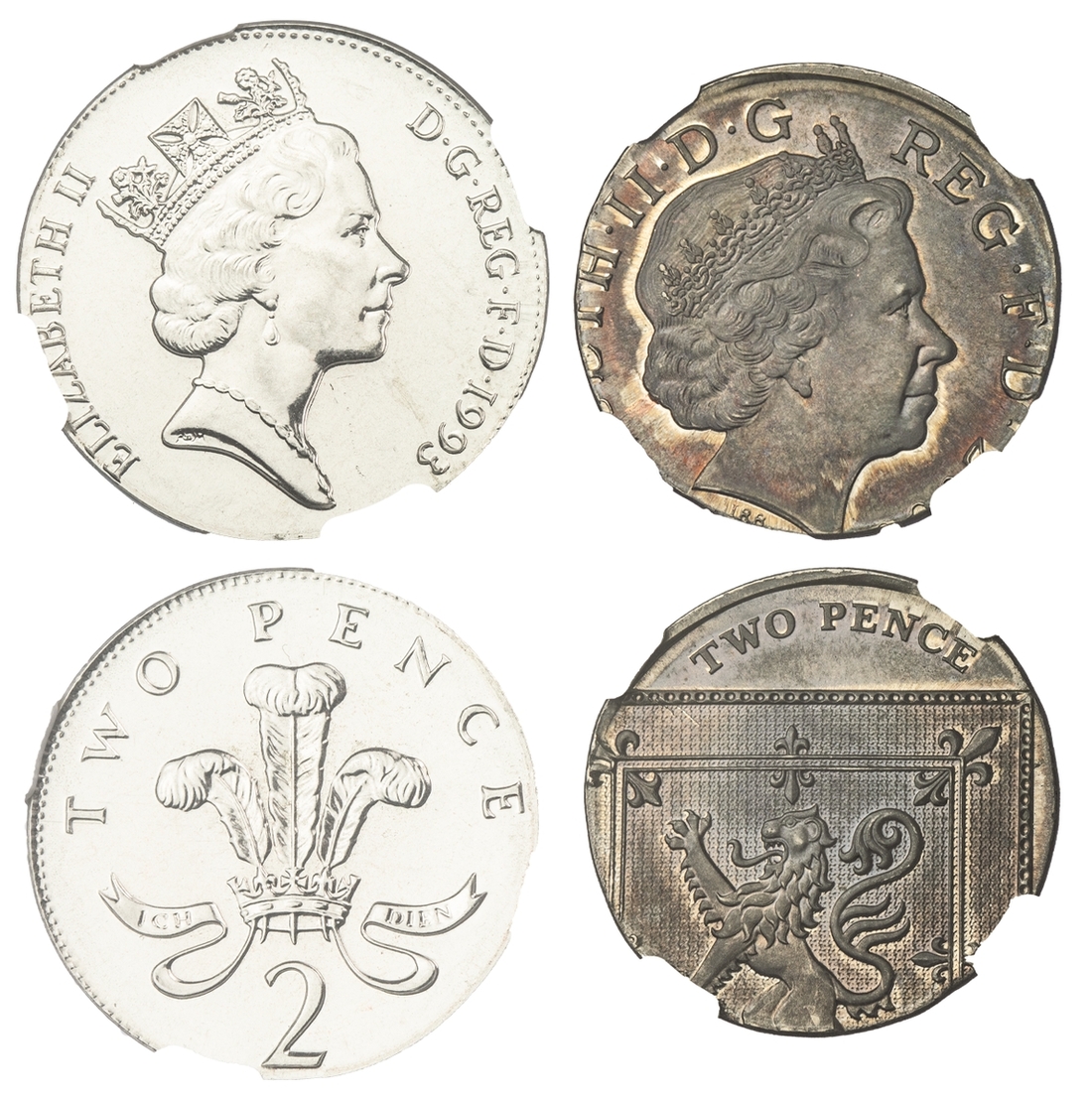 NGC MINT ERROR MS66 BN | Elizabeth II (1952-2022), 2 Pence, 1971, Broadstruck with Curved Clip at 12 o'clock, edge plain, 12h (S.C1), uncirculated, extremely fine, in NGC holder, graded MINT ERROR MS66 BROWN ~ Broadstruck with Curved Clip at 12 o'clock (Cert. #6029788-001); and also NGC MINT ERROR MS62 | 2 Pence, 1993, Struck on a Foreign Planchet, edge plain, 5.0g, 1h (S.C4), uncirculated, extremely fine, in NGC holder, graded MINT ERROR MS62 ~ Struck on a Foreign Planchet (Cert. #6319542-002); and also NGC MINT ERROR MS65 | 2 Pence, 2008-2015, Struck on a Foreign Planchet, edge plain, 4.4g, 1h (S.C6), ex. Beeston Collection, uncirculated, residual lustre, extremely fine, in NGC holder, graded MINT ERROR MS65 ~ Struck on a Foreign Planchet (Cert. #5841463-019) (3)