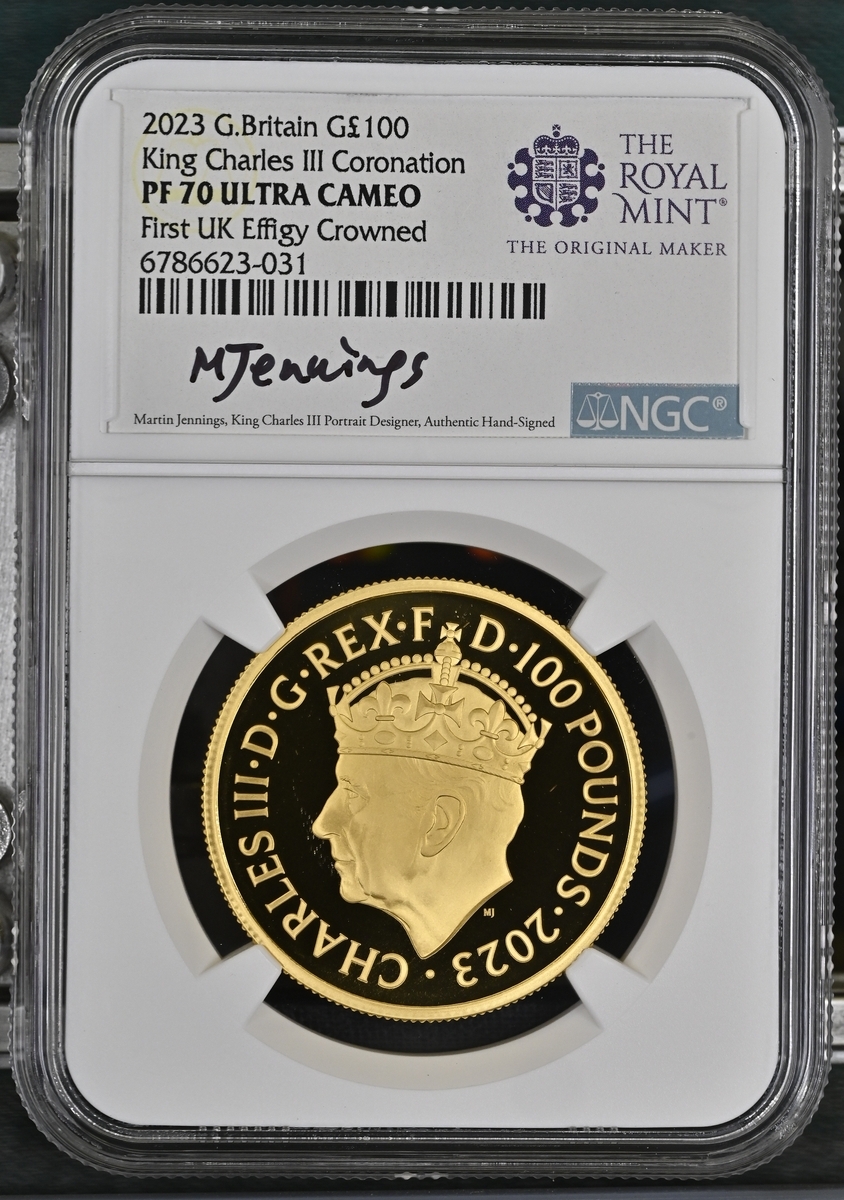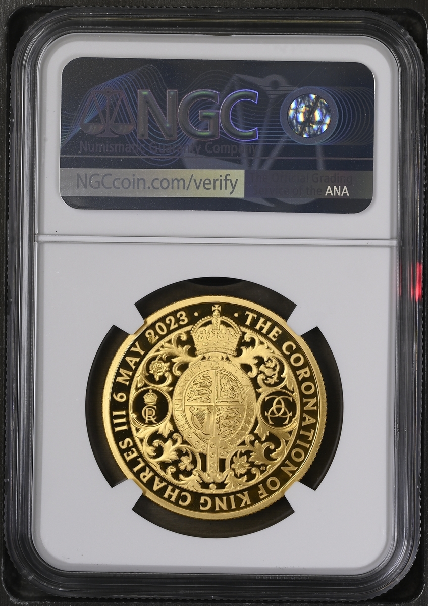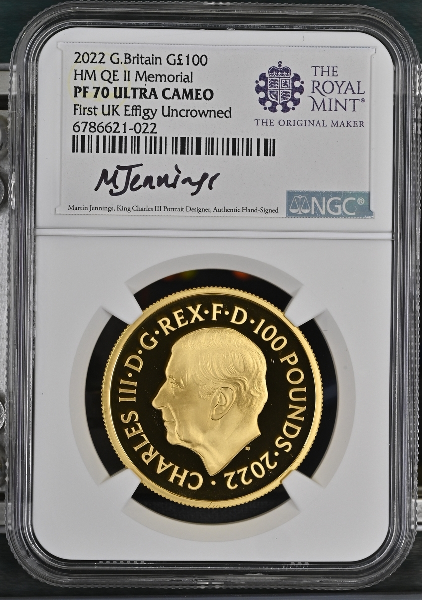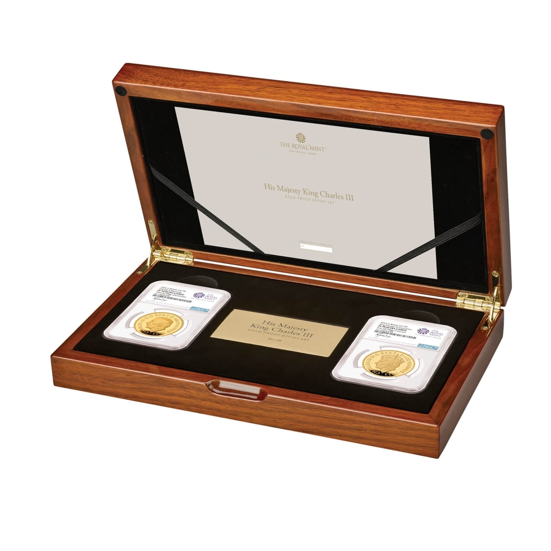 (g) NGC PF70 UCAM | *Top Pop* | Charles III (2022-Present), Gold Proof Effigy Set (2), 2023, £100, 'HM QE II Memorial - First UK Effigy Uncrowned'; 'King Charles III Coronation - First UK Effigy Crowned', all in gold, edge plain, 12h, brilliant, as struck, comes in Royal Mint box, [No. 69 of 75], both in NGC holders, graded PF70 ULTRA CAMEO *Top Pop* (Cert. #6786621-022 and 6786623-031) (2)
