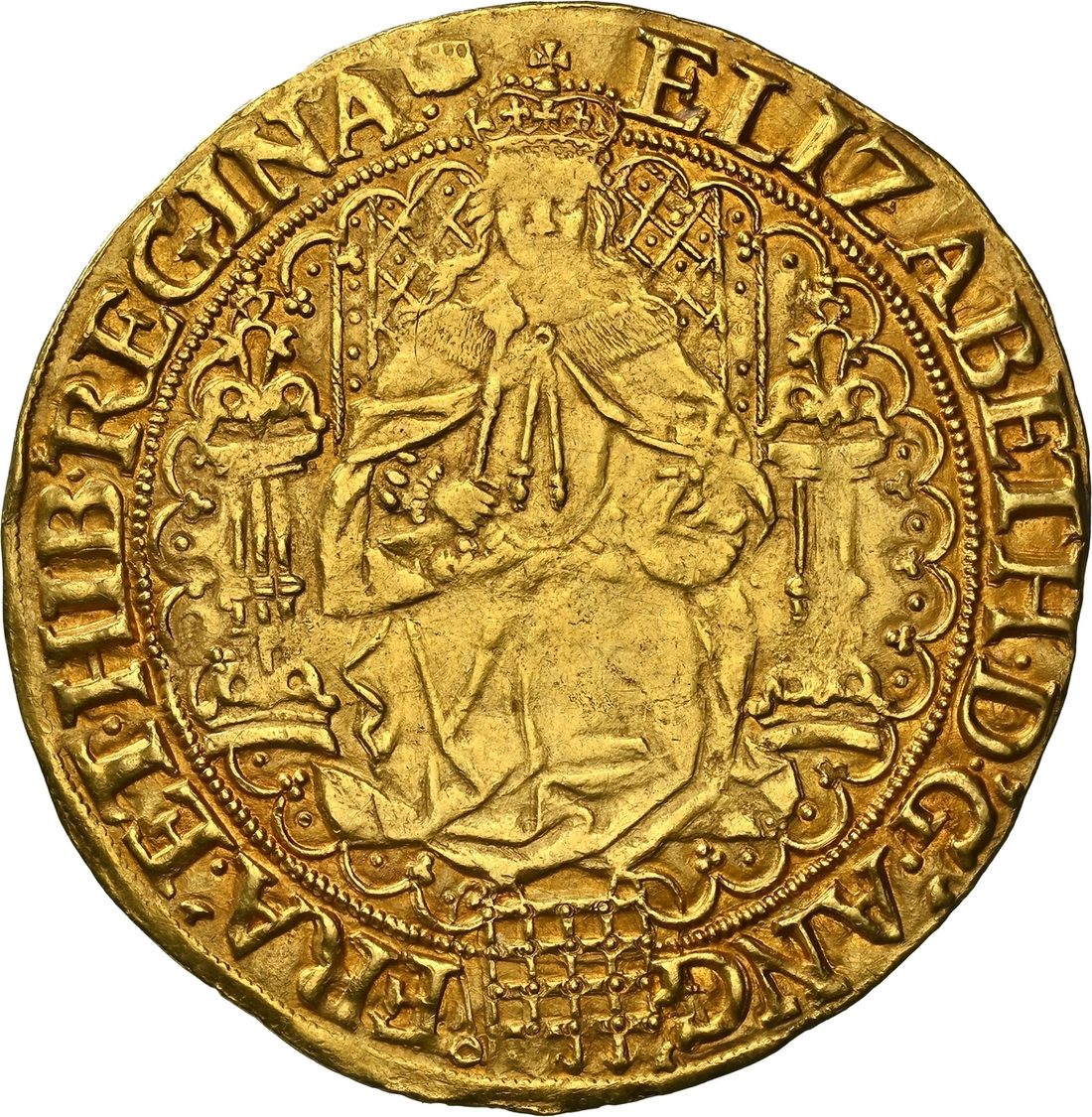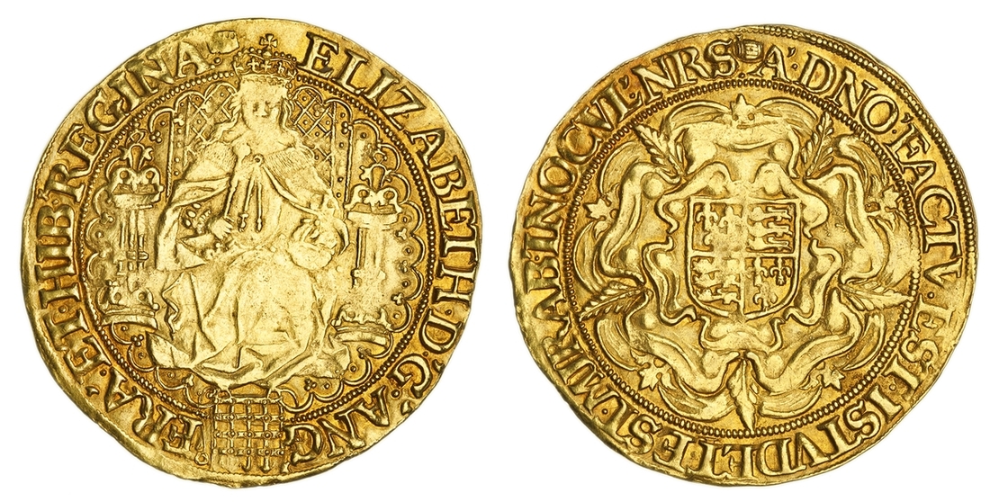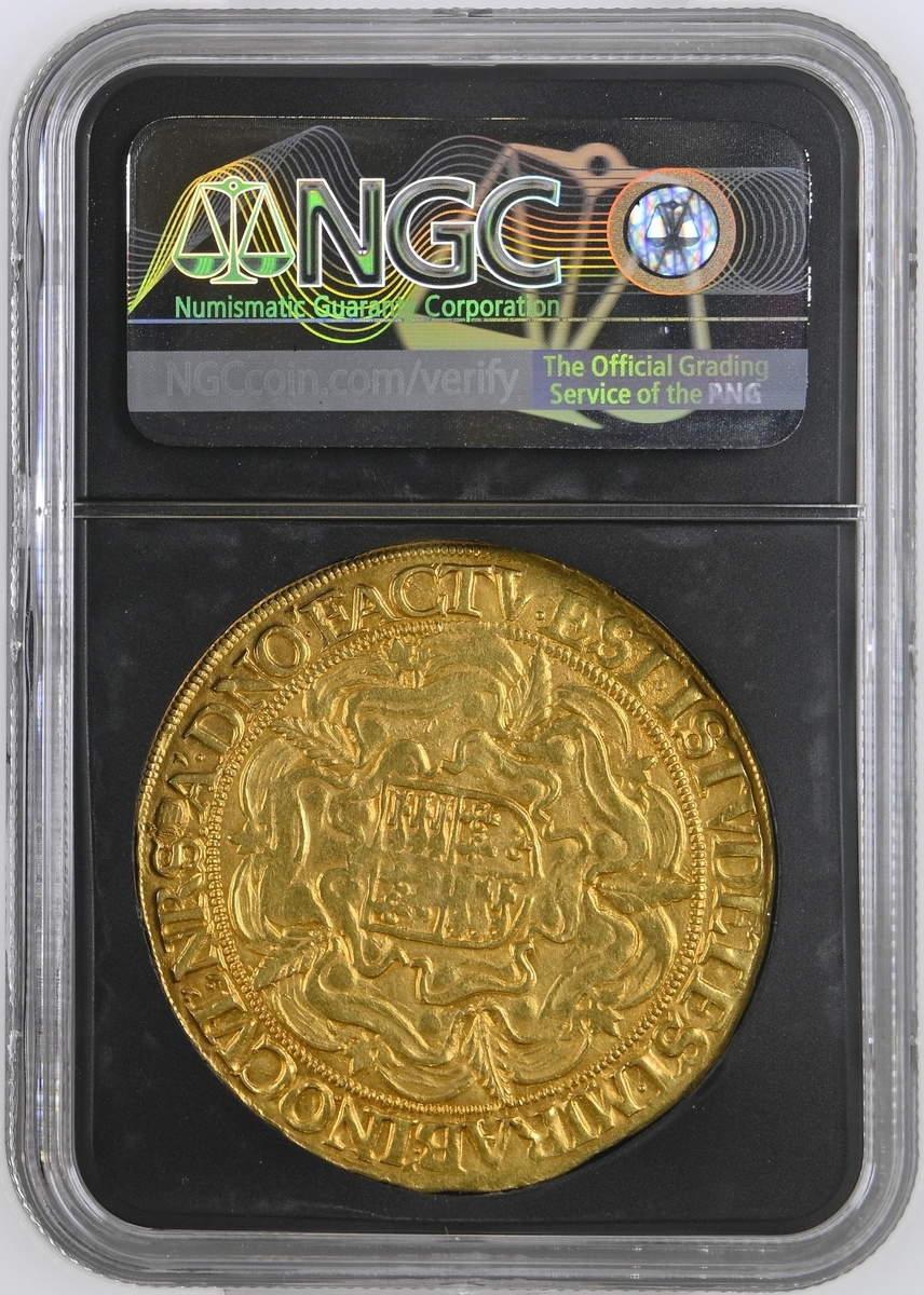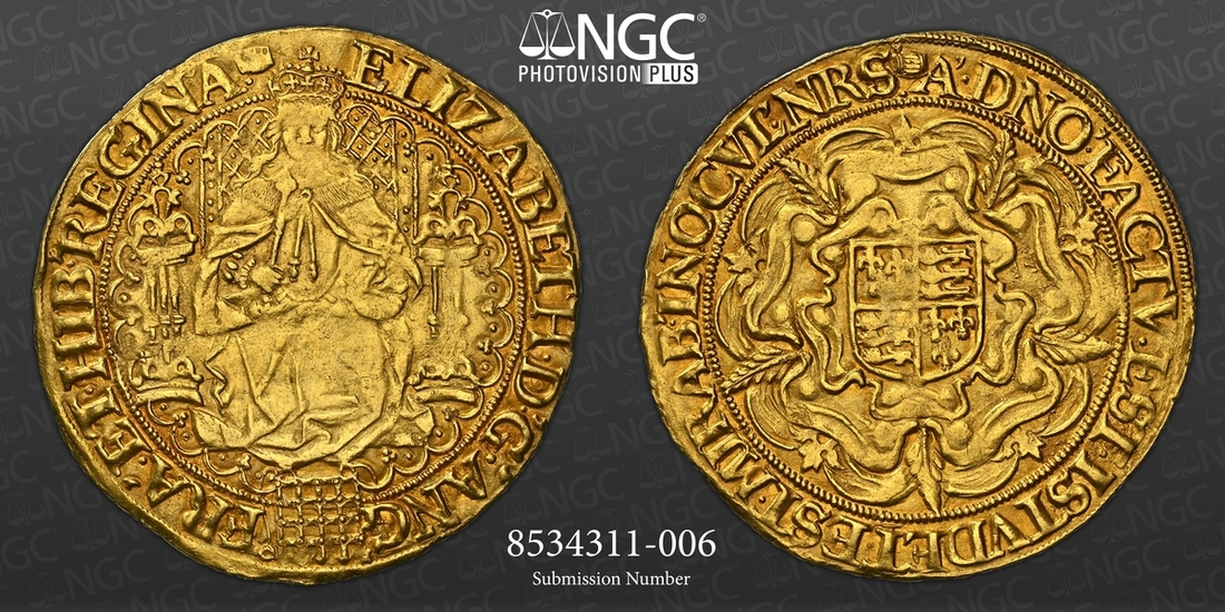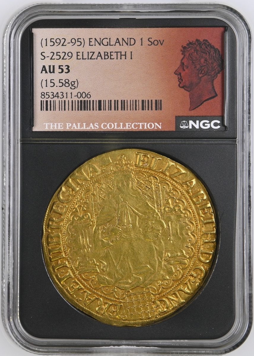 (x) NGC AU53 | Elizabeth I (1558-1603), Second 'Restoration' Coinage, Sixth Issue, Double Rose Noble of 30-Shillings or Fine Sovereign, 1 February 1592 - 8 May 1594, Tower, ELIZABETH • D •' G •' ANG ' | FRA '. ET • HIB •' REGINA . (m.m.), Queen seated on ornamented throne, adorned with fine lattice work enclosing pellets, pillars decorated with five smaller pellets, holding orb and sceptre, portcullis with chains below, breaking ornate tressure, rev. (m.m.) A'•DNO'•FACTV•EST•ISTVD ET•EST•MIRAB'•IN.OCVL'•NRS. Royal arms in centre of full-blown Tudor Rose, 15.539g [239.80grns], 10h, m.m. tun (Brown & Comber A26 [Type i b]; Holloway 18-25 [9 Recorded]; Schneider I, 783 same obverse die; North 2003; S.2529), softness of strike to visage, otherwise attractively cabinet toned with auburn hues overlying natural lustre, about very fine, the peripheries bolder, a wholesome and thoroughly pleasing example, in NGC Black 'Pallas' holder, graded AU53 (Cert. #8534311-006)