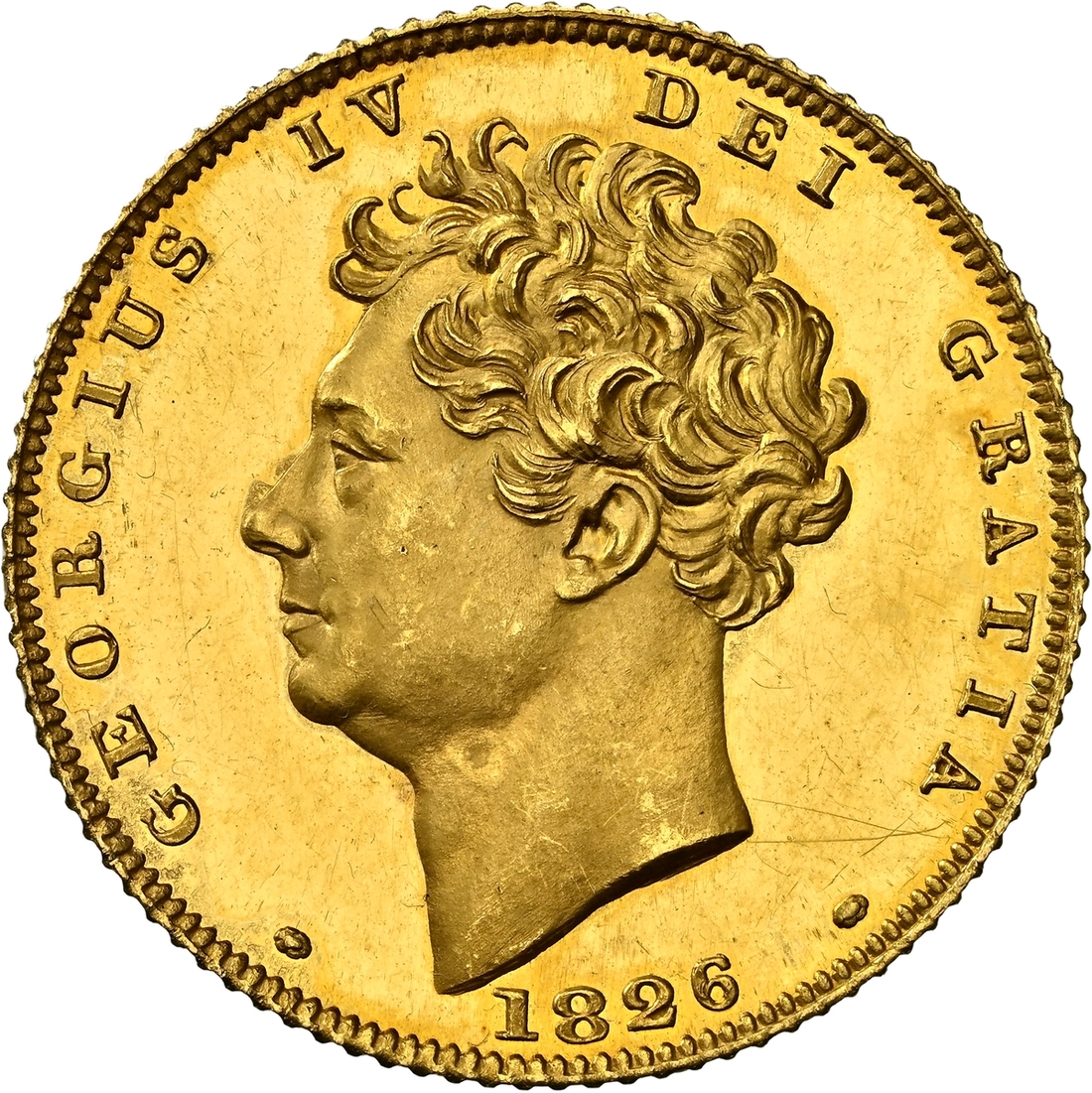 (g) NGC PF63+ UCAM | George IV (1820-1830), Proof Half-Sovereign, 1826, bare head left, with extra tuft, rev. crowned garnished shield, edge milled, 4.007g, 7h (Douglas-Morris -, cf. 153; Stratos 217; W&R 249 variety; Hill 407C; EGC II, 999; S.3804), some haziness in otherwise brilliant fields, the portrait with playful cameo definition, a pleasingly good extremely fine, in NGC Black 'Pallas' holder, graded PROOF 63+ ULTRA CAMEO (Cert. #8534315-001)