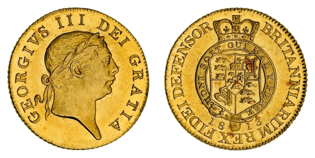 (g) NGC MS64 | George III (1760-1820), 'Military' Guinea, 1813, by Nathaniel Marchant, sixth laureate head right, rev. crowned shield within Garter, edge chevron milled, 8.375g, 12h (MCE 404; Farey 1390; EGC I, 737; Douglas-Morris 118; Selig 1037-1038; King 184; Schneider II, - [cf. 611]; Stratos 113; St. Albans 29 [NGC MS63]; S.3730), minor reddish toning spots in mint 'fresh' fields, choice FDC, a SENSATIONAL example of this popular one-year "Redcoat" issue, in NGC Black 'Pallas' holder, conservatively graded MS64 (Cert. #8534314-005)