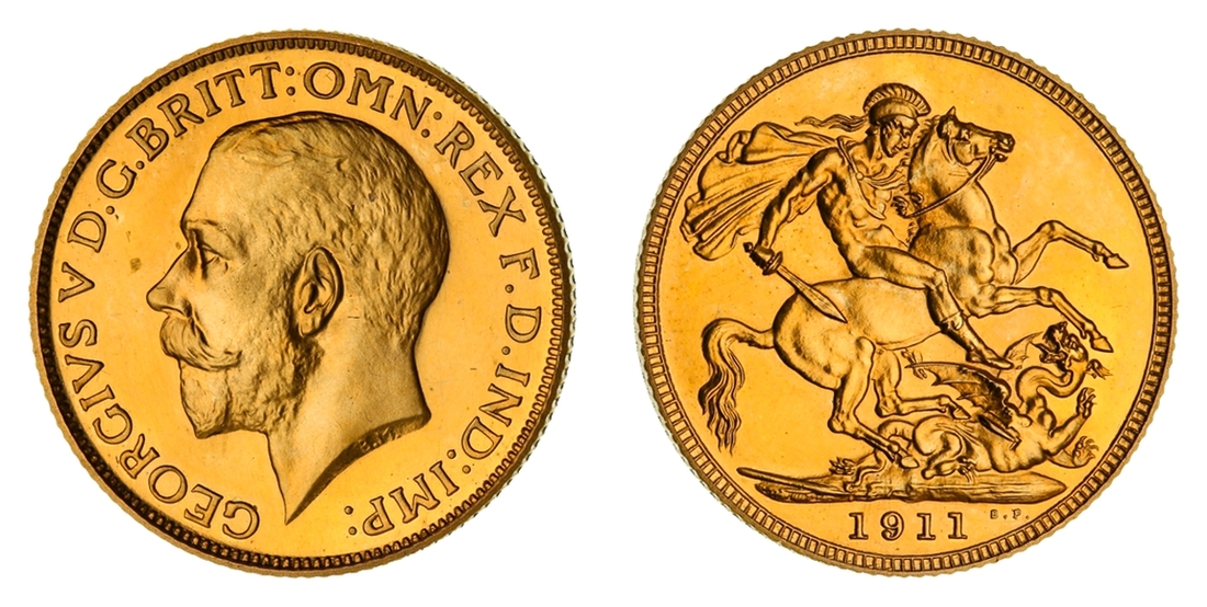 (g) NGC PF64 | George V (1910-1936), Coronation 'Specimen' Proof Sovereign, 1911, bare head left, rev. St. George and Dragon, edge milled, 7.982g, 12h (Stratos 148; Marsh 213A; W&R 416; EGC II, 1433; S.3996), light speckles otherwise with handsome orange peel toning, brilliantly choice, as struck, in NGC Black 'Pallas' holder, graded PF64 (Cert. #8534315-006)