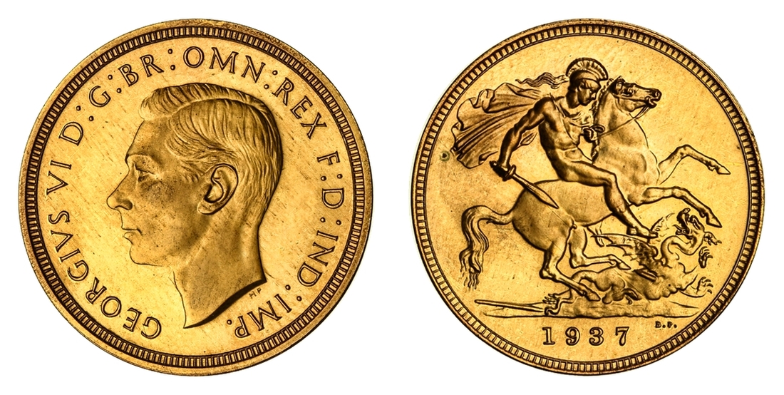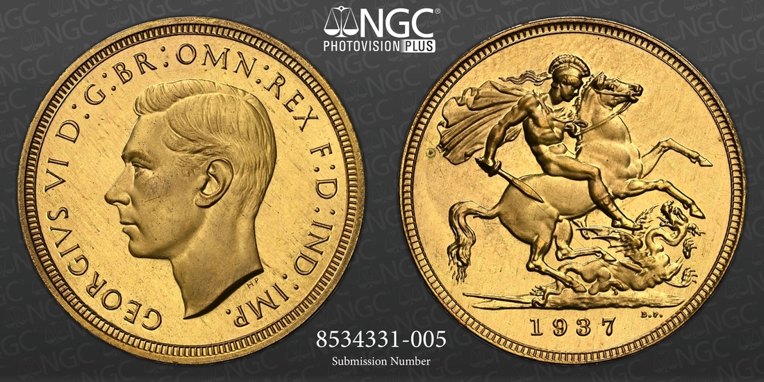 (g) NGC PF66 CAM | George VI (1936-1952), Coronation 'Specimen' Proof Sovereign, 1937, bare head left, rev. St George and Dragon, edge plain, 7.98g*, 11h (Marsh 296C; W&R 439; EGC II, 1461; S.4076), a small toning spot behind cape, and with toning striations across brilliant fields, much as struck, in NGC Black 'Pallas' holder, graded PROOF 66 CAMEO (Cert. #8534331-005)