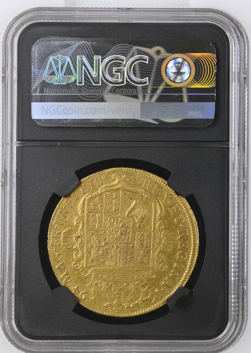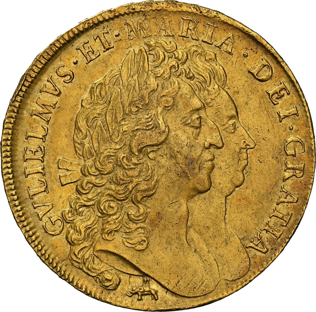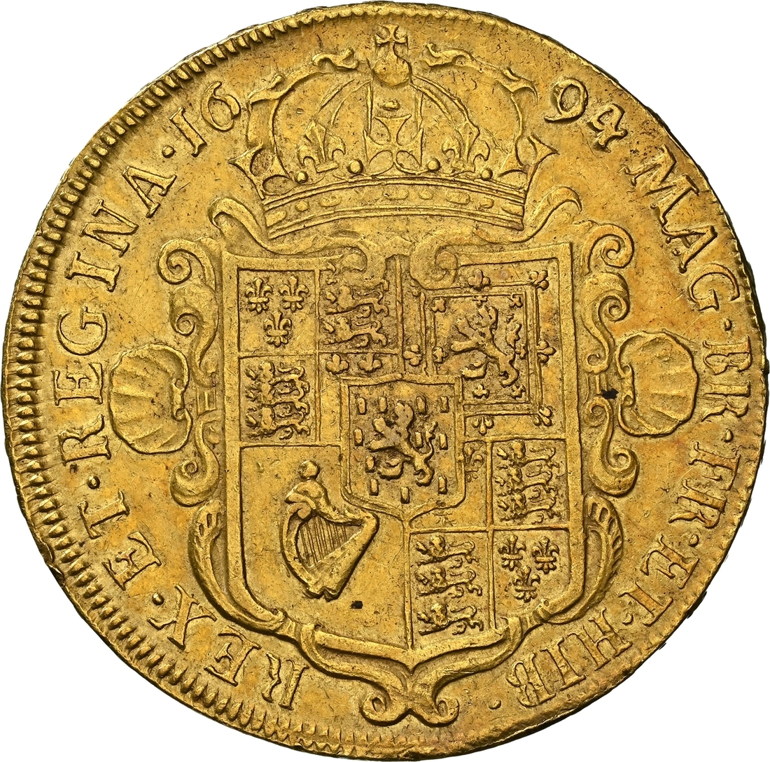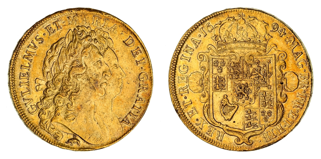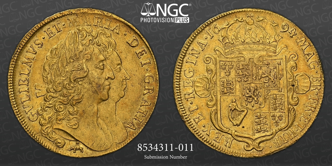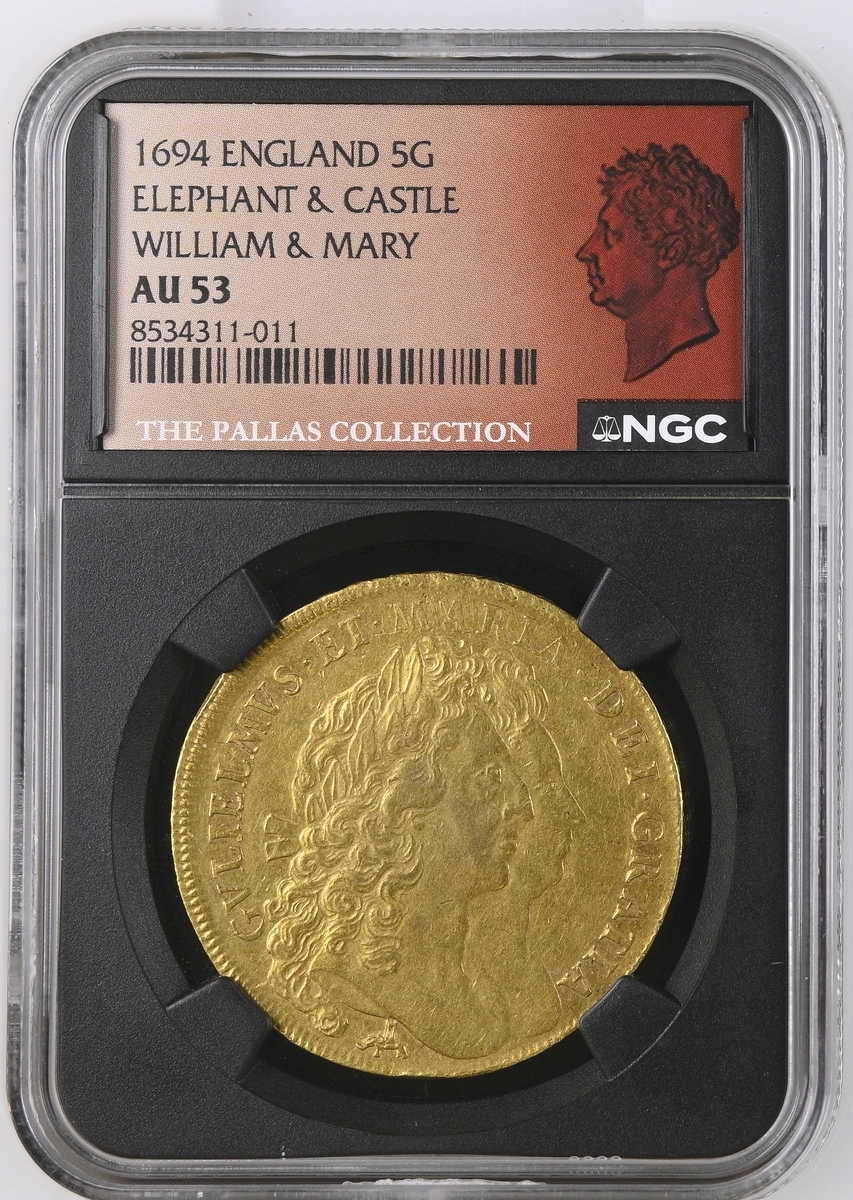 (x) NGC AU53 | William and Mary (1688-1694), 'Royal African Company', Five-Guineas, 1694 SEXTO, Elephant and Castle, conjoined laureate busts right, E&C below, rev. crowned and garnished shield, raised letter •+• DECVS • ET • TVTAMEN • • ANNO • REGNI • SEXTO •+• upwards on edge, 41.750g [644.30grns], 6h (MCE 143; EGC I, 352 [R4]; S.3423), lightly toned and lustrous, a pleasingly good very fine / near extremely fine, in NGC Black 'Pallas' holder, graded AU53 (Cert. #8534311-011)