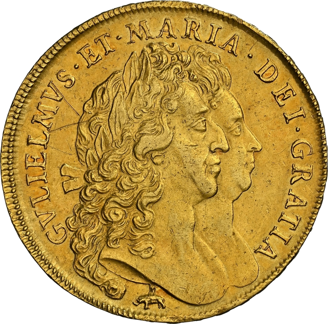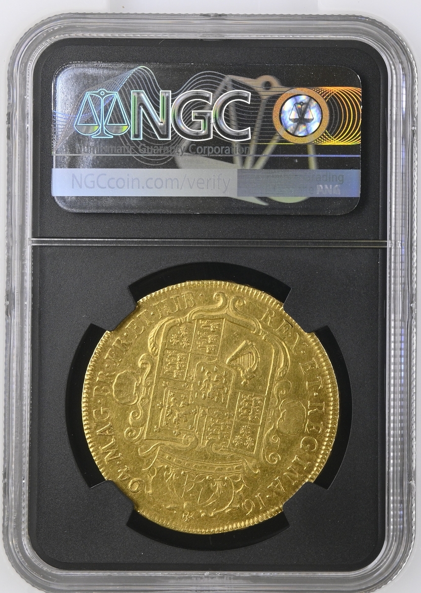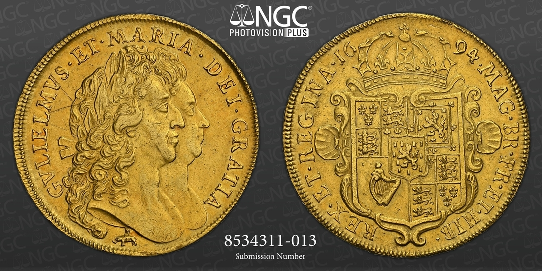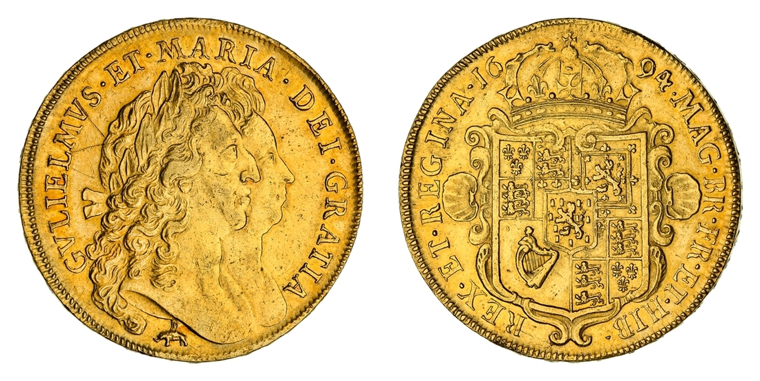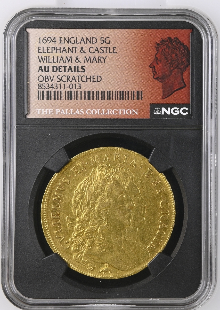 (x) NGC AU | William and Mary (1688-1694), 'Royal African Company', Five-Guineas, 1694 over 3 SEXTO, Elephant and Castle, conjoined laureate busts right, E&C below, rev. crowned and garnished shield, raised letter •+• DECVS • ET • TVTAMEN • • ANNO • REGNI • SEXTO •+• upwards on edge, 41.516g [640.69grns], 6h (MCE 143; EGC I, 352 [R4]; S.3423), unfortunate scratches by crown of King's head and contact mark on his cheek, otherwise handsomely lustrous with a hint of cabinet tone, an attractively bold and honest example, almost extremely fine, scarce thus, in NGC Black 'Pallas' holder, fairly graded Almost Uncirculated (Cert. #8534311-013)
