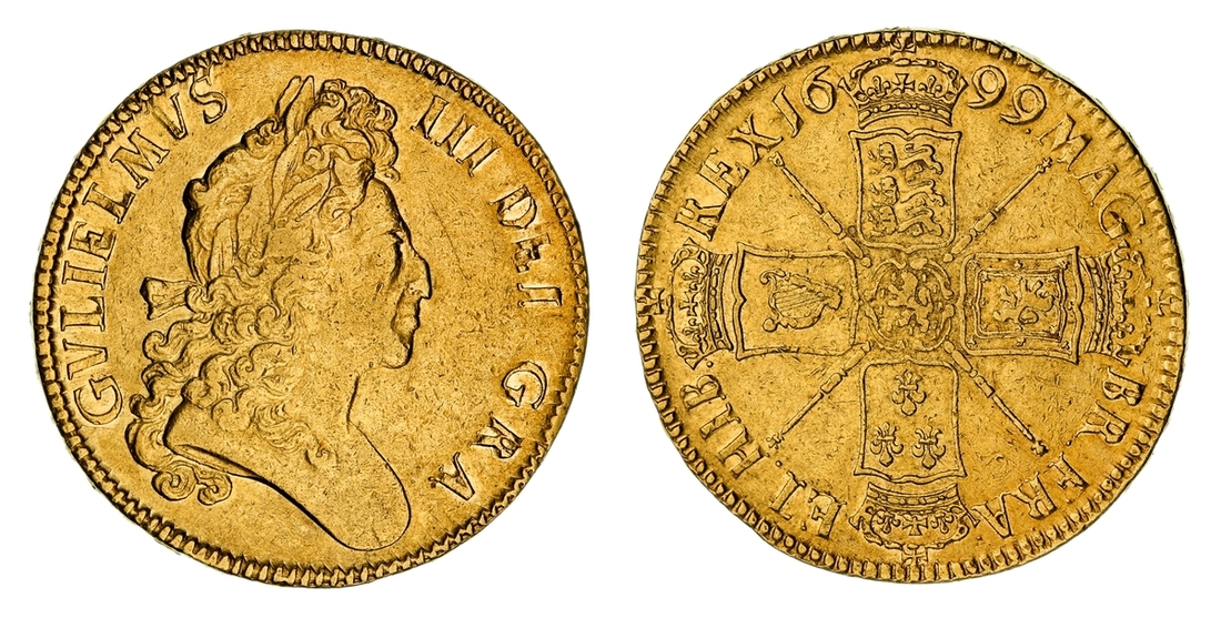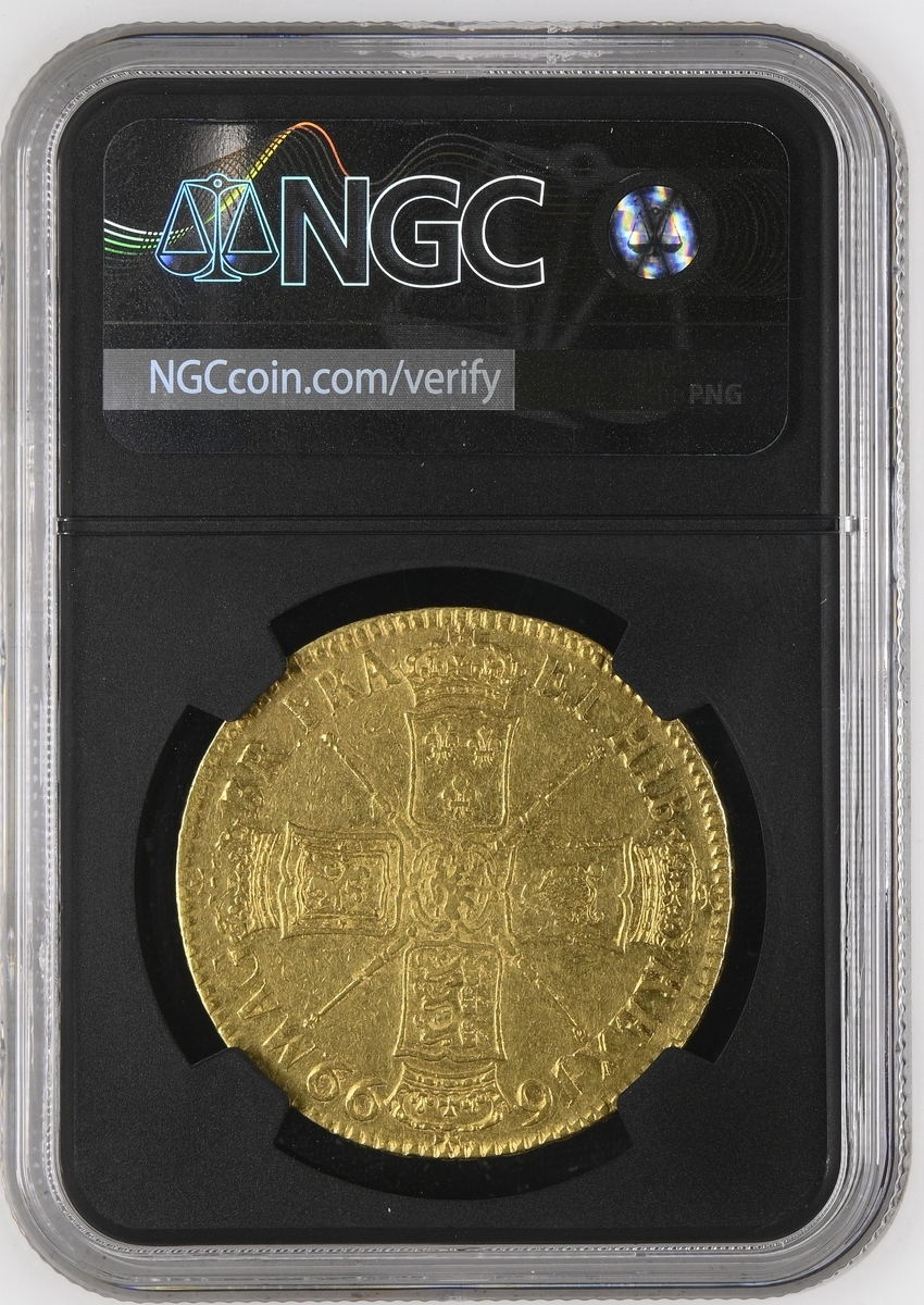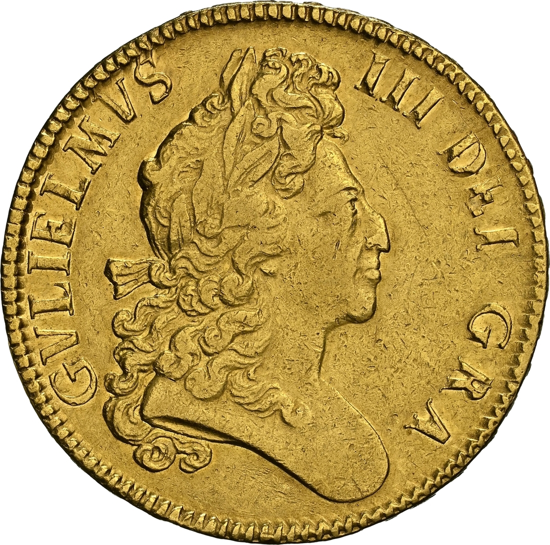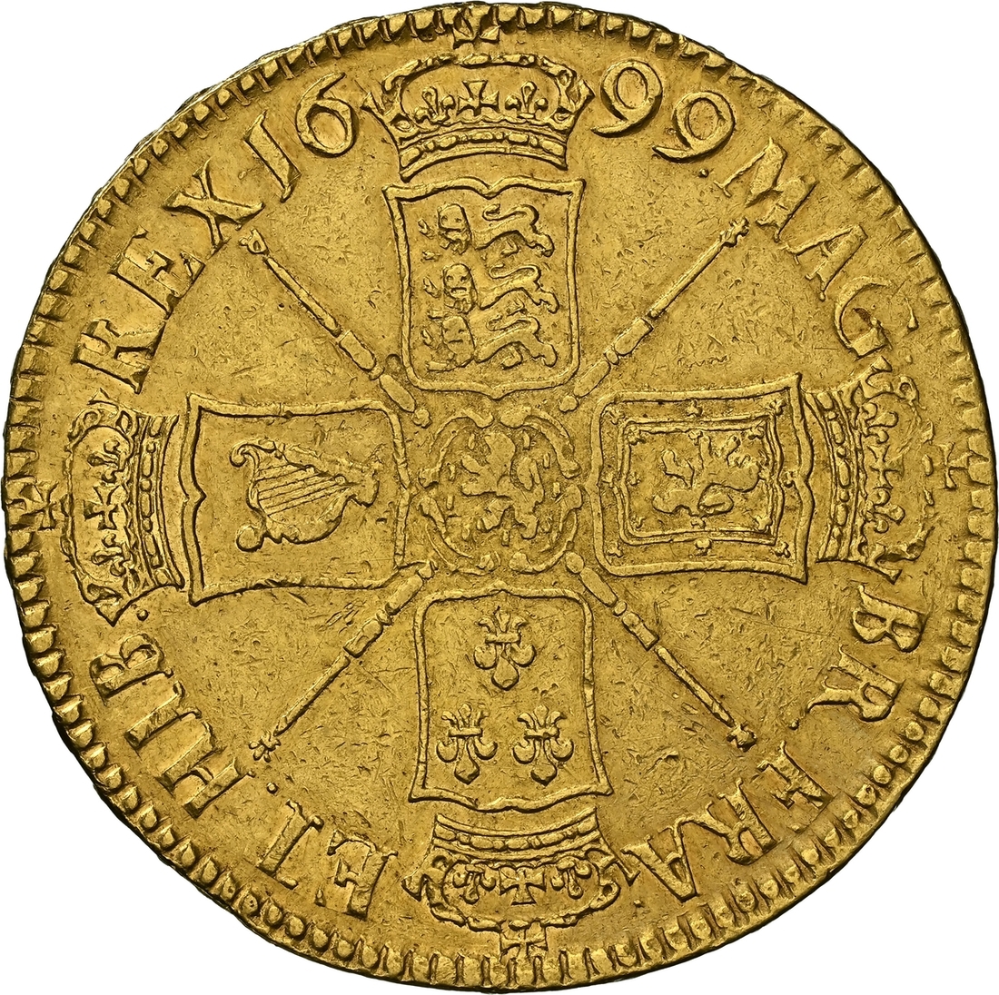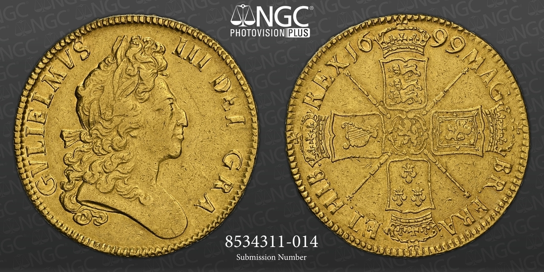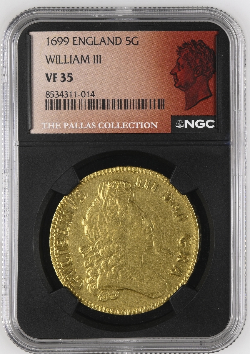 (x) NGC VF35 | William III, Solus (1694-1702), Five-Guineas, 1699 UNDECIMO, GVLIELMVS III DEI GRA, laureate head right, plain below by truncation, rev. crowned shields cruciform, emblem-adorned sceptres in angles, raised letter +• DECVS • ET • TVTAMEN • • ANNO • REGNI • UNDECIMO • upwards on edge, with a lower case U in UNDECIMO; an inverted N in TVTAMEN; and blocked Vs resembling "inverted As", 41.583g [641.72grns], 5h (Schneider II, 478; King 134-135; Stratos -; MCE 169; EGC I, 394; GH 58; S.3454), lightly bagmarked with rub to portrait, residually lustrous, about very fine, the reverse bolder and surprisingly rare, the first to be offered in these rooms in over a decade, in NGC Black 'Pallas' holder, graded VF35 (Cert. #8534311-014)