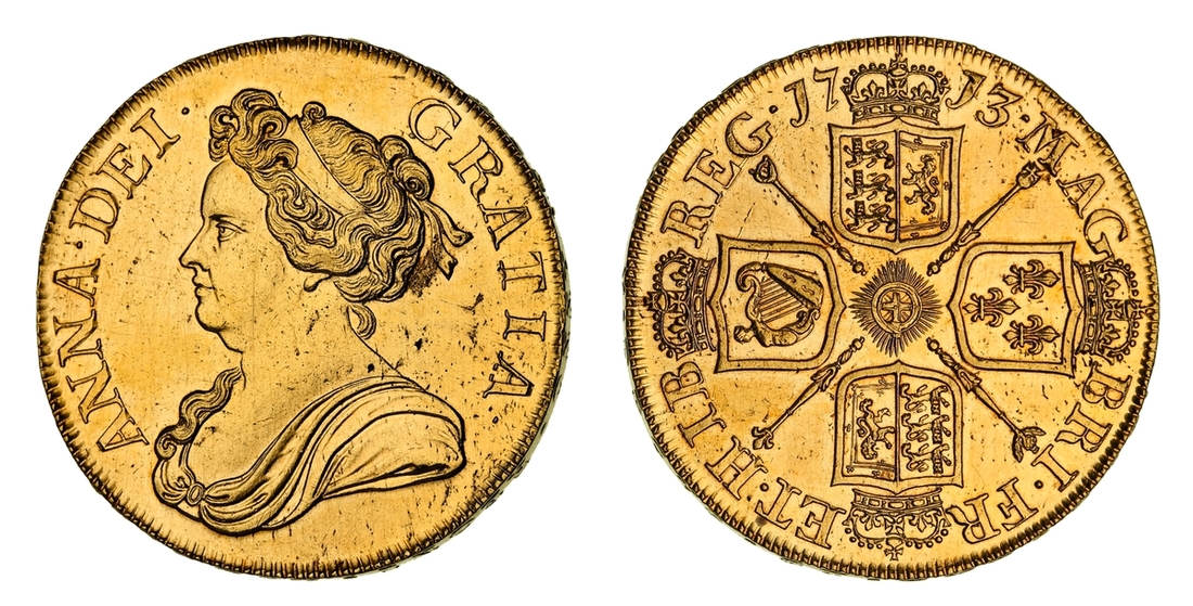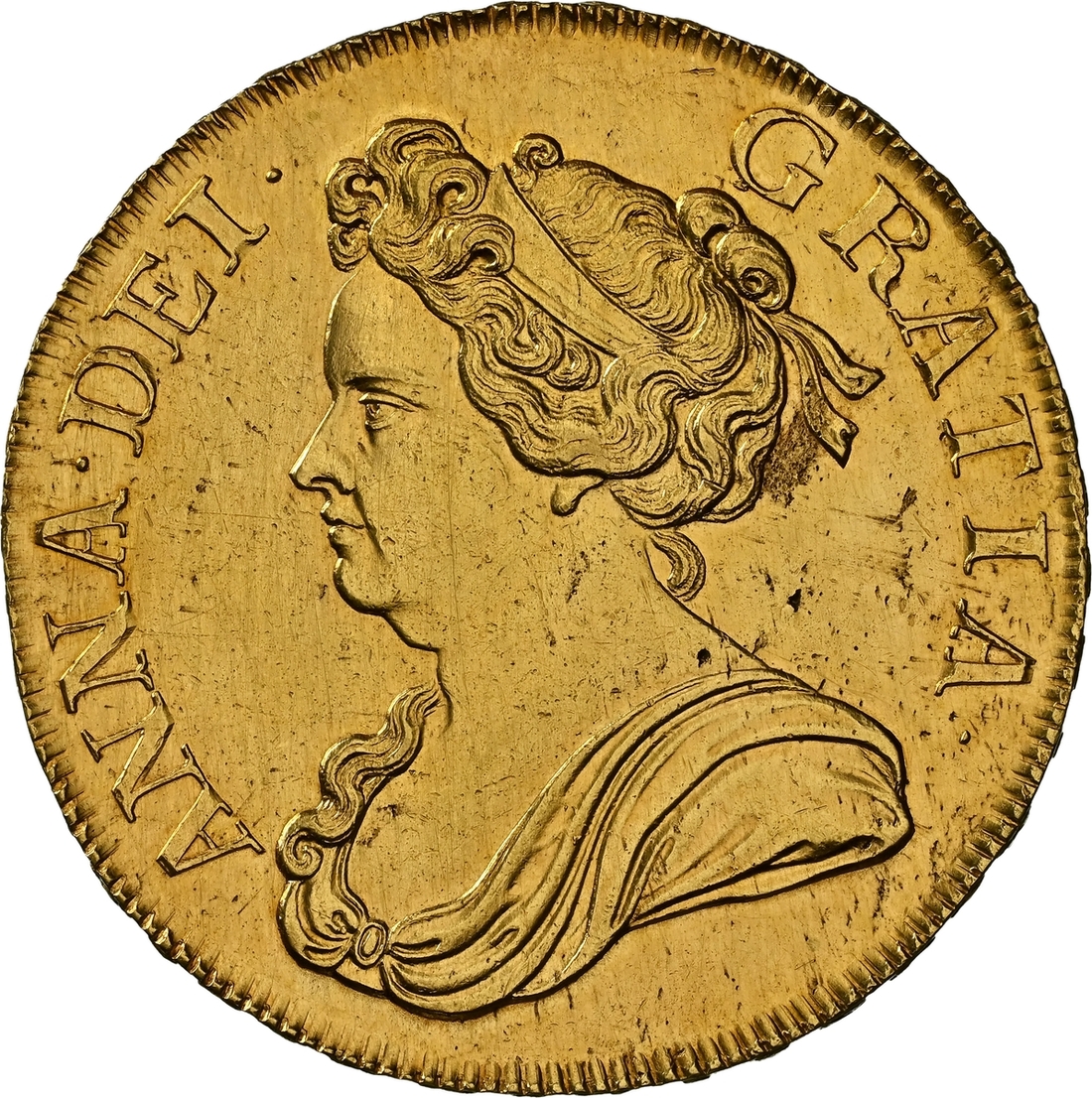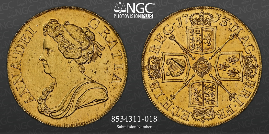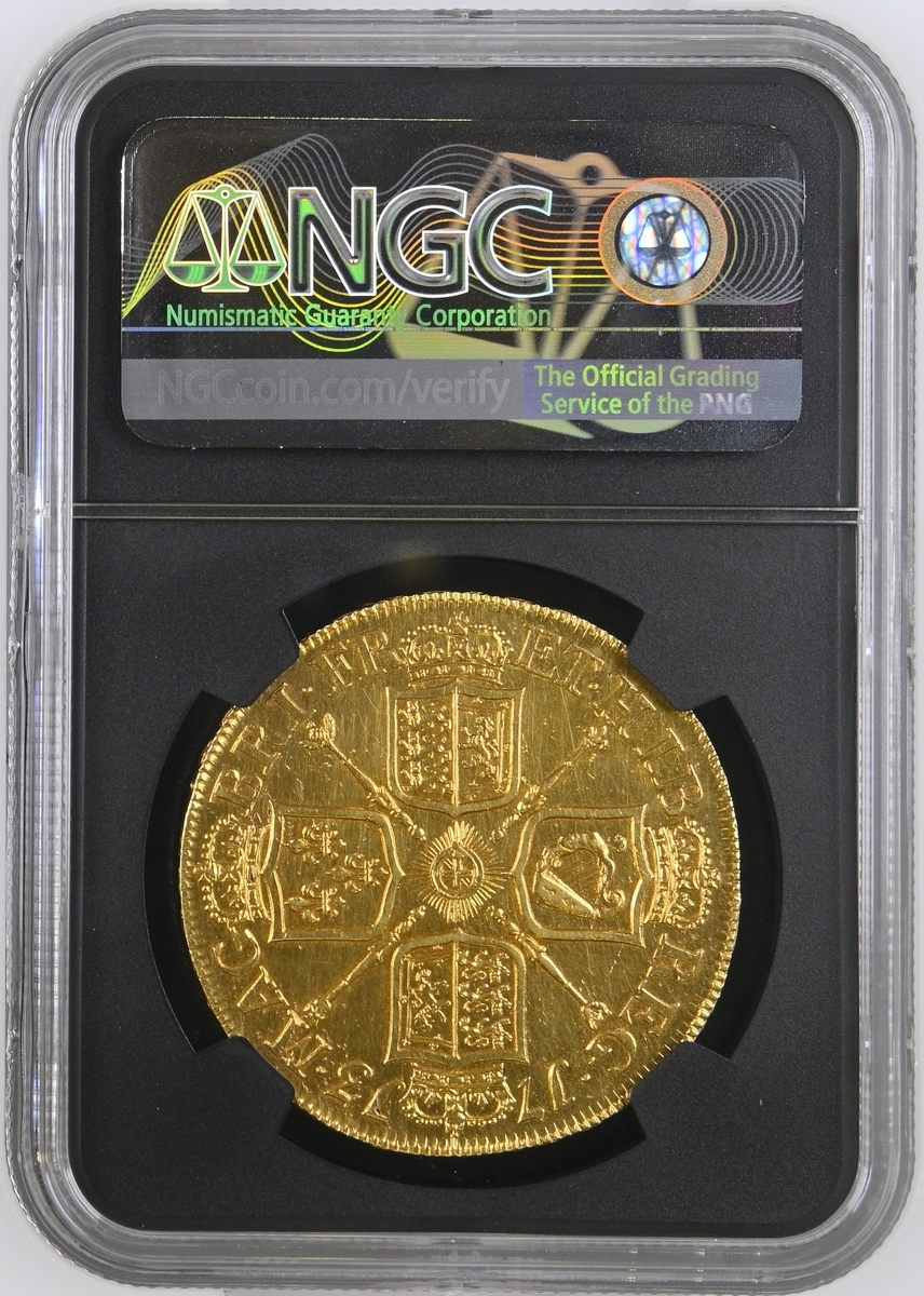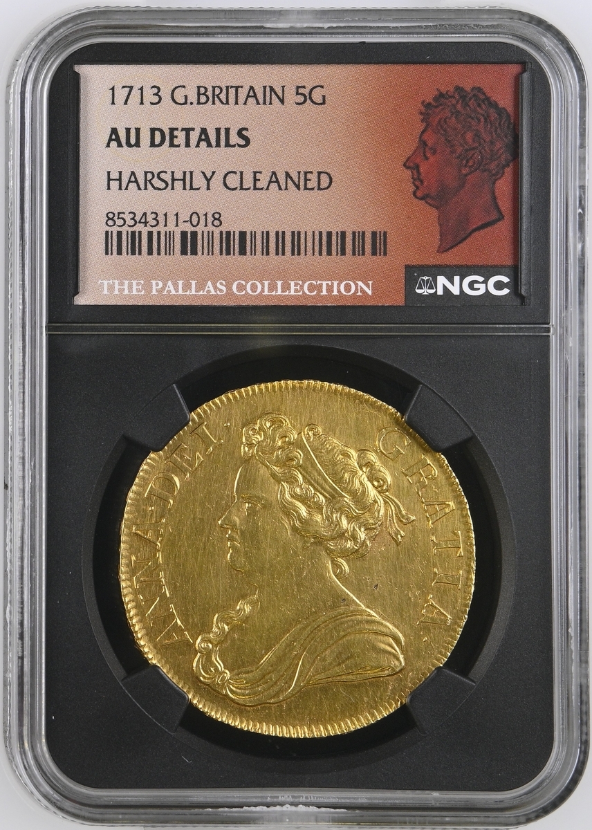 (x) NGC AU | Anne (1702-1714), Post-Union, Five-Guineas, 1713 DVODECIMO, 'J type 1' in date, second 'coarser' diademed and draped bust left, rev. crowned broader shields cruciform, emblem-adorned sceptres in angles, eight strings to harp, raised letters + • DECVS • ET • TVTAMEN • ANNO • REGNI • DVODECIMO [•] downwards on edge, 41.800g [645.07grns], 6h (Murdoch II, 839; Schneider II, 531/-; King 148; Stratos 195; MCE 203; EGC I, 452 [R2]; S.3568), lightly haymarked and wiped across otherwise lustrous fields, with hints of residual orange hue, a supremely crisp and uniform striking, a pleasingly bold extremely fine, truly rare in this exemplary state; the date scarcely encountered in commerce, in NGC Black 'Pallas' holder, fairly graded Almost Uncirculated ~ Harshly Cleaned (Cert. #8534311-018)